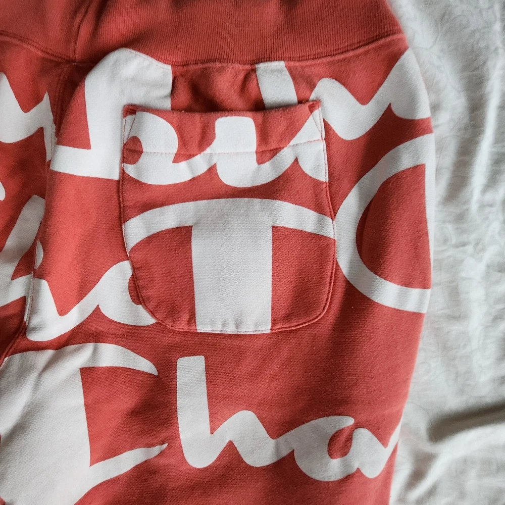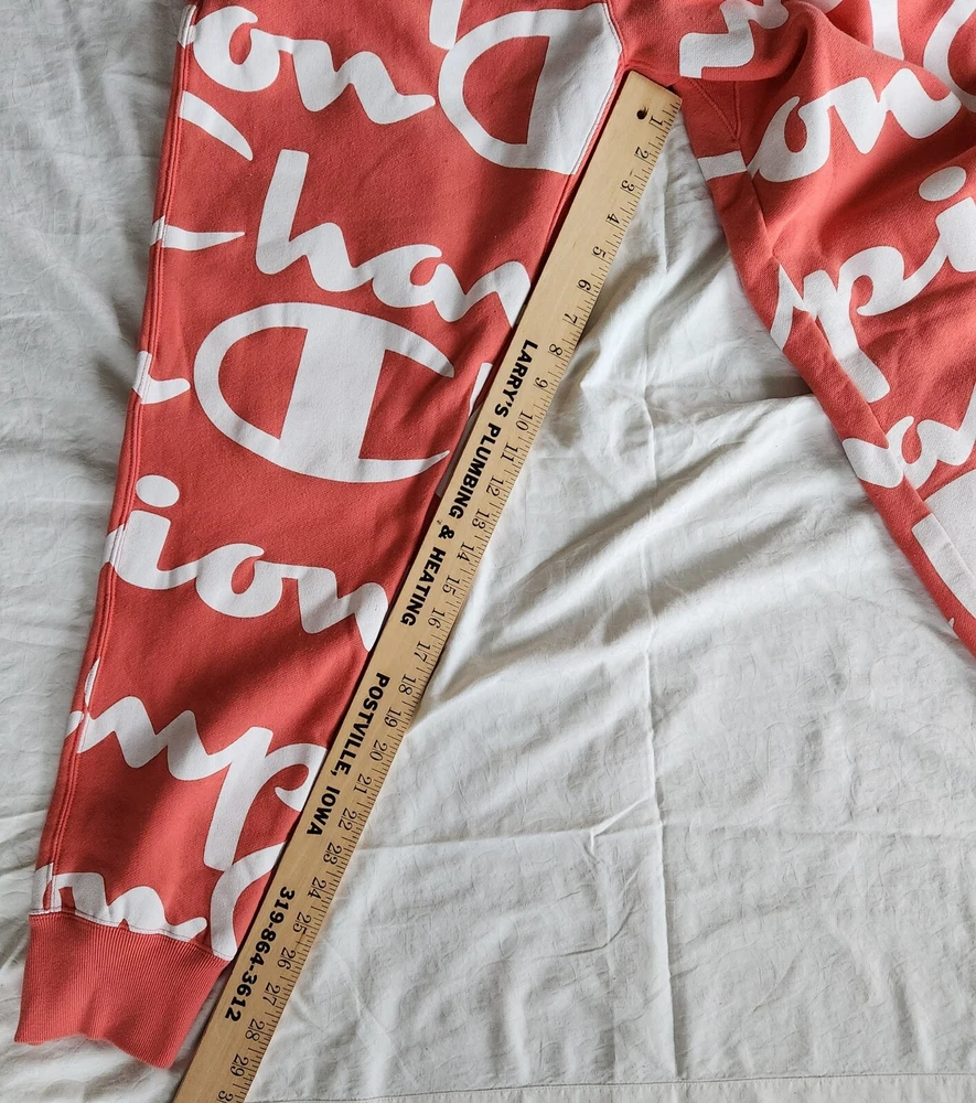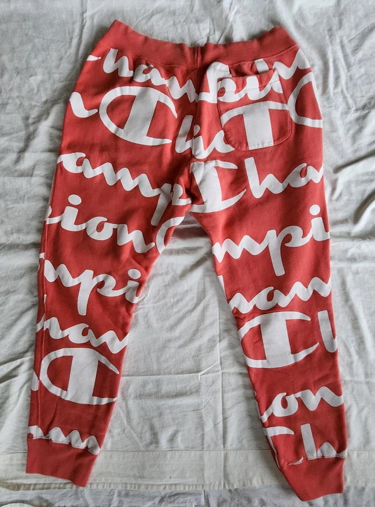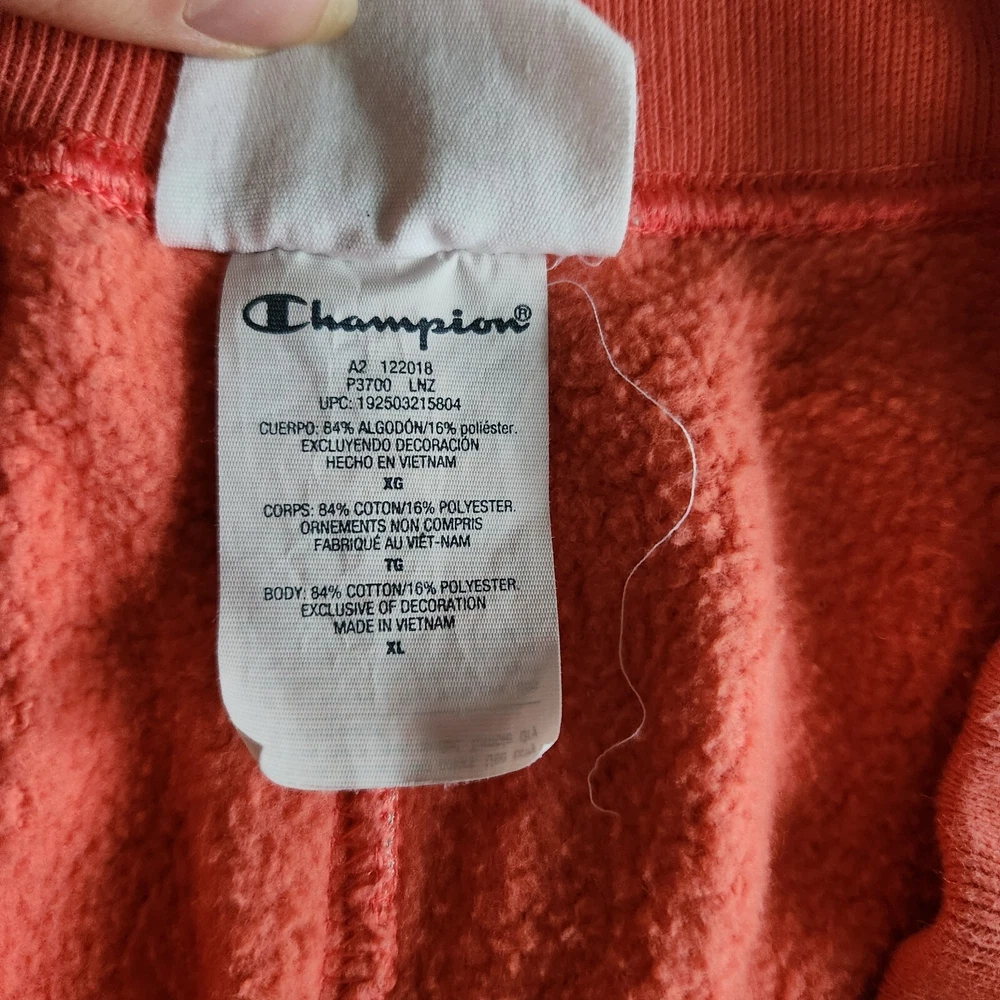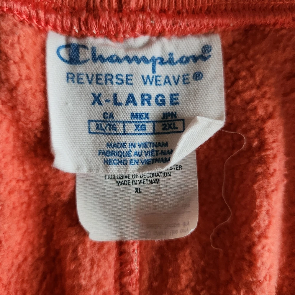 Elevate your activewear game with these Champion Reverse Weave sweatpants in orange and white. These pants are perfect for gym and training, walking, cross-training, and running and jogging. They feature an elastic waist with drawstring closure and inner draw cord adjusts the fit for maximum comfort. These sweatpants are made of a cotton blend fleece material, which makes them heavy and perfect for cold weather. They also have side seam pockets and a single patch pocket at the back, along with the Champion logo. These pants are easy to care for and are available in XL size with a regular fit. Add these stylish sweatpants to your activewear collection today!