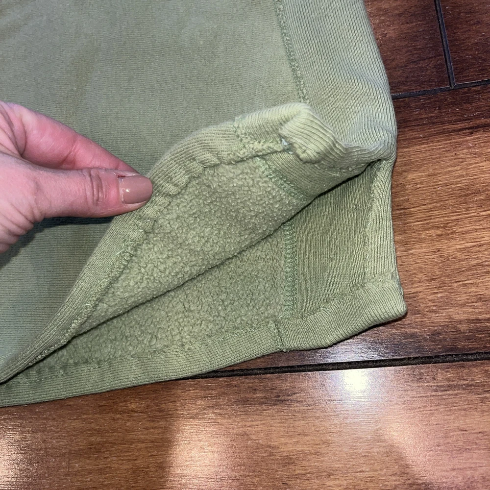 This is a women's casual Champion Reverse Weave sweatshirt in size large. It is a vintage piece made in the USA, featuring a reversible design in green color. The sweatshirt is part of the Champion Reverse Weave product line, perfect for activewear and showcasing a USA theme. This sweatshirt was cut on the bottom and sewn as shown in the picture. There was also a small stain on the right arm as shown in the picture. This is a vintage piece from the 80s.