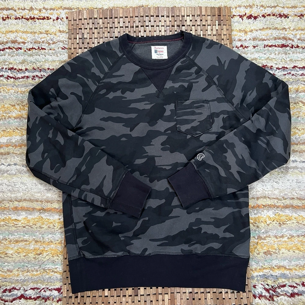 Elevate your activewear wardrobe with this Champion x Todd Snyder sweater. The black camo design is perfect for any sports enthusiast, and the long sleeves and crew neck make it suitable for all seasons. The sweatshirt features the Champion logo as an accent, adding a touch of style to your outfit. Crafted from comfortable cotton terry fabric, this regular-fit sweatshirt is perfect for a day out or a casual evening at home. It comes with pockets for convenience and is available in size L. Ideal for winter, fall, and spring, this Champion x Todd Snyder sweater is a must-have addition to your wardrobe.