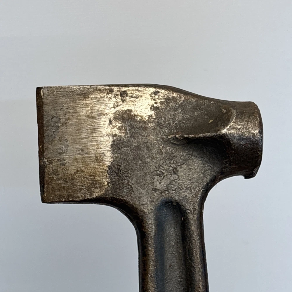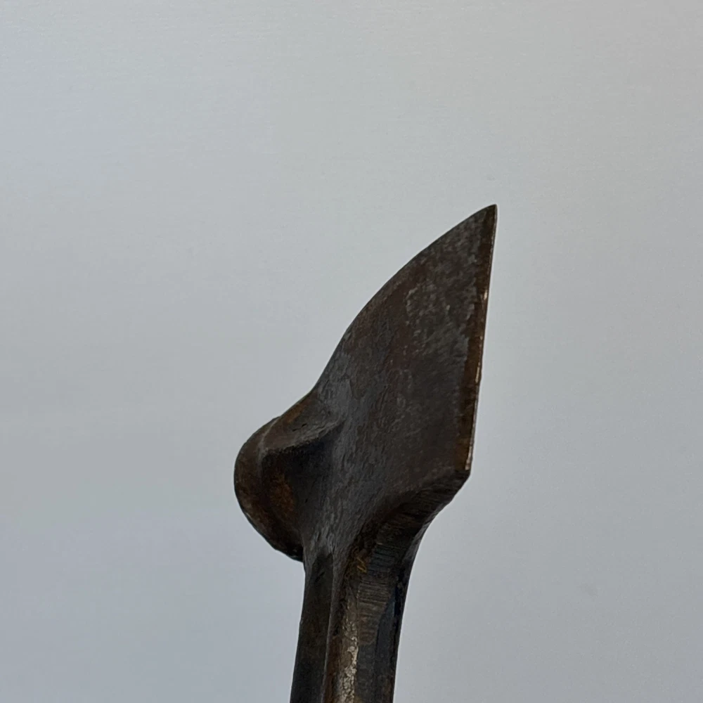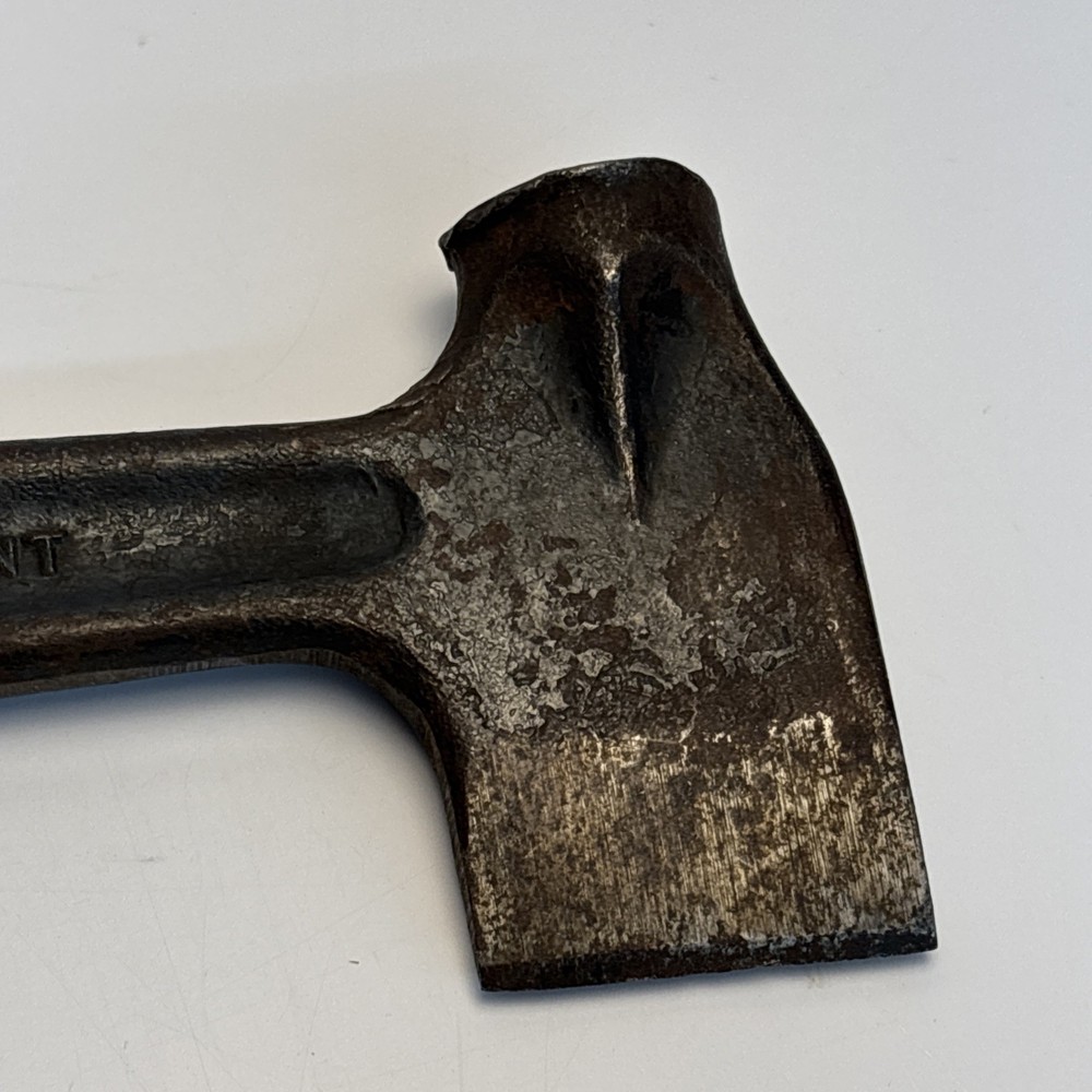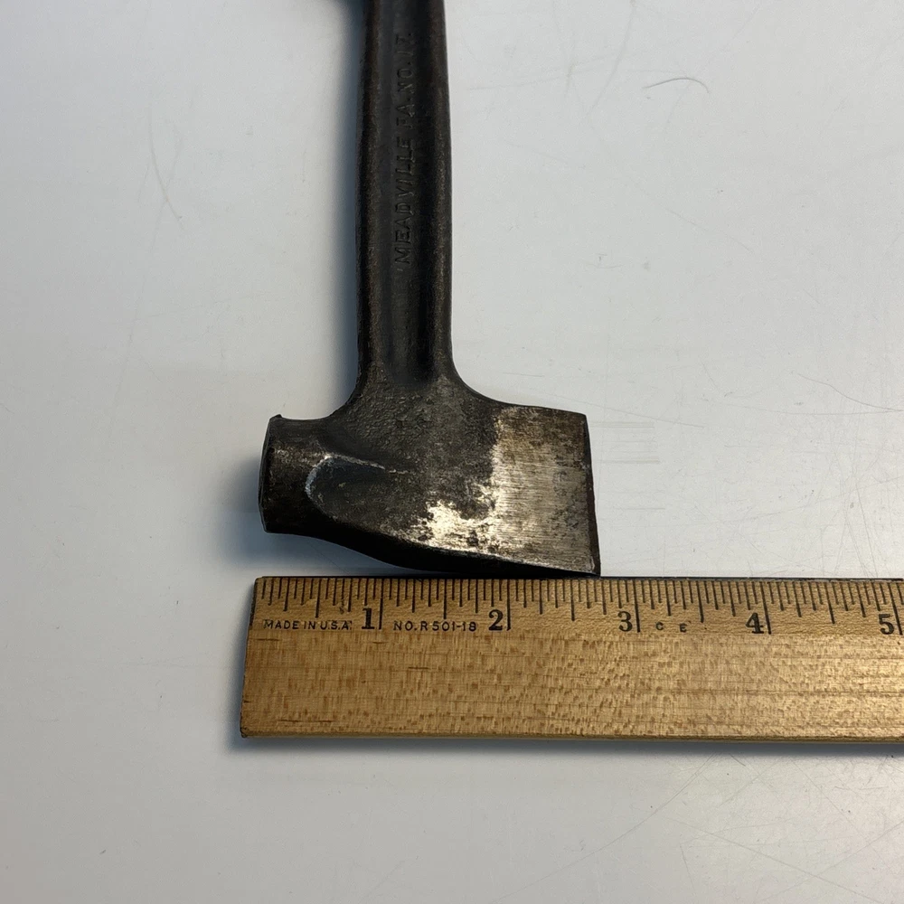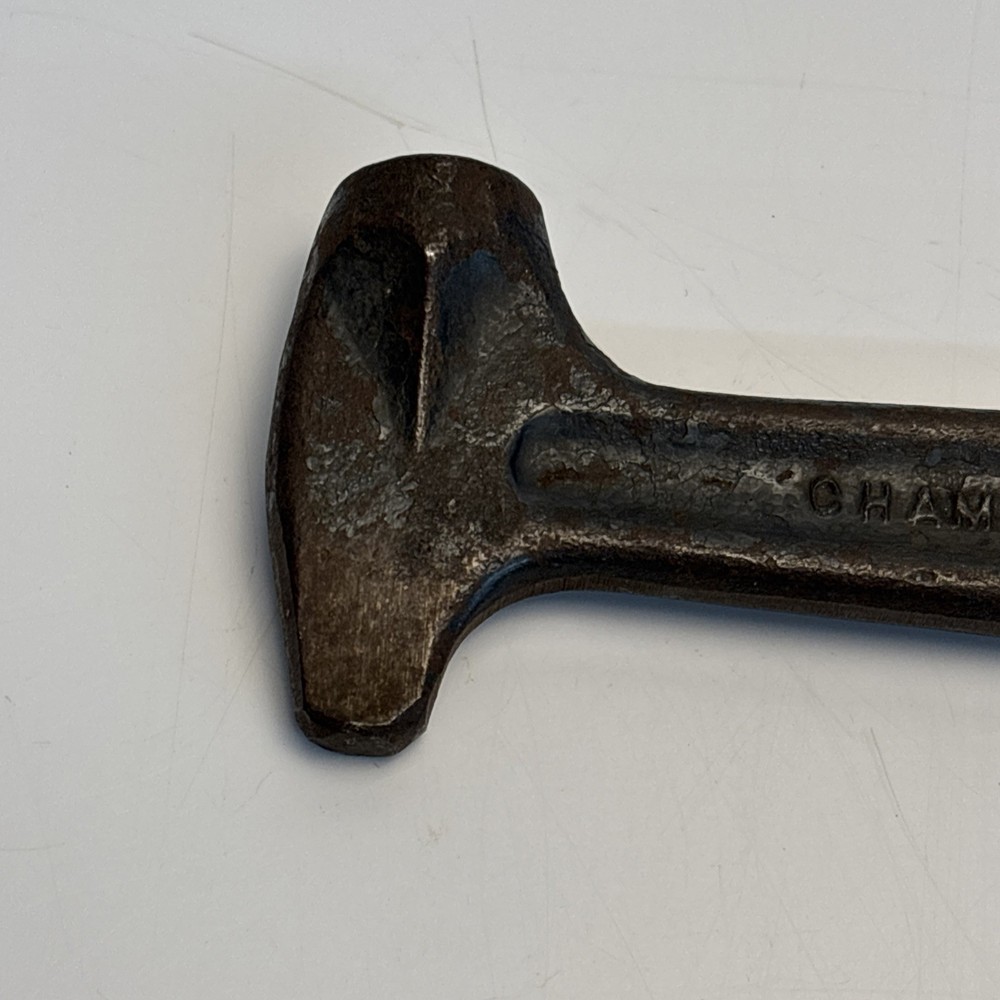 Vintage Champion-DeArment No. 17 combination crate and nail clinching tool made in Meadville, Pennsylvania, USA. One-piece forged steel construction with integral handle between both working ends. One end features an approximately 1½ inch wide chisel/axe-style cutting blade with opposing hammer face. The opposite end includes a larger hammer face with a smaller opposing striking surface. Designed for crate opening, nail driving, and nail clinching in warehouse and packing applications. Clearly marked “Champion-DeArment” and “No. 17.” See photos for full details and measurements. Condition Used vintage condition with surface rust, oxidation, and wear from age and use. Cutting edge shows wear but no cracks observed. Hammer faces show typical striking marks. Structurally solid. See photos for complete condition details.