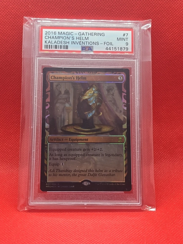 Elevate your Magic: The Gathering collection with the Champion's Helm from the Masterpiece Series: Kaladesh Inventions. This rare, mythic rarity card is a treasure for players and collectors alike, featuring a stunning foil finish that makes it stand out in any deck or display. With card number 7, this artifact Equipment card is a strategic addition to your game, allowing you to enhance your Champion's abilities. Manufactured by Wizards of the Coast, the card comes in English language and boasts a pristine PSA 9 rating, ensuring its quality and value. The colorless cost of 3 makes it a versatile choice for a variety of deck builds. Add the Champion's Helm to your arsenal and gain an edge in your next MTG battle.