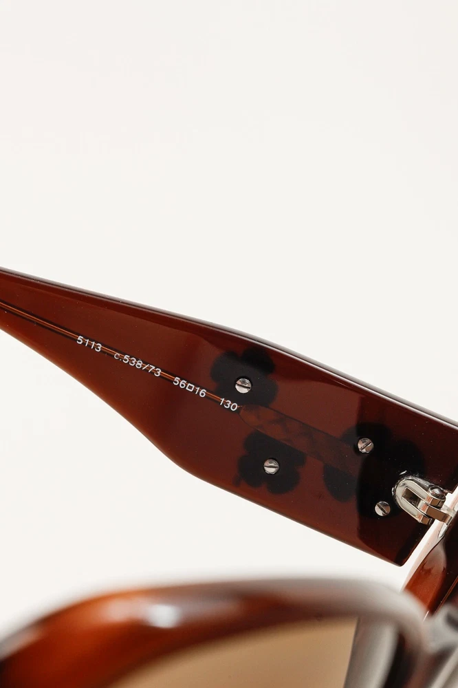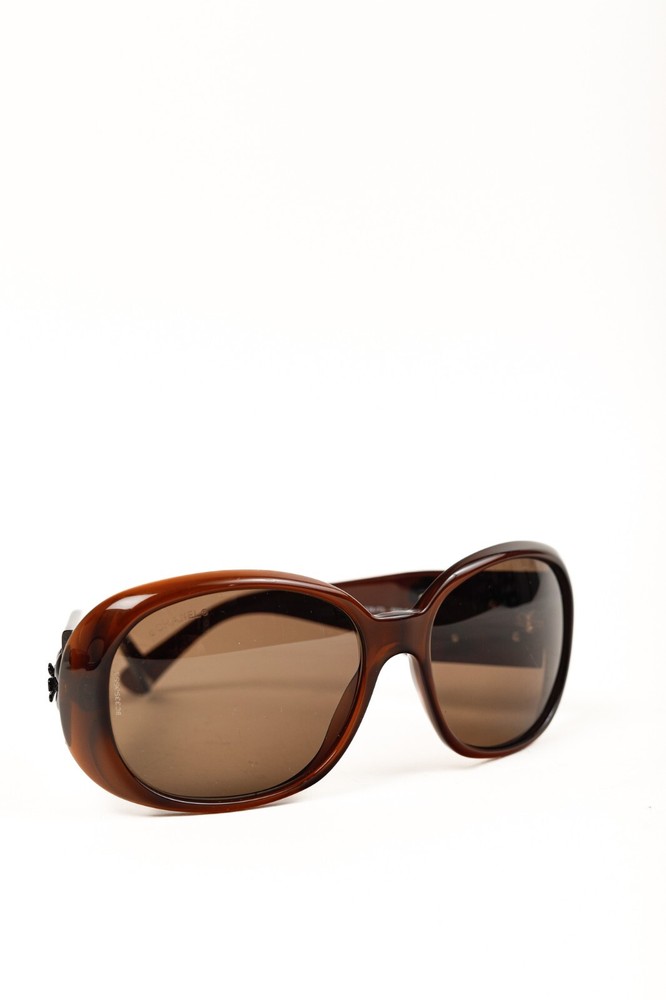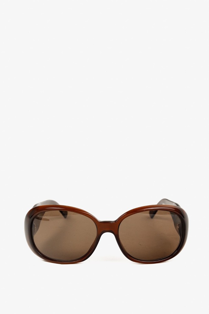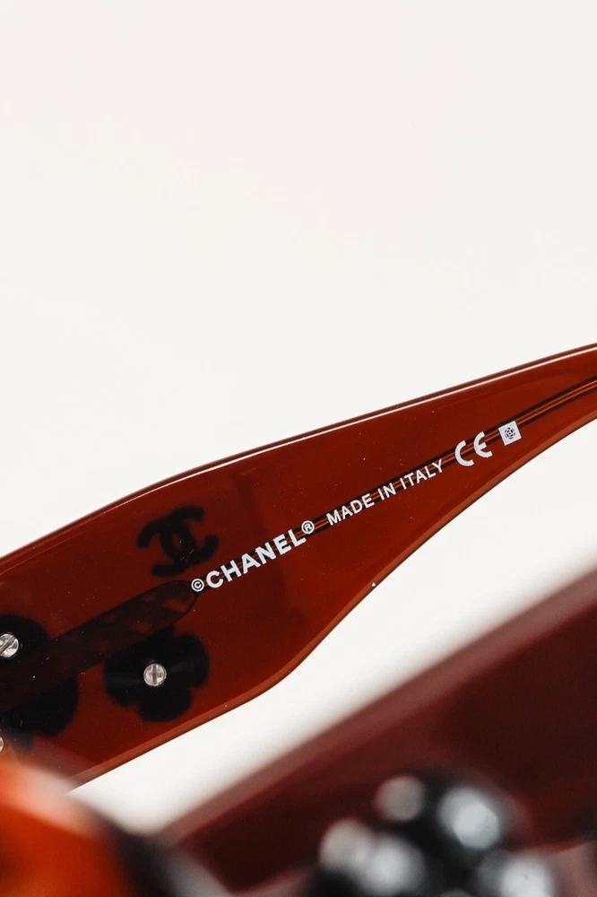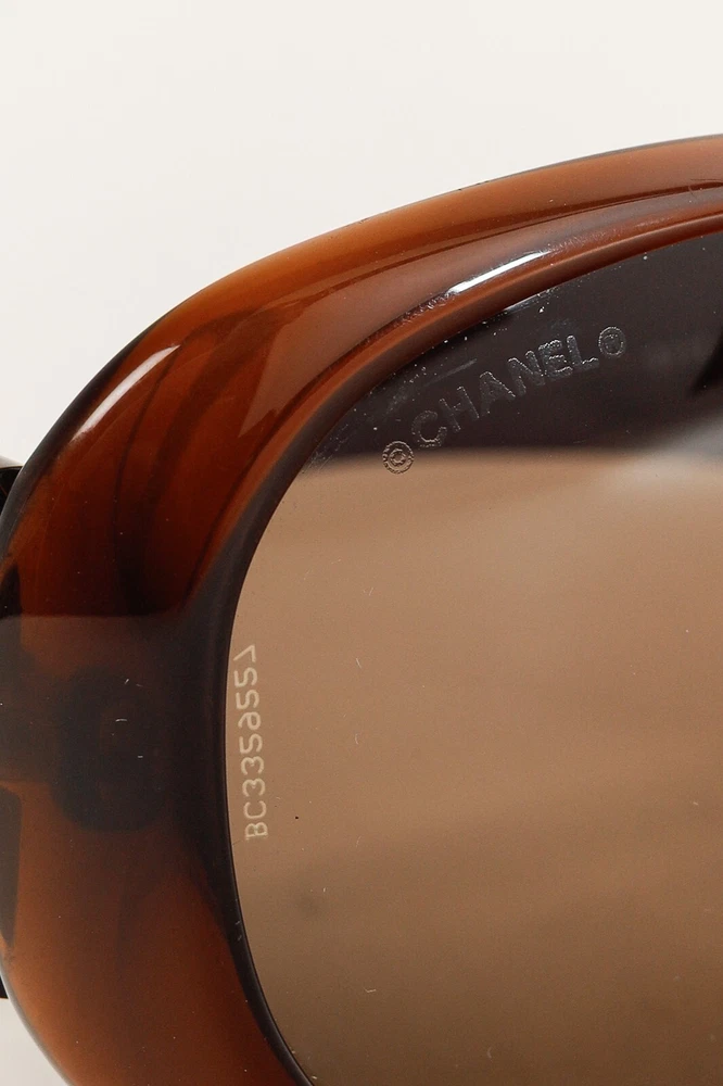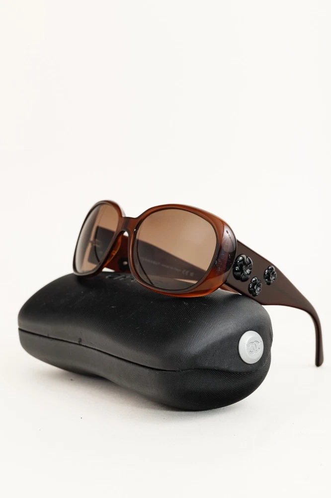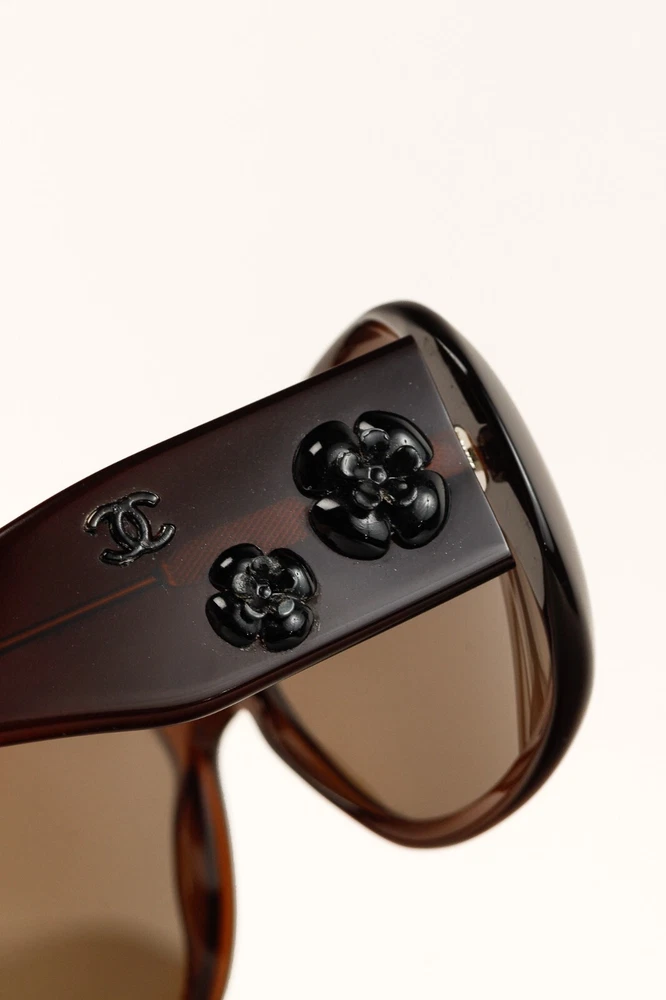 Made in Italy, these sunglasses from Chanel are crafted in a brown acetate, and feature oversized frames, brown tinted lenses, inset nose pads, and Camellia detailing on the temples. Condition: Excellent; very light rubbing on inner arms. Comes with case. Approximate Measurements: Height: 2” (5 cm) Width: 5.25” (13 cm) Arm Length: 4.75” (12 cm) Composition: Acetate.
