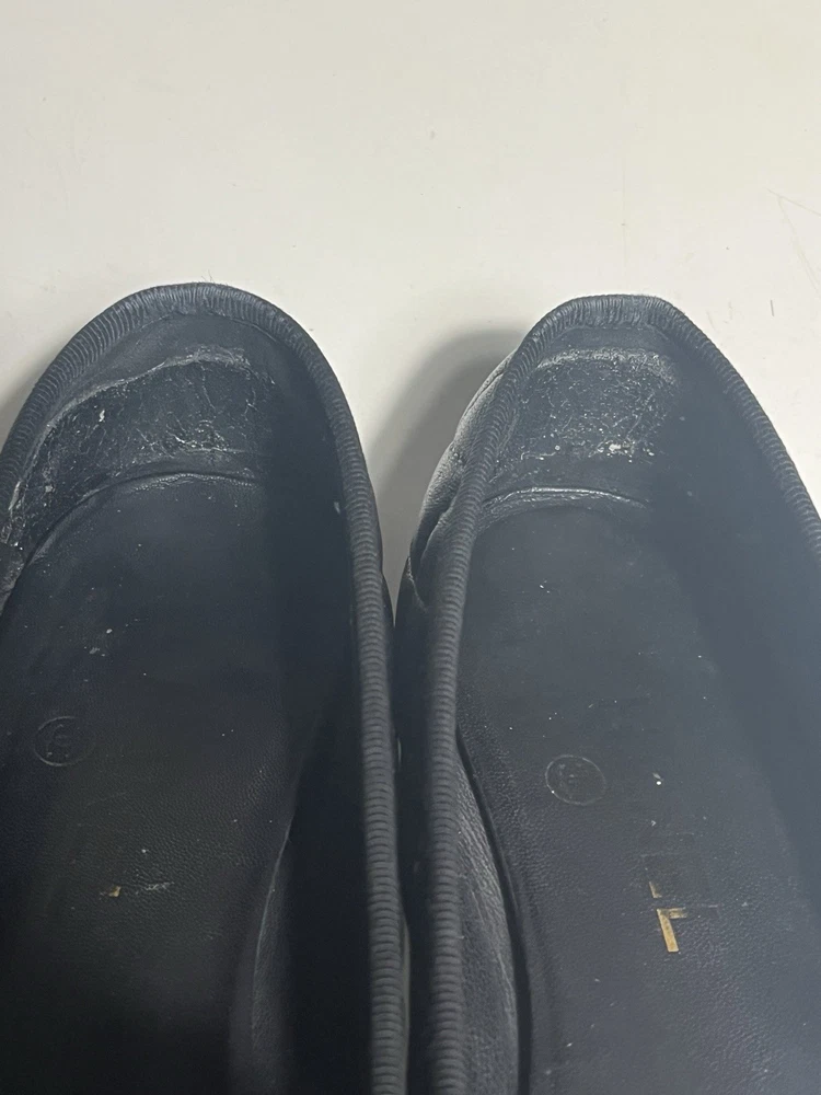 Soft lambskin. Size 39. The color is very dark navy. Almost like black. Probably will look like black if you do not compare them right next to black shoes. Authentic. Only shoes. Ship same or next day.