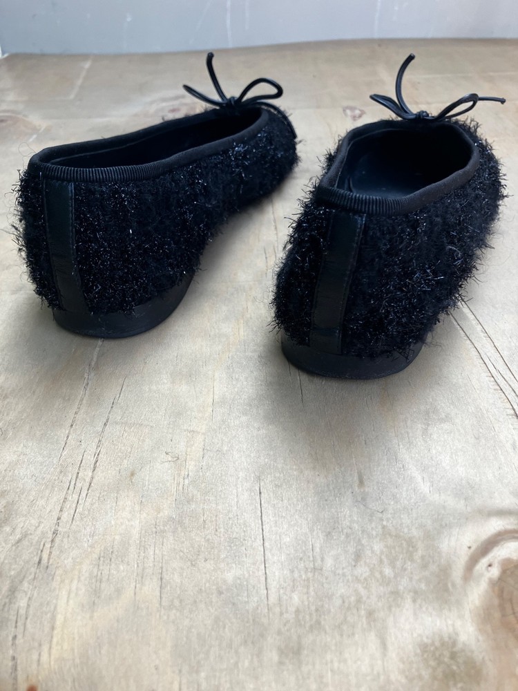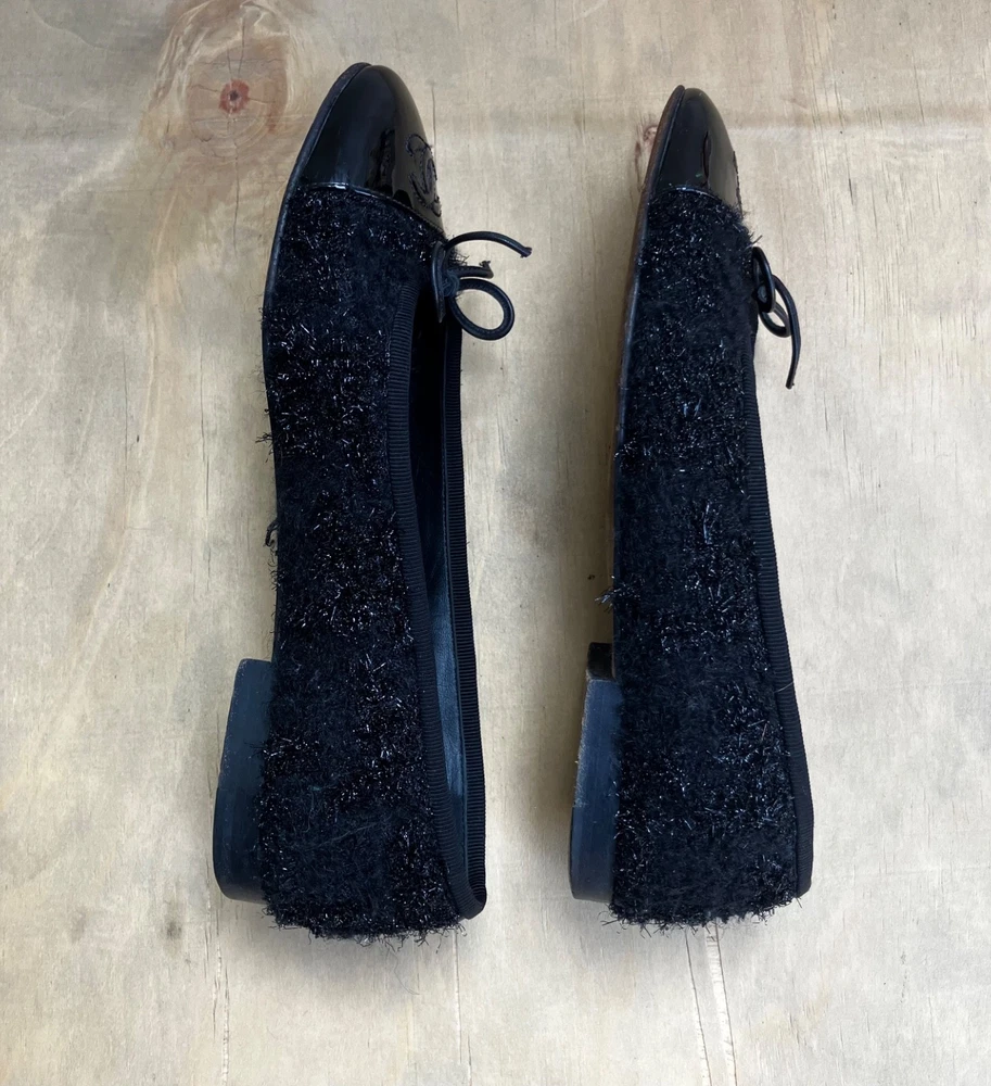 The Chanel Black Tweed ballerina flats in size 36 are a stylish and versatile option for women. Featuring a round toe shape, slip-on closure, and made from leather with a tweed fabric type, these flats are perfect for casual occasions in the summer and spring seasons. The black color and cap toe accents add a touch of sophistication to the ballet-style design. Made in Italy, these lightweight and comfortable flats offer a chic and breathable option for women looking to elevate their shoe collection with a designer touch from Chanel.
