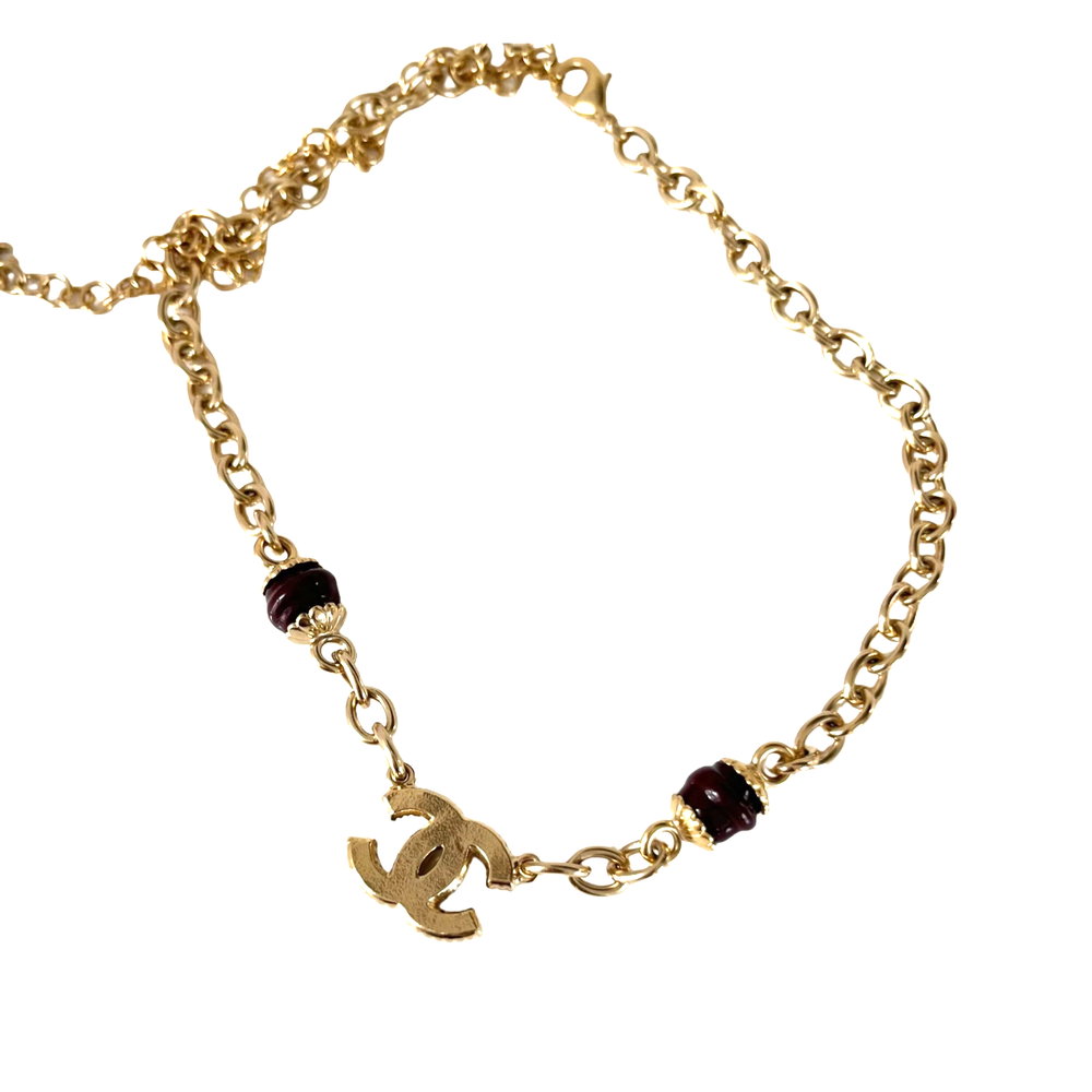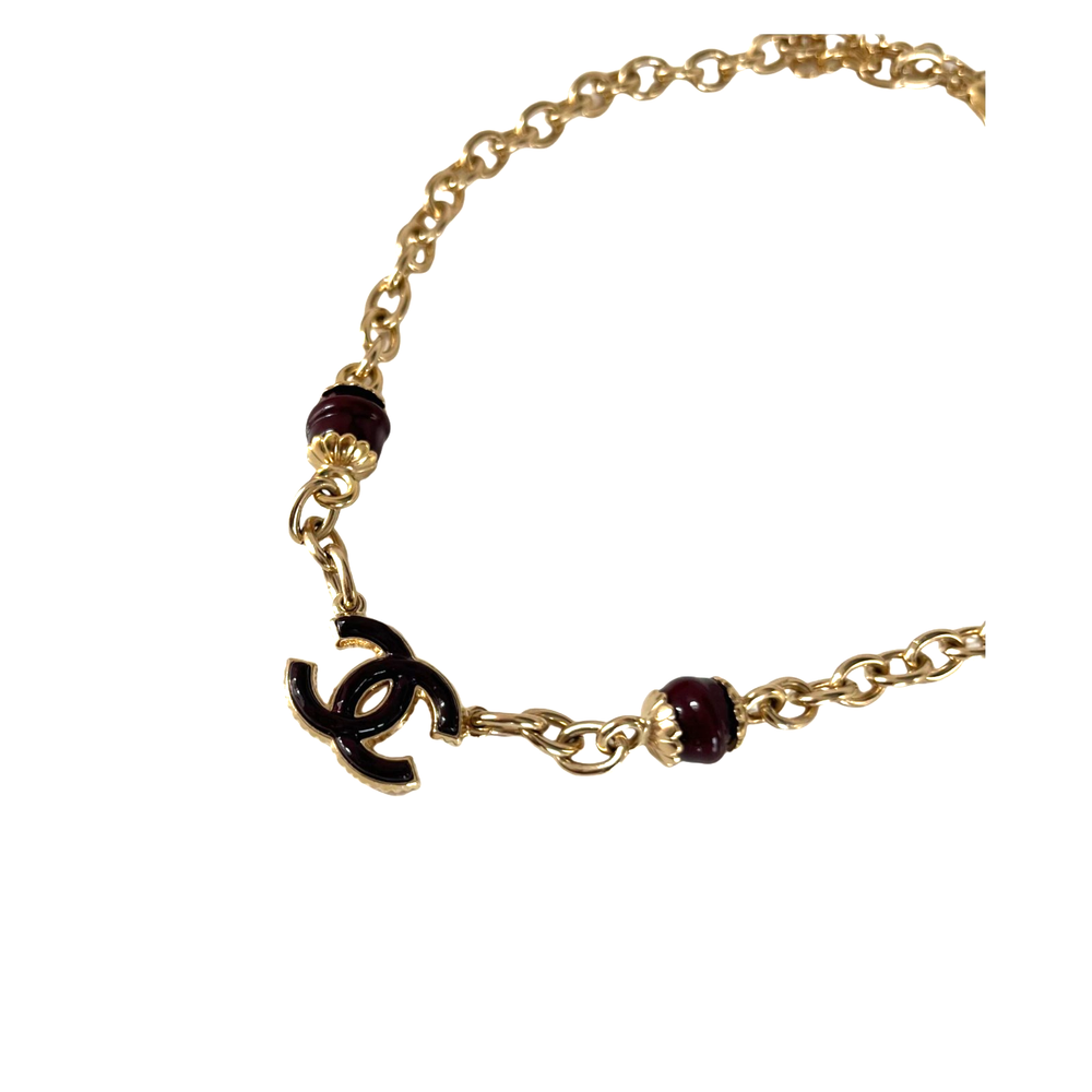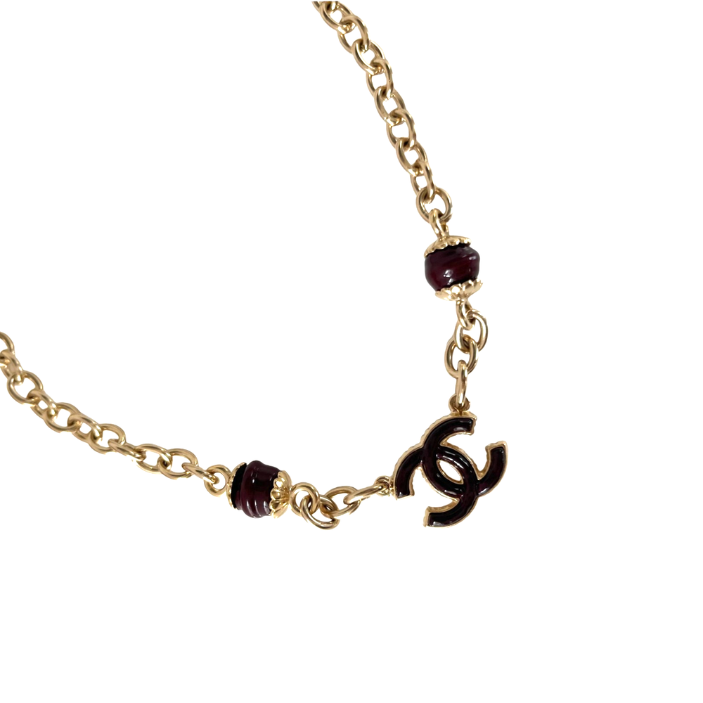 Chanel Maroon CC Beaded Chain Choker Necklace Attributes Material : Metal Color : Gold Tone Condition Desc. : Very good