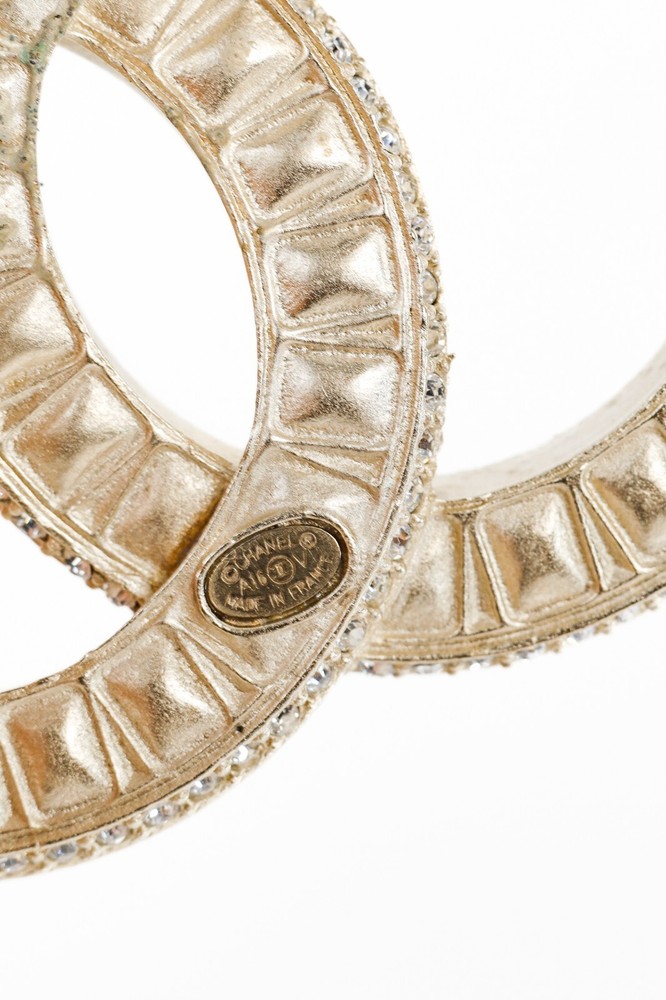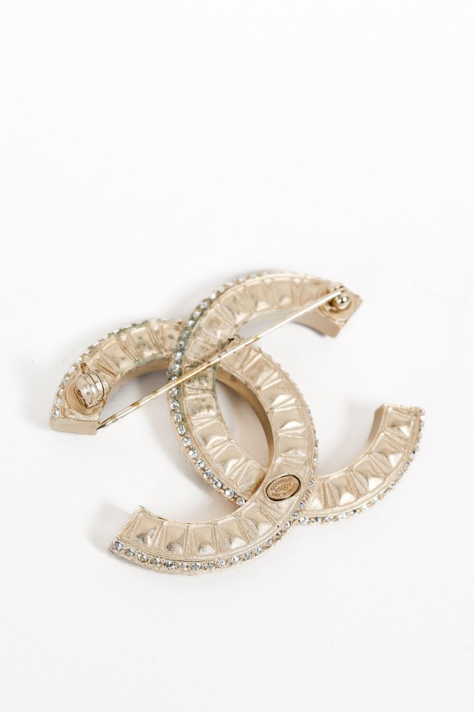 This stunning Chanel Baguette Cut Rhinestone CC Logo Brooch is exquisitely made with light gold-tone metal and baguette-shaped rhinestones. It features two rows of rhinestone trim, adding a touch of elegance and luxury to any outfit. Condition: Excellent; no signs of wear; includes product booklet, storage pouch, box Approximate measurements: Length: 2" (5 cm) Height: 1.5" (4 cm) Composition: metal, rhinestones