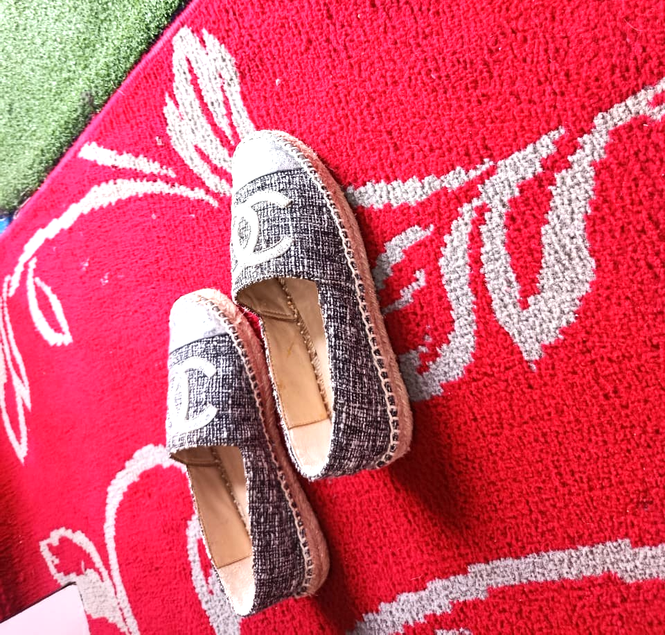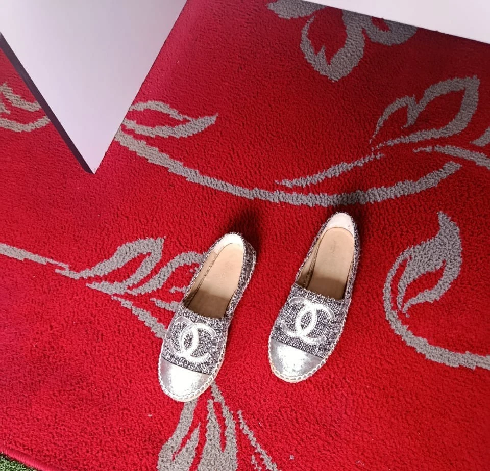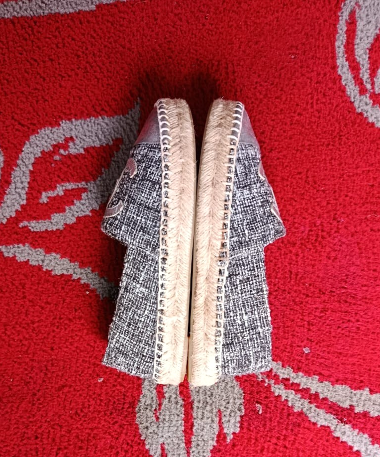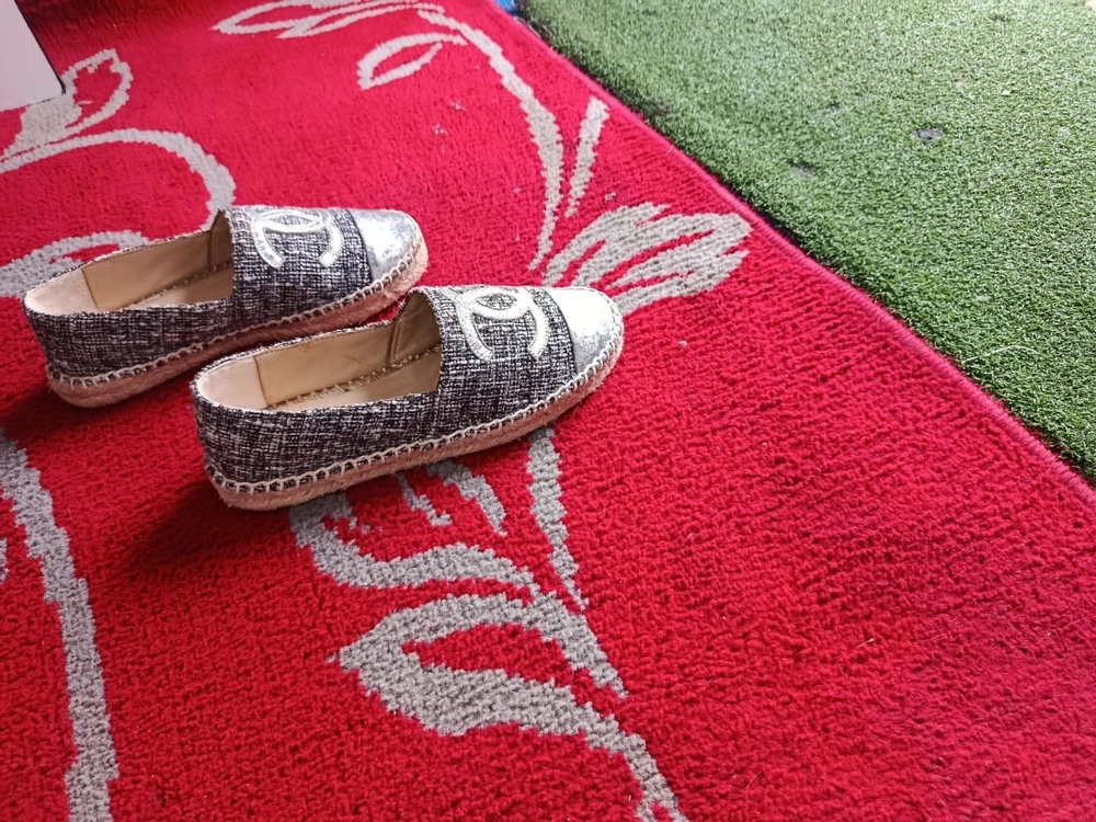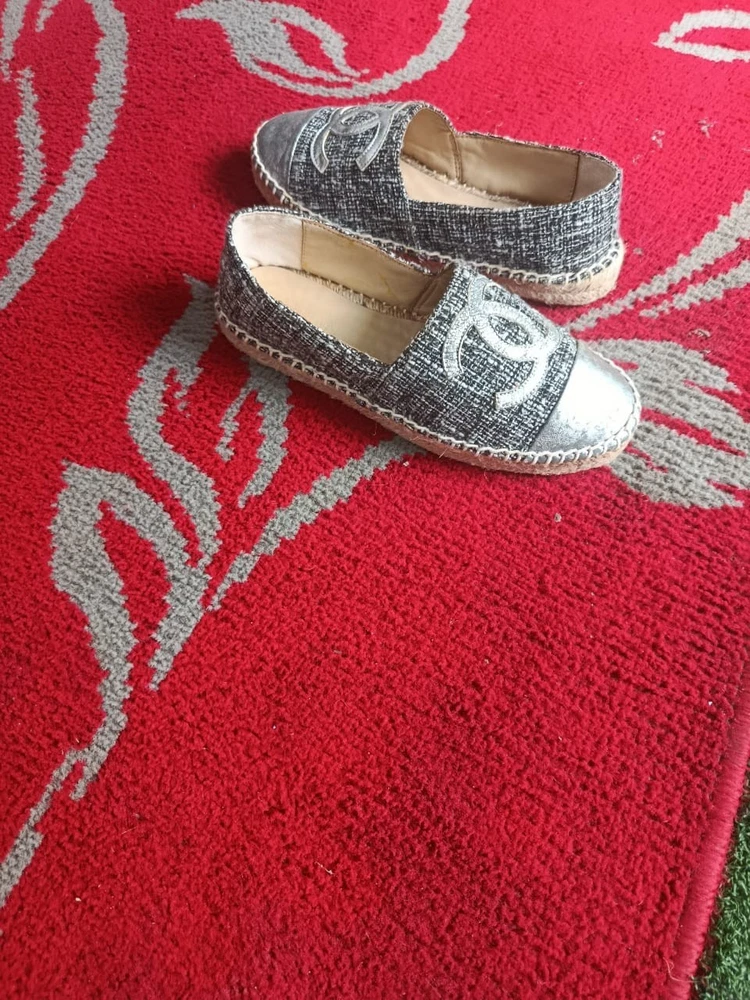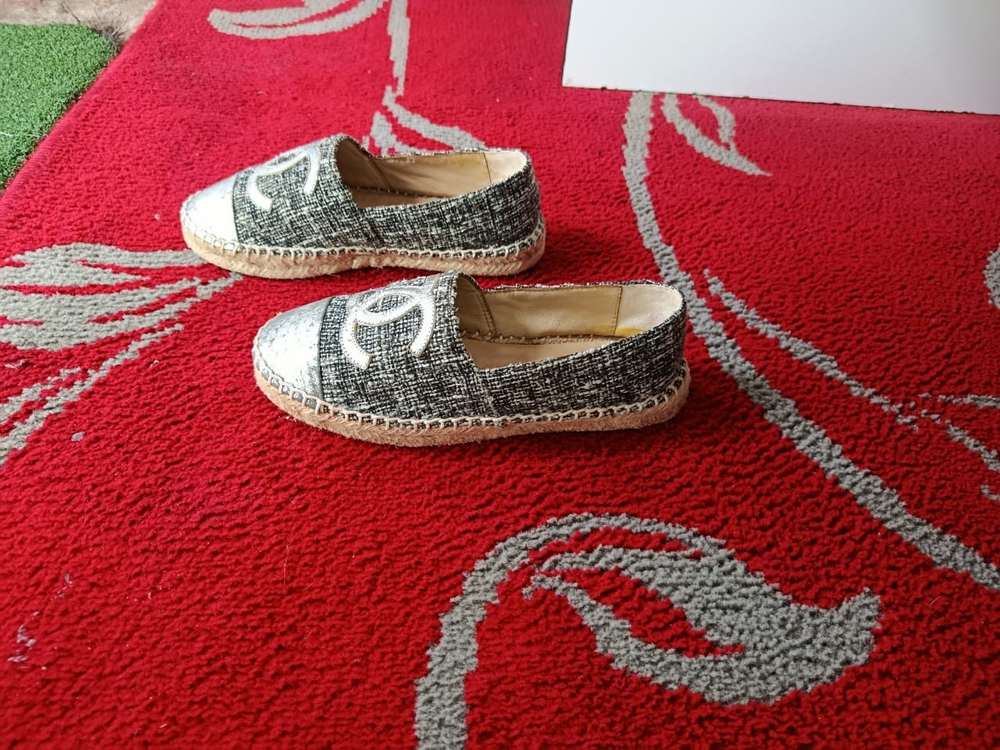 The Chanel Metallic Silver Espadrilles are a stylish and versatile choice for any woman's wardrobe. Made in Spain with authentic tweed fabric and a round toe shape, these slip-on flats feature the iconic Chanel logo accent. Perfect for a summer picnic, casual outing, or even a business meeting, these comfortable shoes are a timeless addition to any wardrobe. The shoe width is standard, and the outsole is made of rubber for added durability. Upgrade your shoe collection with these chic and iconic Chanel espadrilles.