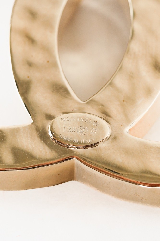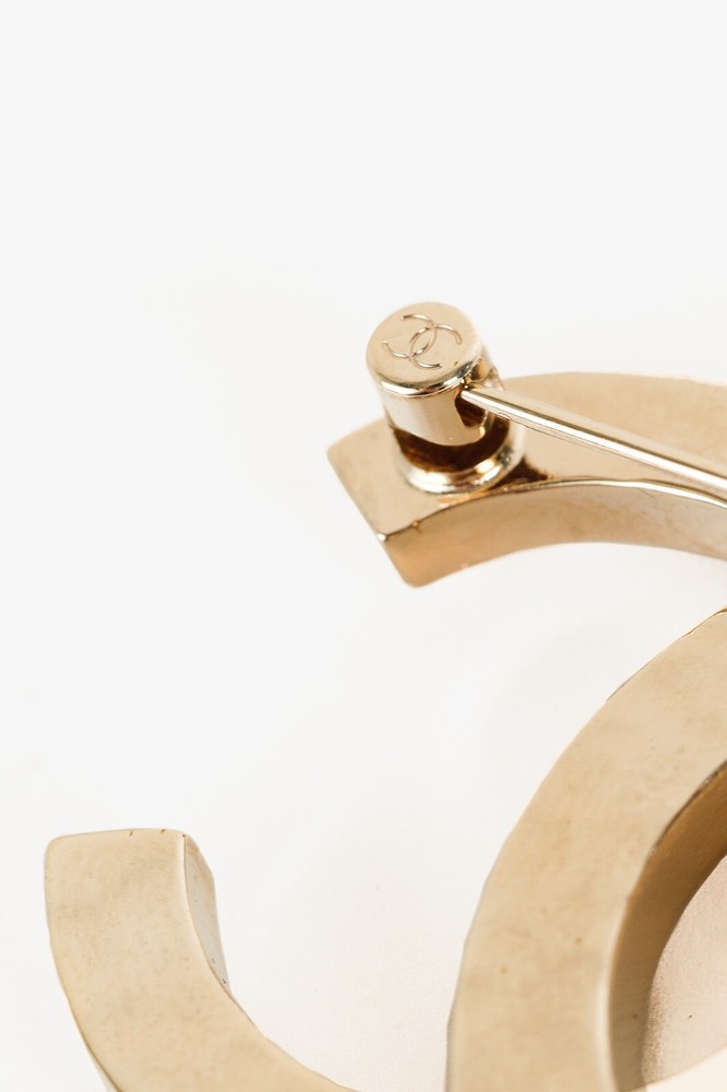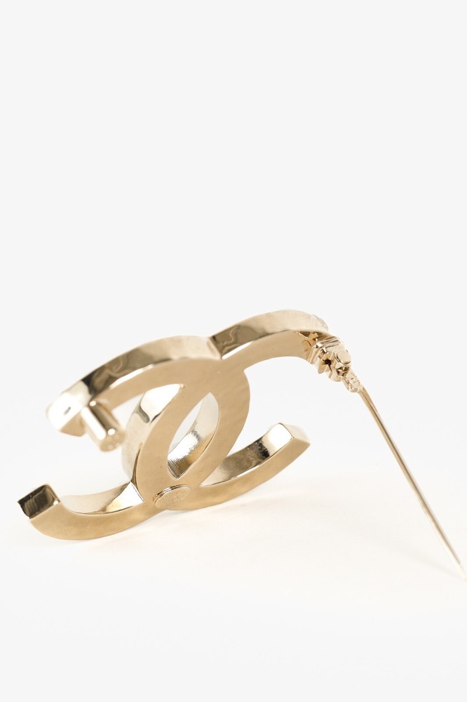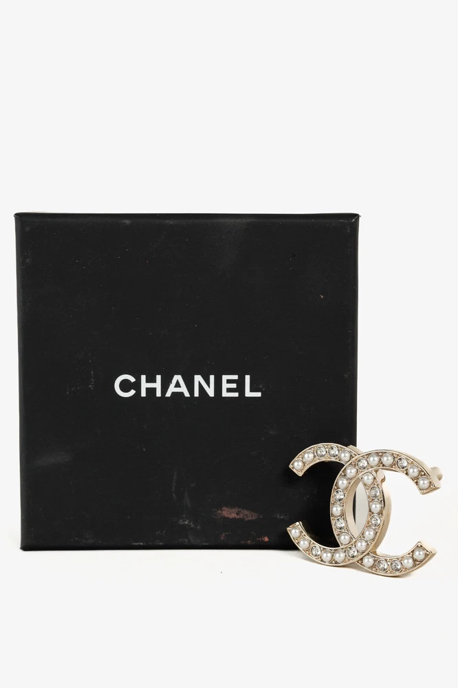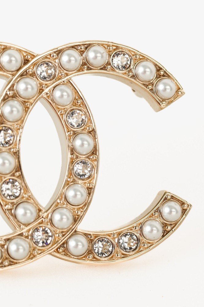 This Chanel Gold-Toned Brooch features the iconic interlocking CC logo in a luxurious gold-tone. Adorned with delicate pearls and sparkling crystals, this brooch is an elegant and timeless accessory. Condition: Excellent; very little signs of wear; includes box with Camellia Approximate measurements: Length: 1.75" (4.5 cm) Width: 1.75" (4.5 cm) Composition: metal, faux pearls, faux gemstones