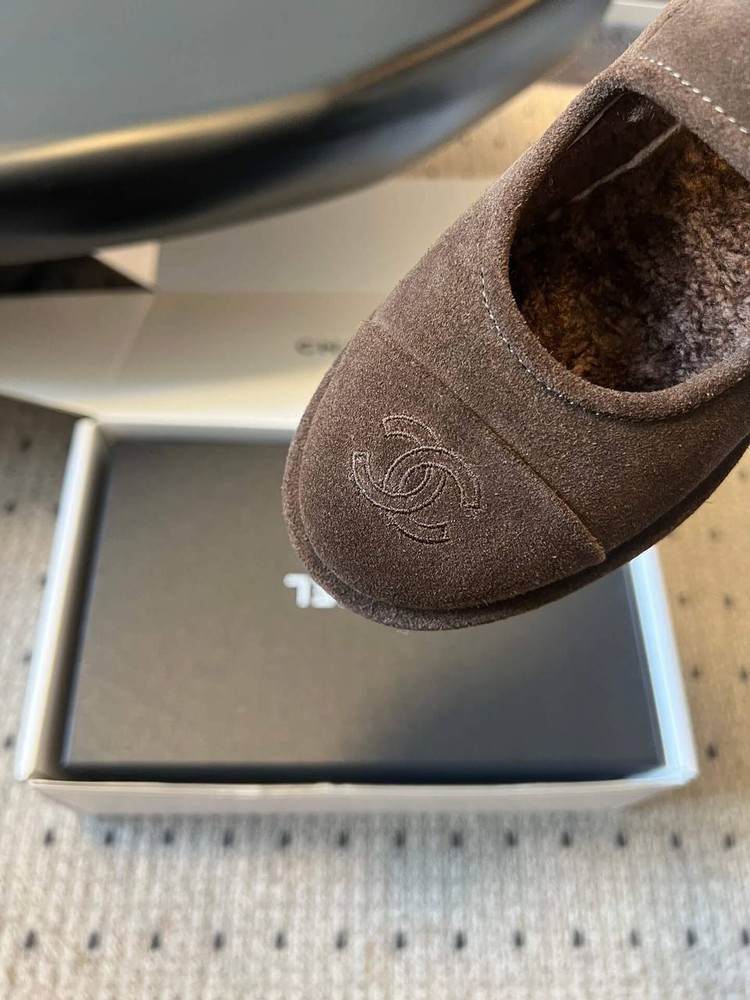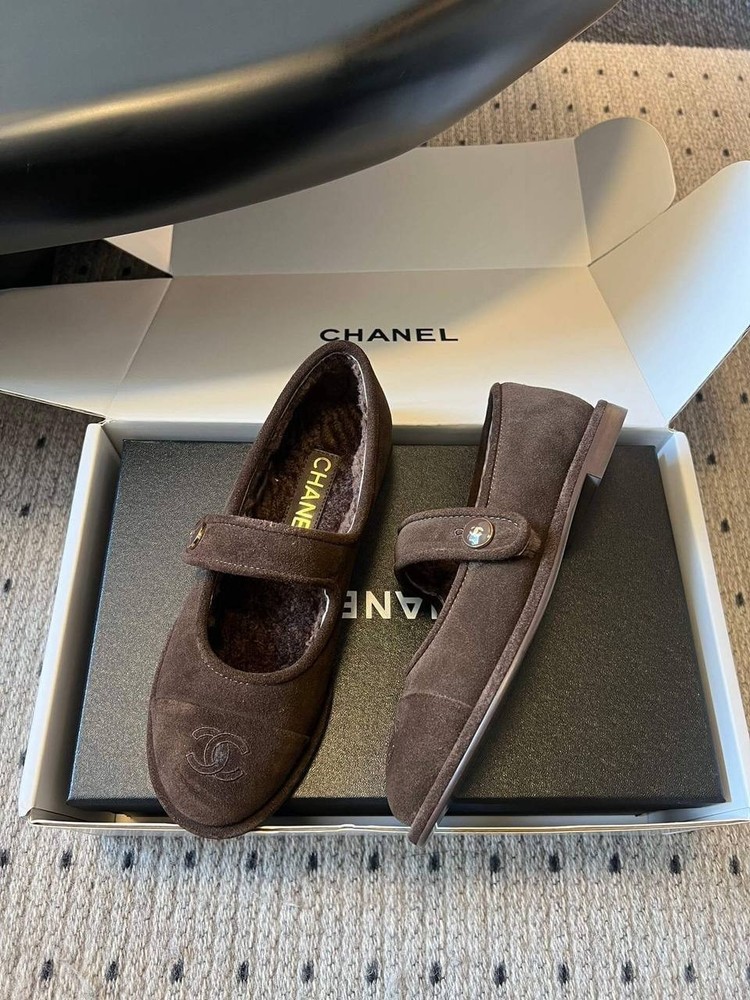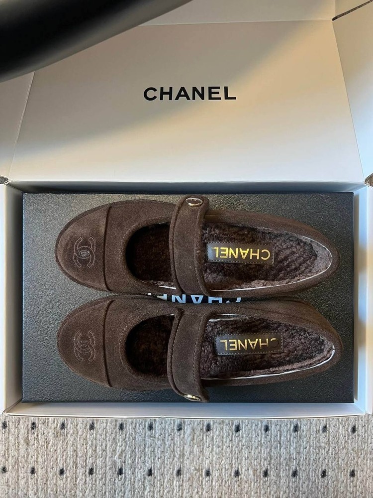 The product is a pair of Chanel Mary Jane flats in brown suede with a shearling lining, designed for women in size 38 EU. These slip-on flats feature a round toe shape, logo accents, and a leather outsole, making them stylish and elegant. The shearling fabric adds a touch of luxury, while the suede upper material and sheepskin lining ensure comfort and warmth. Perfect for adding a chic touch to any outfit, these Chanel flats are a must-have for any fashion-conscious woman.