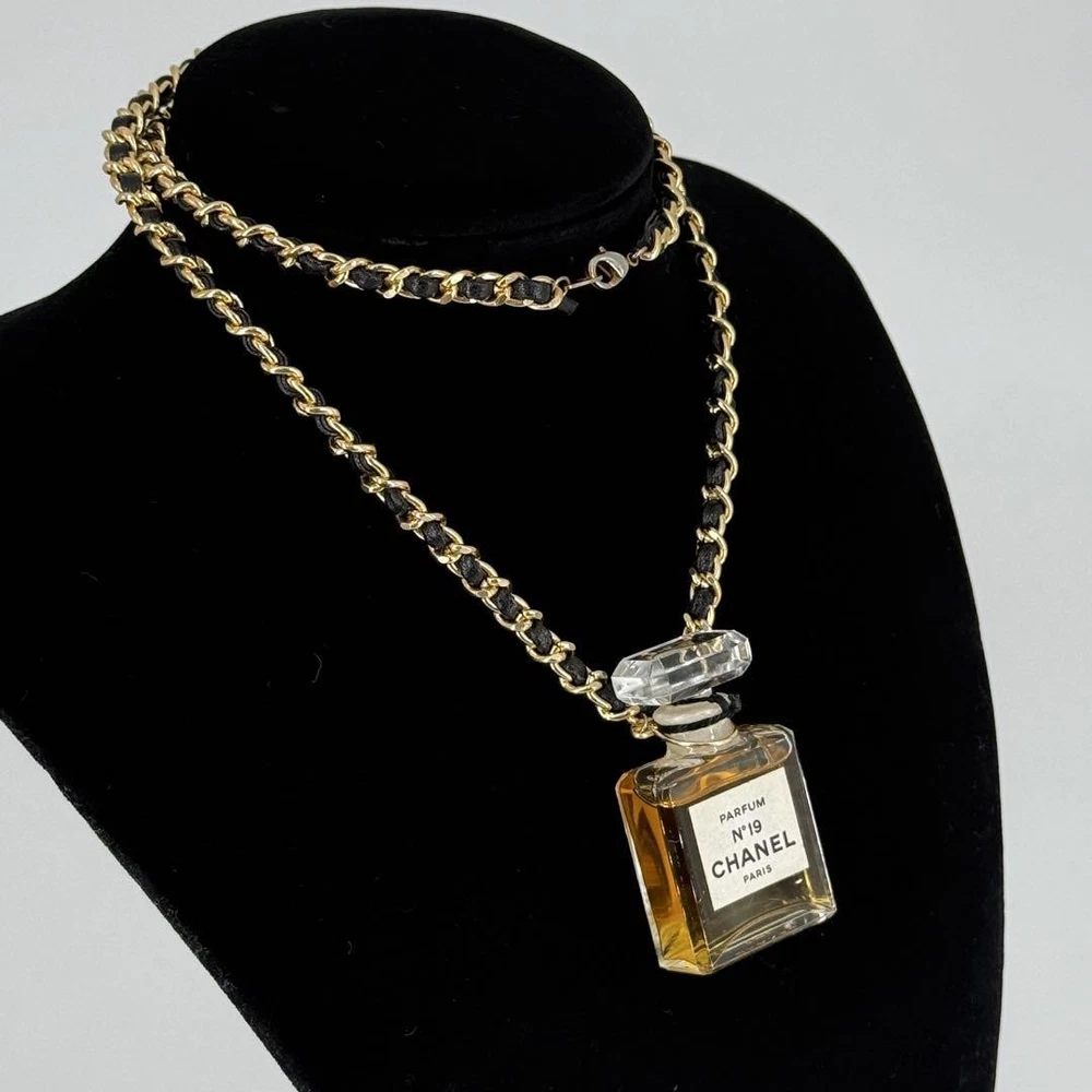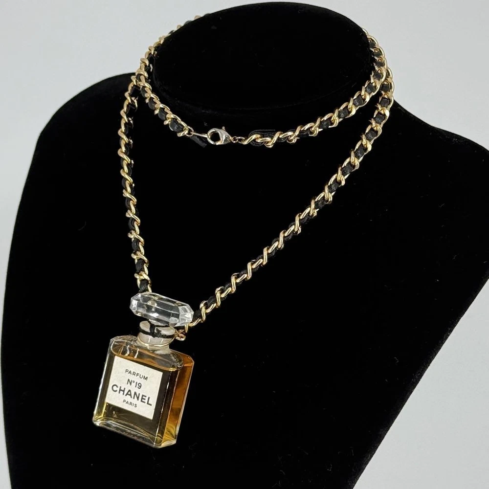This vintage Chanel N19 perfume necklace is absolutely stunning! The black and gold design is timeless, and the leather chain adds a luxurious touch. At 65cm, it hangs perfectly for a chic statement. The pendant has a gorgeous vintage charm, and while it's slightly used, the condition is still excellent. A must-have for any Chanel collector!
