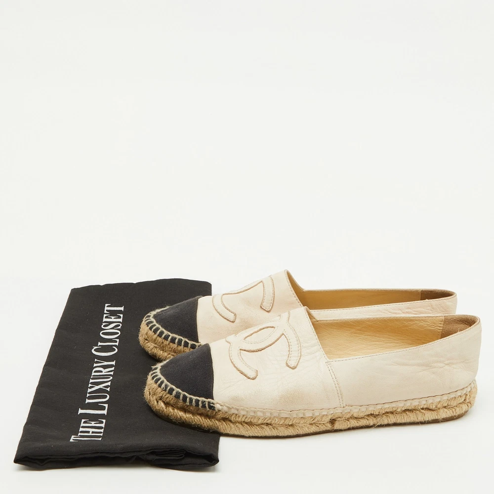 Chanel shoes are known for their unique designs that emanate the labels feminine verve and immaculate craftsmanship that makes their creations last season after season. Crafted from canvas and leather, these espadrille flats are a great combination of style and comfort. They are finished off with the CC logos on the uppers.Certified by The Luxury Closet - This item has gone through a detailed authentication process overseen by our experts. We offer a lifetime guarantee of authenticity on all our items. Import duties, taxes and charges are not included in the item price. These charges are the buyers responsibility. Please check with your country’s customs office to determine what these additional cost will be prior to buying. Our eBay Store About Us Contact Us Add to Favorite Sellers Chanel Off White/Black Leather and Canvas CC Cap Toe Espadrille Flats Size 38 $303.6 Chanel shoes are known for their unique designs that emanate the labels feminine verve and immaculate craftsmanship that makes their creations last season after season. Crafted from canvas and leather, these espadrille flats are a great combination of style and comfort. They are finished off with the CC logos on the uppers. Product Details Brand Color White Dimensions Material Leather Size 38 Outsole Width 8 cm Outsole Length 25 cm Heel Height Includes The Luxury Closet Packaging Certified by The Luxury Closet This item has gone through a detailed authentication process overseen by our experts. We offer a lifetime guarantee of authenticity on all our items. How We Check The in-house team of experts at The Luxury Closet is highly trained to verify the authenticity and the condition of the luxury products. They ensure that only 100% authentic items are put on sale.The evaluation process is unique with its own mix of assessment criteria and differs according to the category. Each item is evaluated based on the following combination of hallmarks, hardware, stitching, symmetry, material, craftsmanship, stamping, codes, hologram stickers, and packaging. Our authenticators also check if the items have been modified or amended (e.g., aftermarket diamonds, replaced batteries, repaired bags, etc.) International Buyers Import duties, taxes and charges are not included in the item price. These charges are the buyers responsibility. Please check with your country’s customs office to determine what these additional cost will be prior to buying.