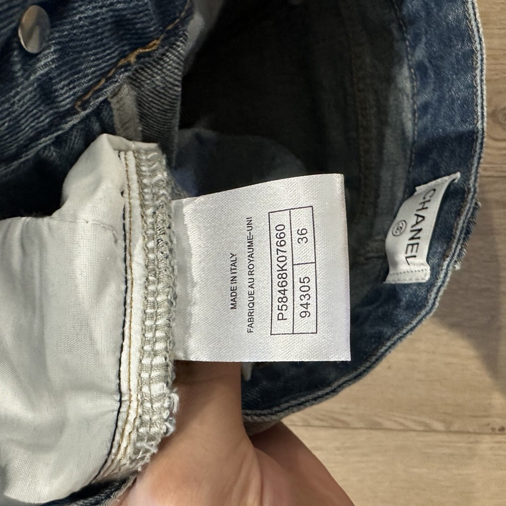 These Chanel Studded Denim Shorts in Size EU36 are a stylish and edgy addition to any woman's wardrobe. Made from cotton denim with a studded logo detail, they feature a flat front and a button closure. Perfect for casual occasions and featuring a Barbie character, these shorts are both fashionable and comfortable, with a regular fit and a waist size of 36 inches. Handmade in France, they are ideal for walking and beach activities. The iconic Chanel brand adds a touch of luxury to these trendy shorts, making them a versatile and chic choice for any fashion-forward woman.