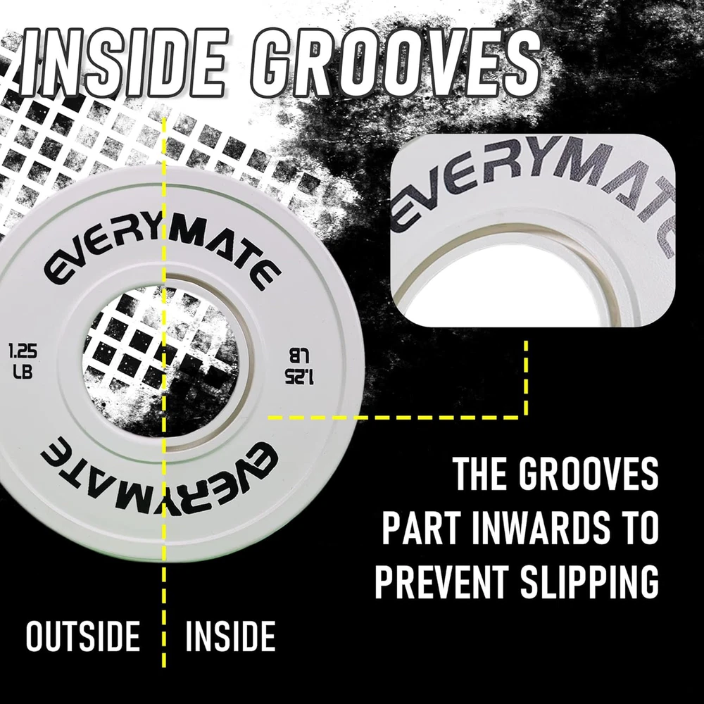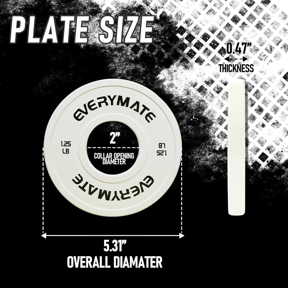 Change Weight Plates 1.25LB 2.5LB 5LB Set Fractional Plate Olympic Bumper Plates RUBBER COATED PLATES??? EVERYMATE change plates are made of steel core which can add stability to bumper weight plates. We select high-quality rubber as a coating to create stronger and more durable change plates. Bumper plates are easier to handle than traditional iron plates. The high-quality rubber of plates prevents your floor from scratching. Corrosion-resistant, no peculiar smell. Don't worry about the smell of rubber in the fitness area at home. COLOR CODING: Colored bumper plates and digital signs allow you to identify different weight plates and save exercise time. For people with classification needs, the brisk and bright color makes the plates more distinct and thus providing a more enjoyable exercise experience. These fractional change plates can also withstand professional training uses WORK OUT GRADUALLY: 1.25, 2.5, and 5-pound plates are suitable for you to increase weight in Olympic weightlifting training. With the help of these lightweight bumper fractional plates, you can gradually increase the weight. It is helpful to build muscle tissue and achieve an ideal training effect. In addition, these bumper change plates can also use separately STANDARD SIZE: The caliber of our bumper plates is standard 2 inches, which can match the standard Olympic barbell. For barbell bars of the same size, there is no need to worry about the matching problem. Our plates can use right away. Start your home training right immediately QUALITY ASSURANCE: EVERYMATE lightweight bumper plates are suitable for all exercise buyers. If you may find that our products are defective, please do not hesitate to contact us, and we promise you a satisfactory answer