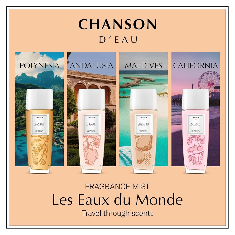 Top Notes: Pear Heart Notes: Jasmine Nectar Base Notes: Toasted Vanilla Lusciously light and uplifting, Les Eaux Du Monde scents by Chanson d'Eau are designed to be worn all over the body and hair. Lusciously light and uplifting, Les Eaux Du Monde scents by Chanson d'Eau are designed to be worn all over the body and hair. Try layering with other mists from the collection to create your own unique signature blend. Each Les Eaux Du Monde Mist is presented in a classic, gently curved glass bottle with an elegant illustration of the signature ingredient. Begin your sensory journey and take inspiration from idyllic places around the globe. A refreshing world of fragrances for women is here, with Chanson d’Eau Les Eaux du Monde.