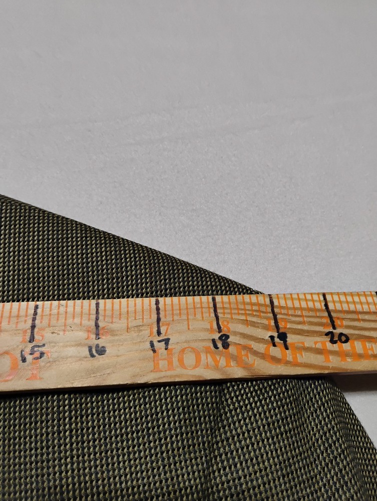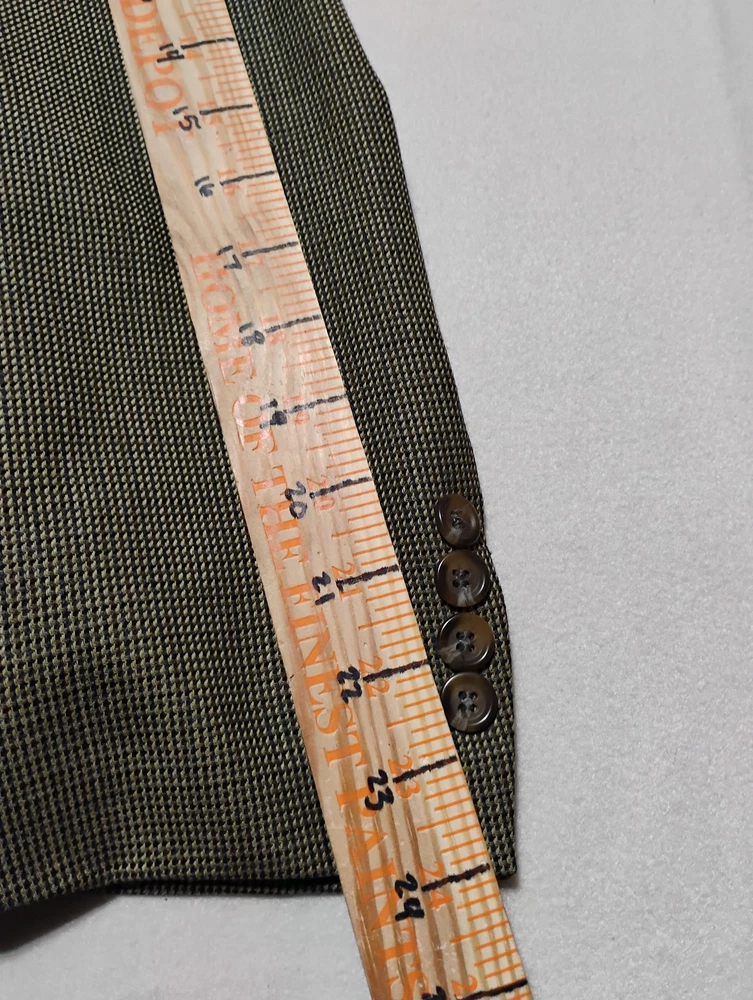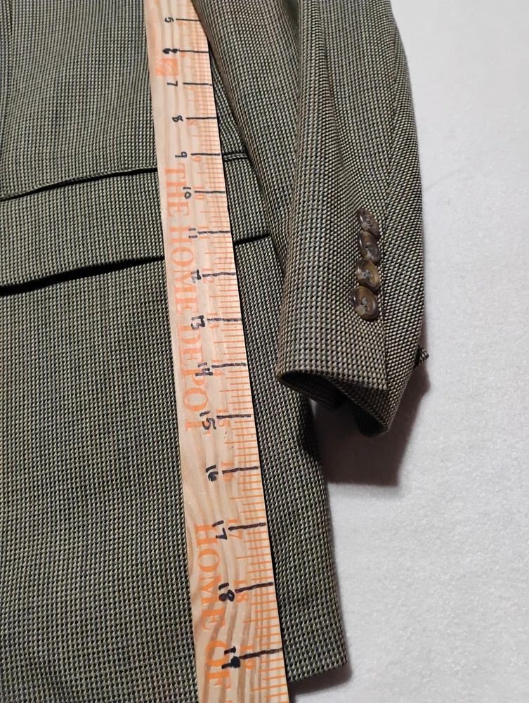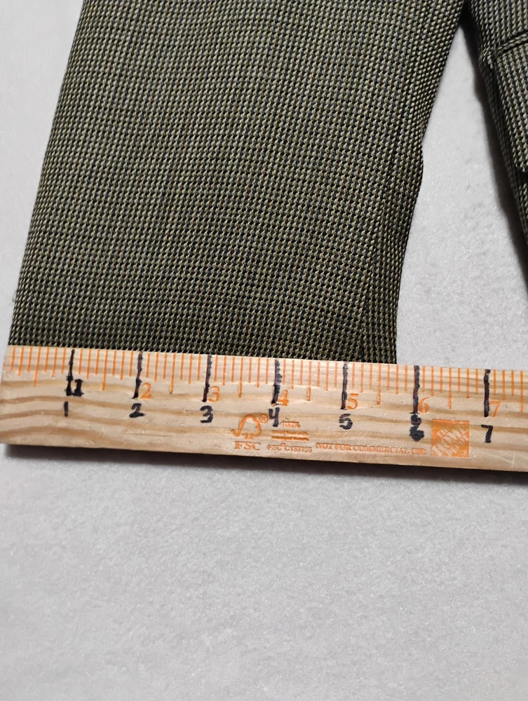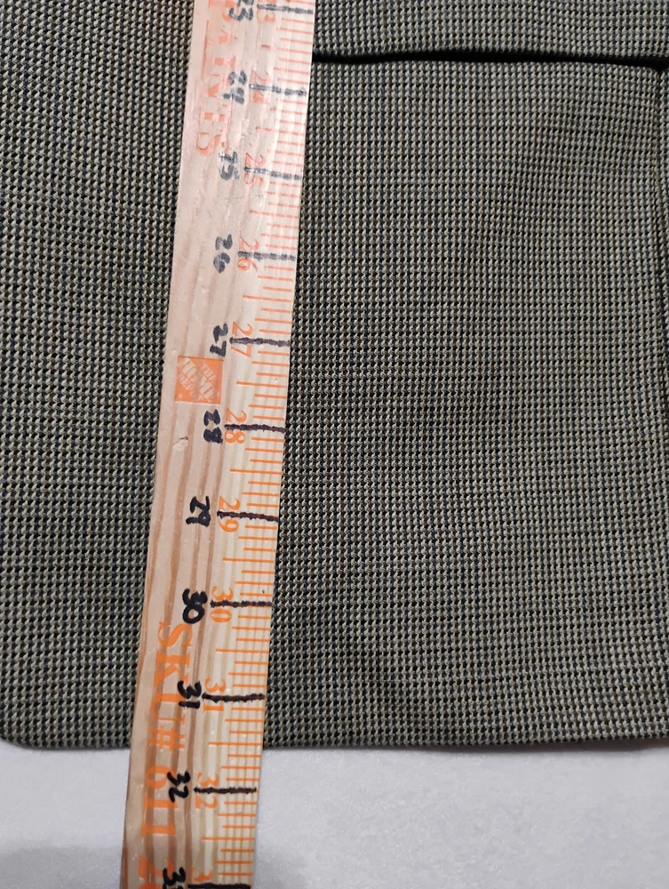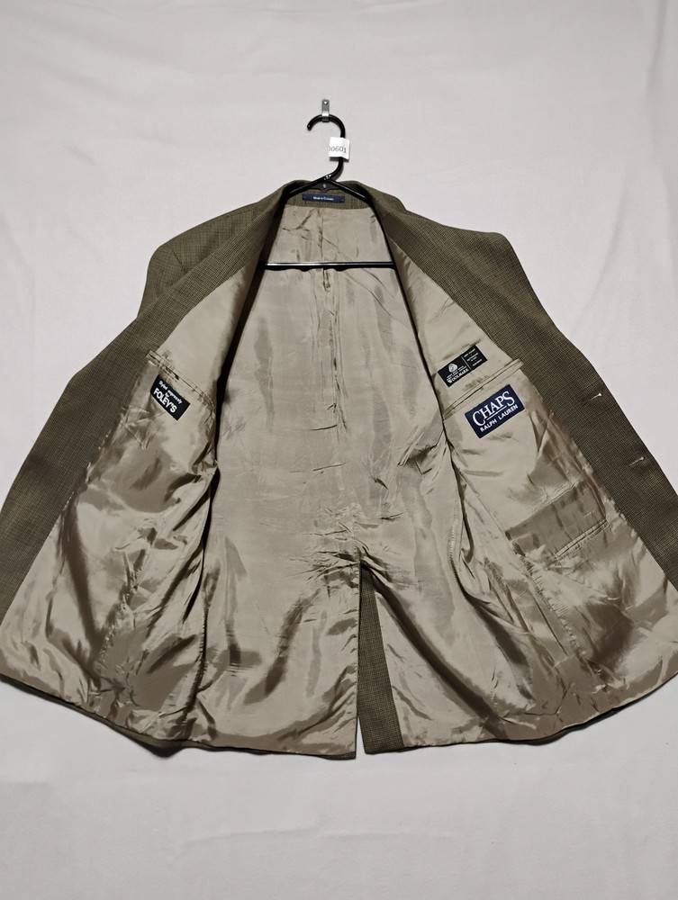 Chaps Ralph Lauren Blazer Mens 46 Long Olive Green Wool Blend Sport Coat Made in Canada Condition: Good pre-owned condition, light overall wear from normal use, some wrinkling to interior lining, no major flaws Classic two-button closure blazer with notch lapel Fully lined in tan polyester Outer shell: Wool blend (no material tag visible but traditional wool blend feel) Three interior pockets, one with Chaps Ralph Lauren logo tag Styled expressly for Foley's (label shown) Made in Canada (see collar tag) Double vented back Exterior features two flap waist pockets and one chest pocket Button cuff sleeves (four buttons per sleeve) Approximate flat measurements: - Pit to pit: 23 inches - Shoulder to shoulder: 18 inches - Sleeve length (shoulder seam to cuff): 25 inches - Back length (collar seam to hem): 32 inches Classic business or formalwear style suitable for office, events, or dress casual occasions