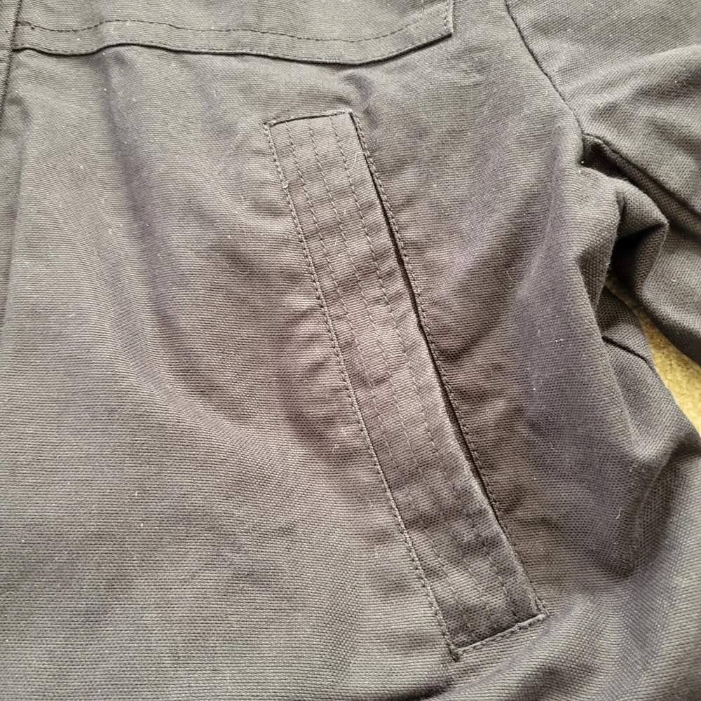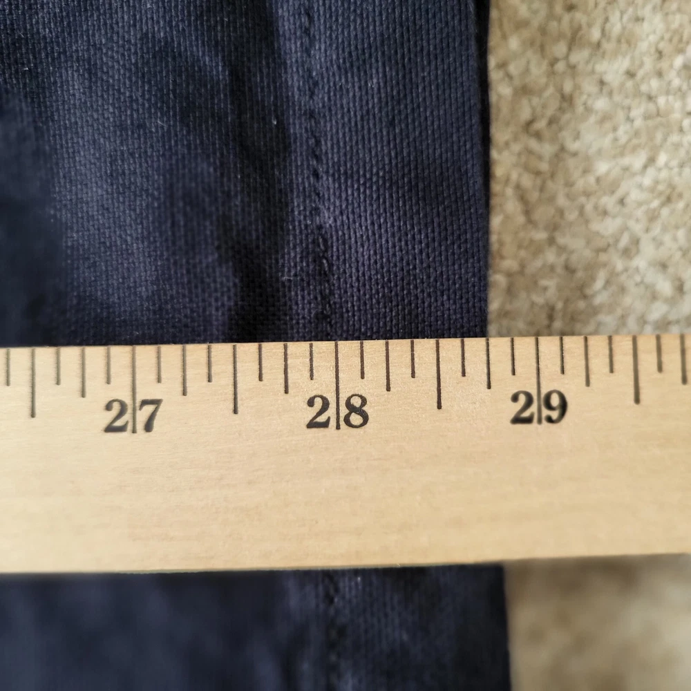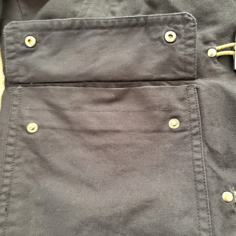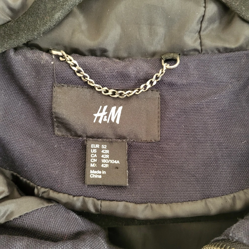 In good condition with no holes or stains. Size 42R. Measures approximately 22" pit to pit and approximately 29" in length. The navy blue heavyweight canvas material is lined with polyester and features a full zip closure with toggles. The jacket is a short to mid-length coat with long sleeves and a regular fit, making it comfortable and practical for everyday wear. The jacket has a solid pattern and numerous pockets. It is machine washable and made. The jacket is ideal for winter and outdoor activities.