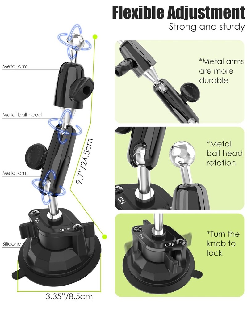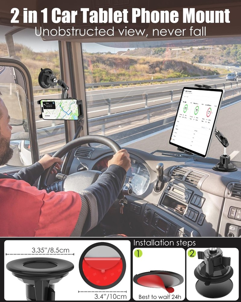 Charchendo Tablet Holder for Car Truck SUV Dashboard Windshield, Strong Suction Cup Tablet Phone Mount with 7.5" Metal Arm 360° Rotation Fits iPad Pro 13/12.9/Air/Mini, Galaxy Z Fold, 4-13" Devices Product Details Brand: Charchendo Color: Black Compatible Devices: iPad Pro 13" / 12.9" / 11" / 10.5" / 9.7", iPad Mini 1 / 2 / 3 / 4 / 5, iPad Air 1 / 2 / 3 / 4, iPad 5th / 6th / 7th / 8th Generation 10.2", iPad 2017 / 2018 / 2019 / 2020 / 2021; Microsoft Surface Pro series, Galaxy Tab series, e-Readers; See more Compatible Phone Models: iPhone 15 / 15 Pro / 15 Pro Max / 15 Plus, iPhone 14 / 14 Pro / 14 Pro Max / 14 Plus, 13 / 13 Pro / 13 Pro Max, 12 / 12 Pro / 12 Pro Max, 11 / 11 Pro / 11 Pro Max, X / XS / XR / XS Max, 8 / 8 Plus, 7 / 7 Plus, 6 / 6S / 6 Plus / 6S Plus; Galaxy Z Fold 5, Z Fold 4, Z Fold 3; Galaxy Z Flip 5, Z Flip 4, Z Flip 3; Galaxy S20 / S20+ / S20 Ultra, S10 / S10+, Galaxy Note 10 / 10+, Note 9 Note 8 S9 S8 A9 Star S8+ S9+ S7 edge S6 edge+; Google Nexus and More. See more Mounting Type: Car Windshield Dashboard Package Dimensions: 5.67 x 4.53 x 4.49 inches Item Weight: 13.9 ounces Special features: Anti-Drop, Changeable position, Easy to Install, Metal Ball Head 360° Adjustable Viewing, Works for All 4-13" Phone Tablet Color: Black Whats in the box: 1 x Tablet mount Manufacturer: Charchendo Date First Available: May 21, 2024 *Charchendo suction cup will not leave any residue or marks on the surface when removed! 3.35" Reusable Suction CupThe super-strong vacuum suction cup of this car tablet holder has a diameter of 3.35", which can keep the truck tablet holder firmly fixed to the windshield and dashboard even on very bumpy journeys. 7.5" Metal Arm & 360 Rotation Metal Ball HeadThe car dashboard iPad holder has a multi-jointed 360-degree rotating metal ball head and a rotatable metal arm, which is more durable and more stable than plastic materials. It provides a perfect driving viewing angle and will not block your sight, which is perfect for your safe travel. Multiple Mounting MethodsThe car iPad holder provides dashboard, windshield mounting for cars. The tablet holder has super strong adsorption ability on any smooth surface. Such as car windshields, windows, car hoods, glass tables, boat windshields, boat dashboards and tables. Ideal for heavy vehicles such as pickup trucks, vans, semi-trailers, buses and SUVs. Wide CompatibilityUniversal tablet mount adjustable clip fits all 4.7-13'' devices. The clip size 4.7-9.64'' (11.93-24.5cm), Thickness 0.7'' (1.8cm), which makes the clip work with or without a case Can hold on tightly. Compatible with tablets such as ipad 11/air/12.9''/13" series; ipad mini 4/5/6; Galaxy Tab; Compatible with 99.9% of mobile phones on the market at the same time, Such as iPhone15 Pro Max/14/13/12/11 series; Galaxy Z Fold/Flip. GPS Navigator, etc. Package Included1 x Car truck tablet phone holder, 1 x Dashboard Pad Mounting Disk, 1 x User Manual. All Charchendo products come with 12-month worry-free guarantee. We will respond to any of your questions with in 12 hours.