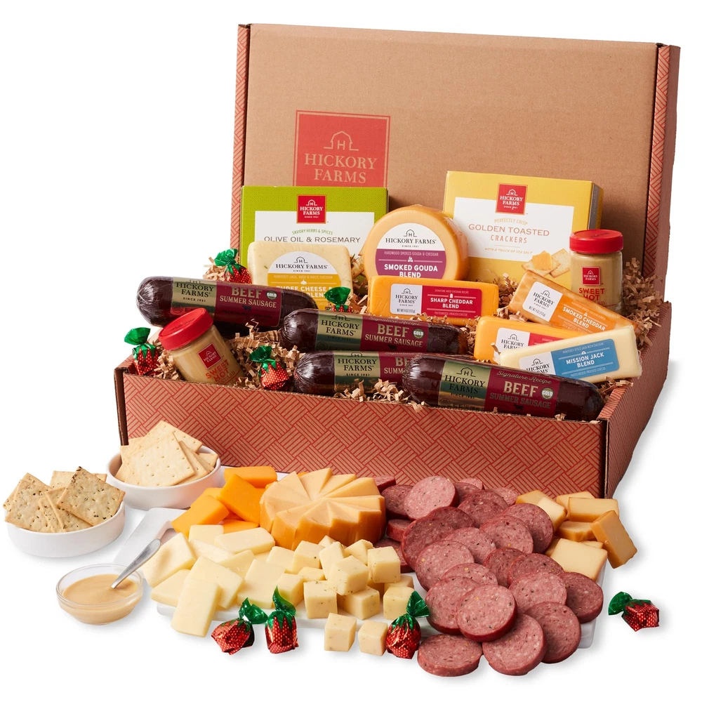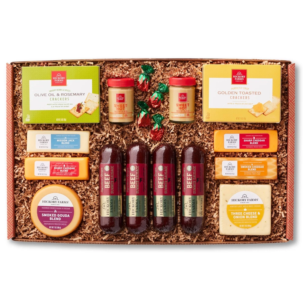 Hickory Farms Meat & Cheese Extra Large Gift Box - Gourmet Food Gift Basket | Charcuterie Board Food - Meat and Cheese | Christmas Gift Basket | Father's Day Gift Basket | Holiday Gift Basket | Housewarming Gift | Perfect For Family, Birthday, Sympathy, Congratulations Gifts, Retirement, Thinking of You, Corporate Gifts GOURMET GIFT BASKET – This extra-large gift box can feed a crowd! Hickory Farms classic summer sausage, cheese, and mustard flavors all pair perfectly for delicious bites. This gift has everything they need to create a gourmet meat and cheese spread. Shelf-stable summer sausage and cheese, great for snacking, appetizers, parties and entertaining. MEAT & CHEESE: (4) 7 oz Signature Beef Summer Sausage, (2) 4 oz Sharp Cheddar Blend, 4 oz Smoked Cheddar Blend, 7 oz Three Cheese & Onion Blend, 4 oz Mission Jack Blend, 7 oz Smoked Gouda Blend GOURMET CONDIMENTS & CRACKERS: 2.25 oz Sweet Hot Mustard, 1.5 oz Olive Oil & Rosemary Crackers, 1.5 oz Golden Toasted Crackers CLASSIC SWEETS: Includes 4 classic Strawberry Bon Bons for a sweet treat. ALLERGEN INFORMATION – Product contains milk, wheat, and soy. Produced in a facility that also processes egg, wheat, peanuts, and tree nuts (pecans, almonds, coconut, cashews, walnuts). Enjoy this sausage and cheese gift box! An assortment of classic Hickory Farms favorites, including Smoked Gouda Blend, Smoked Cheddar Blend, Farmhouse Cheddar, Creamy Swiss Blend, Harvest Cheddar Blend, and Mission Jack Blend. These cheeses pair perfectly with our Signature Beef Summer Sausage and Sweet Hot Mustard stacked up on Olive Oil & Rosemary and Golden Toasted Crackers. Shipping We offer FREE shipping on all orders! We ship within Three business days of payment, usually sooner. We use a selection of shipping services such as UPS, FedEx, USPS etc. We only ship to the lower 48 states, no APO/FPO addresses or PO Boxes allowed. Local pickups and combined shipping options are not provided at this time. Return You can return a product for up to 30 days from the date you purchased it. Any product you return must be in the same condition you received it and in the original packaging. Please keep the receipt. Payment We accept payment by any of the following methods: PayPal Please pay as soon as possible after winning an auction, as that will allow us to post your item to you sooner! Feedback Customer satisfaction is very important to us. If you have any problem with your order, please contact us and we will do our best to make you satisfied. Contact Us If you have any queries, please contact us via ebay. We usually respond within 24 hours on weekdays. Please visit our eBay store to check out other items for sale! Thank you for shopping at our store.