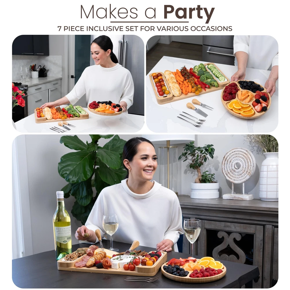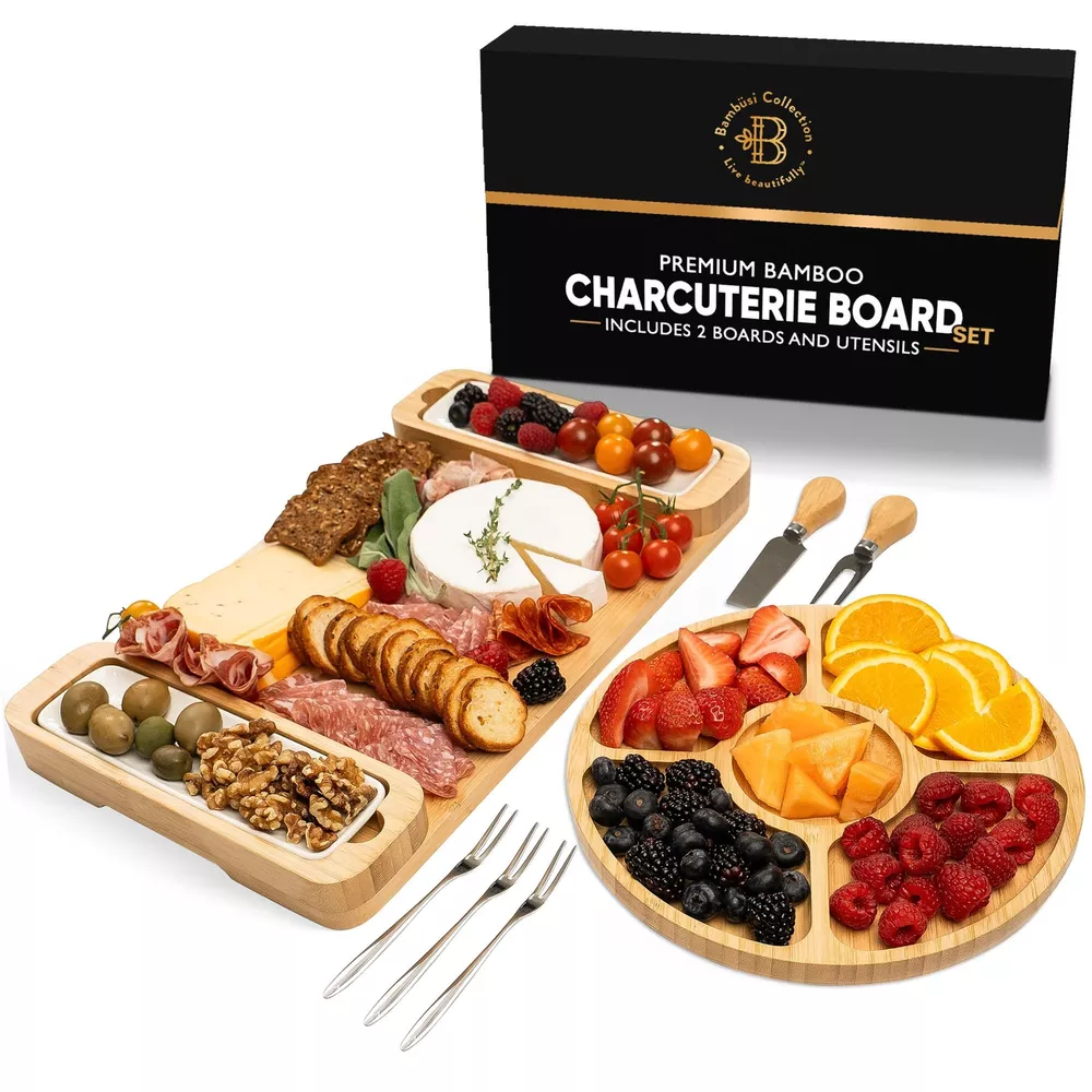 charcuterie boards, charcuterie board set, cheese board, house warming presents for new home, charcuterie board, wooden tray, housewarming gifts for new home, cheese board set, charcuterie board accessories, charcuterie boards small, appetizer plates, cheese boards charcuterie boards, bamboo tray, cheese boards, chacutery board tray, anniversary gifts for couple, house warming gifts, charcuterie accessories, cheese platter, bambusi cheese board set, small charcuterie board, cheese tray, party serving supplies, gifts for her, charcuterie boards, couples gifts, wine gifts, cheese board, cooking gifts, serving tray, serving platter, gifts for couples, house warming presents for new home, charcuterie board, wine accessories, wedding gifts for couple, gifts for parents, cheese board and knife set, kitchen gifts, cheese knife set, housewarming gift, charcuterie board set, anniversary gift for couple, gifts for couples who have everything, cheese board set, cheese platter, christmas dishes dinnerware sets, housewarming gifts, house warming presents PERFECT CHRISTMAS GIFT: This elegant bamboo charcuterie board set makes an unforgettable Christmas gift for women, men, couples, or anyone who loves hosting. Whether it's a gift for him, her, or a family, this cheese board set is a stylish, practical addition to any home. Ideal for holiday gatherings, housewarmings, weddings, and anniversaries, it’s a thoughtful gift choice that adds warmth and elegance to any occasion COMPLETE ENTERTAINING SET: Everything needed for impressive entertaining in one set! Includes a large cheese board, a round serving tray, ceramic bowls, cheese knives, and serving forks—perfect for arranging meats, cheeses, fruits, and snacks. This all-in-one set makes it easy to create beautiful spreads that impress guests at any gathering, from holiday dinners to casual wine nights HIGH-QUALITY BAMBOO DESIGN: Crafted from premium, eco-friendly bamboo, this charcuterie board set is built to last. The durable bamboo construction is naturally resistant to stains and odors, easy to clean, and adds a sophisticated touch to any setting. The smooth, polished finish highlights the natural beauty of bamboo, making this board a standout piece for any table THOUGHTFUL & FUNCTIONAL LAYOUT: Designed with deep grooves for crackers, nuts, and other accompaniments, plus removable ceramic bowls for dips and sauces, this board is as practical as it is stylish. The cutout handles make it easy to carry, whether you’re serving indoors or outdoors, ensuring a smooth experience for hosts and guests alike. Perfect for making any gathering special with minimal effort VERSATILE & MEMORABLE GIFT: This charcuterie board set brings warmth, style, and functionality to any home, making it a versatile gift for Christmas, housewarmings, and beyond. A perfect addition to holiday parties, family gatherings, or wine tastings, this set ensures a memorable experience with every use. Trust in ’s quality for a gift that’s both beautiful and practical