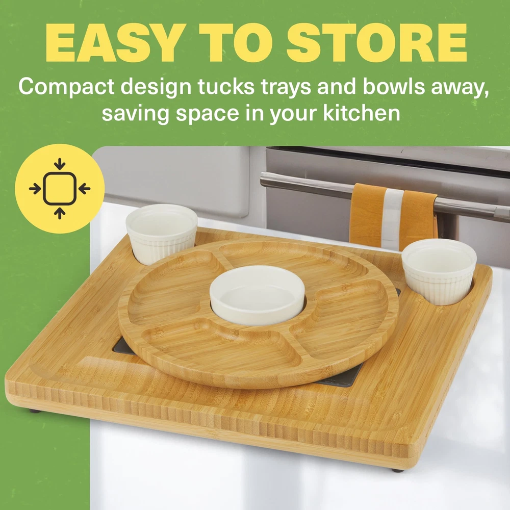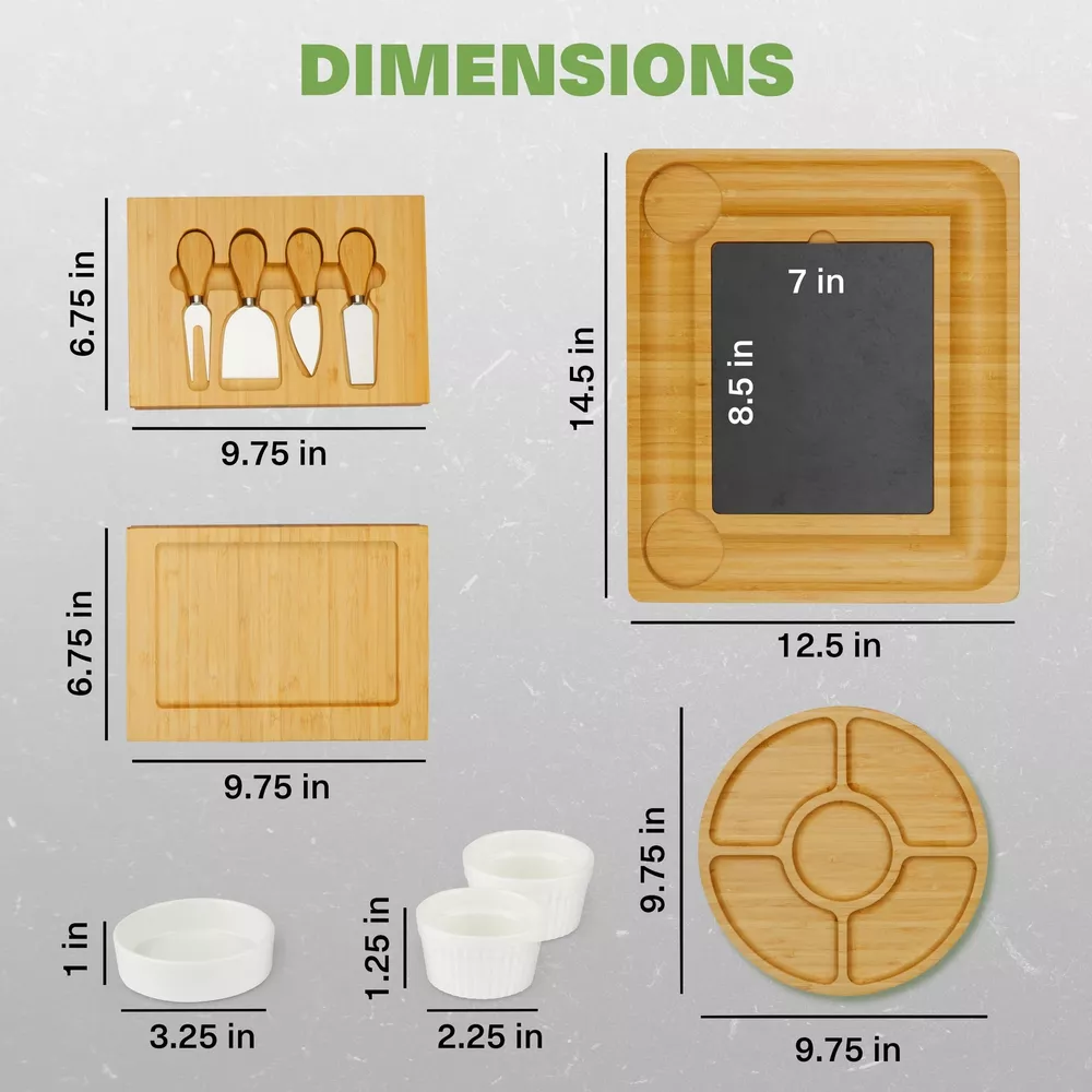 Complete Set: Includes a cheese tray platter with 4 stainless steel utensils, 3 ceramic bowls, a detachable serving tray, and 2 hidden drawers for organized storage and serving Premium Bamboo: Crafted from 100% bamboo, this bamboo cheese serving tray is durable, easy to clean, and suitable for hosting events, offering an eco-conscious, luxurious wood finish Ideal for Entertaining: This charcuterie board set features a grooved rim for crackers and bread, providing ample space for cheeses, meats, fruits, and more to impress your guests Hidden Utensil Storage: Designed with hidden drawers to store utensils neatly, the cheese board with drawers ensures easy access to tools while maintaining an elegant look Ideal Gift Choice: A thoughtful gift for housewarmings, weddings, or anniversaries, this charcuterie boards with hidden utensil drawer complements any kitchen with its stylish design