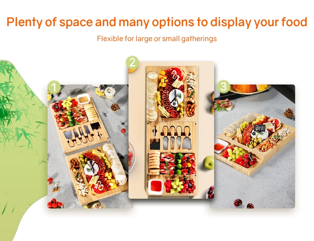 【 Large and Versatile Size】 Large charcuterie board measures 28’’ × 11’’ and consists of two parts that can be used separately or together. This flexible design makes it suitable for various occasions, whether you're hosting a small gathering or a large party with friends and family 【Luxurious Set with Extra Features】 The charcuterie boards comes with a ceramic serving bowl for sauces or dips and four serving knives, which perfectly complement your delicate charcuterie tray. Additionally, it includes soapstone chalk for labeling the different types of cheese, allowing you to personalize your board and create a truly unique serving experience 【Space-saving Design】 Unique magnet-fixed stacking design allows for different size options while also maximizing storage efficiency. Whether you want to use the two parts separately or together, you can easily stack and store them without taking up much space in your kitchen 【Low Maintenance and Eco-friendly】 Crafted from 100% natural bamboo, this cheese board is not only visually appealing but also highly durable. The bamboo material is resistant to staining and odors, ensuring that your board will last for a long time. By choosing this board, you're also promoting eco-conscious living 【Perfect Gift for Various Occasions】 Charcuterie board set are a crowd favorite at gatherings of all sizes, from intimate family dinners to large-scale events like weddings. With its high-end appearance and beautiful packaging, this board makes a perfect gift for housewarmings, festivals, birthdays, and any other special occasion