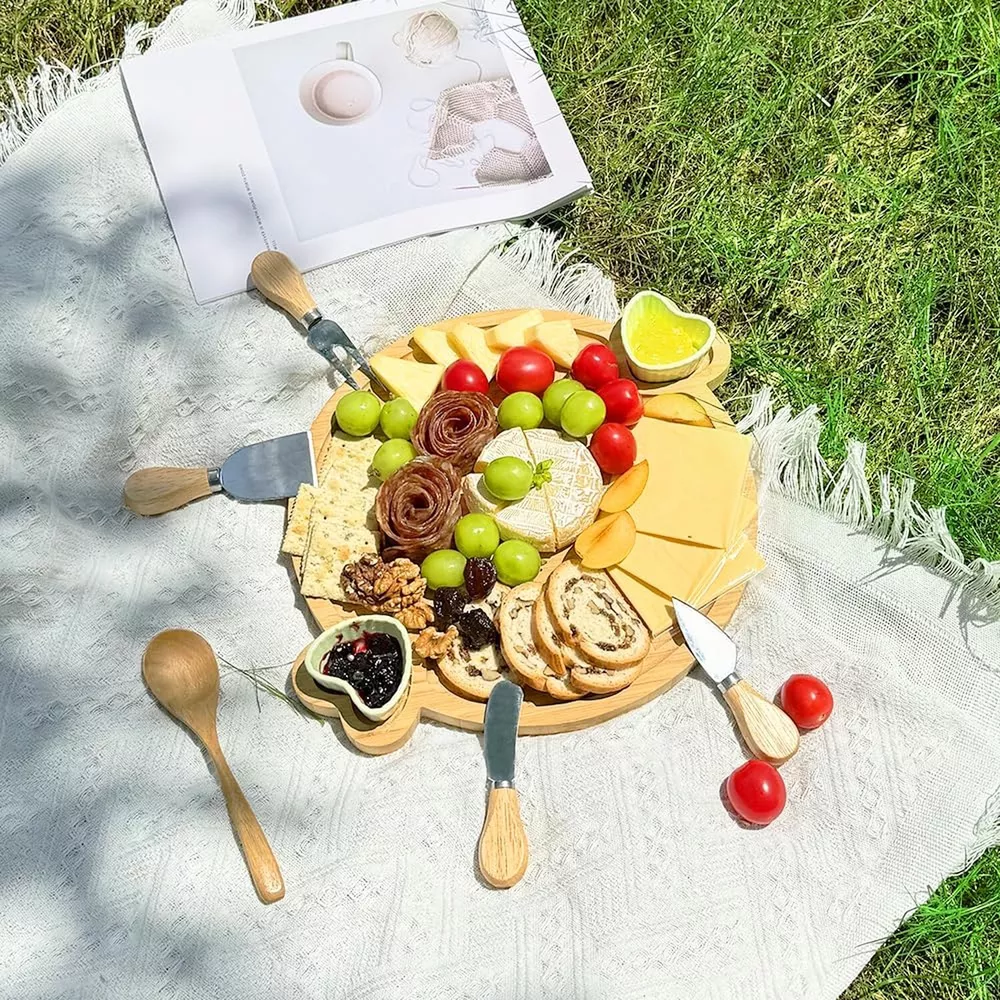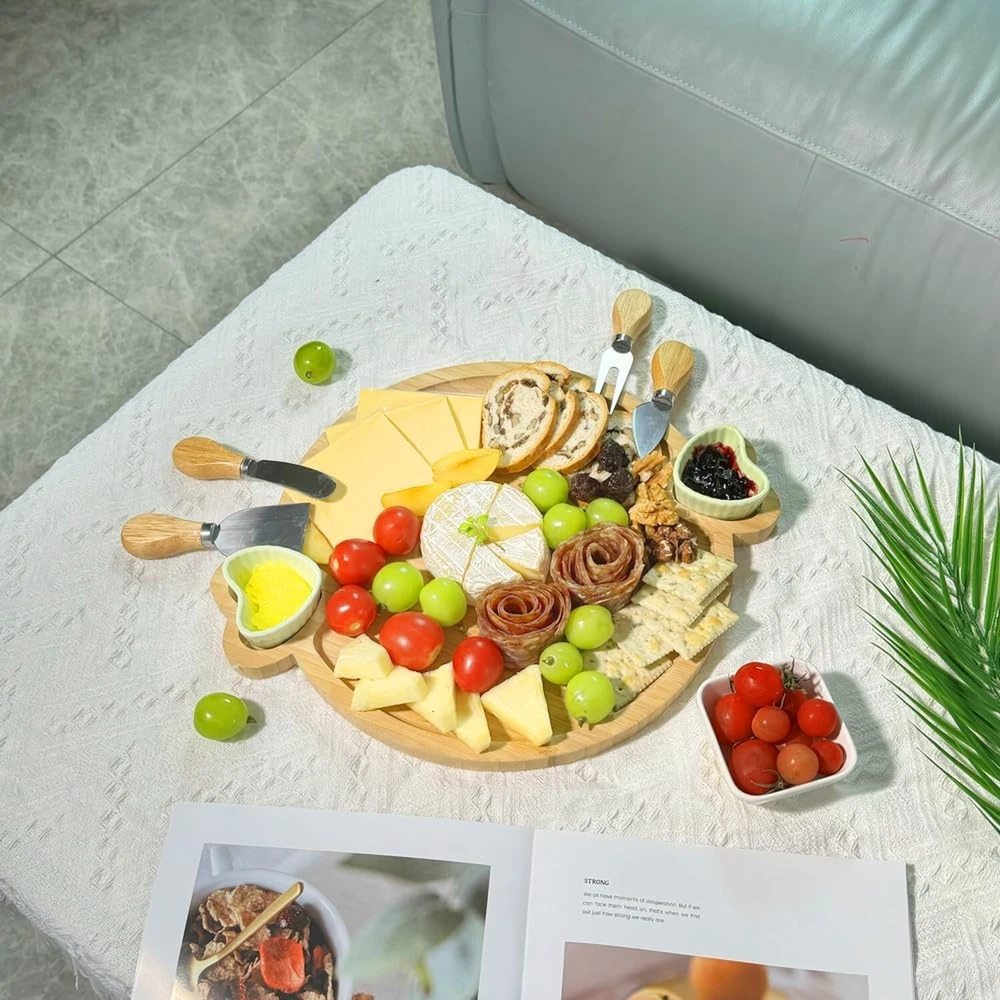 Charcuterie Boards Gift Set,Cute Bamboo Cheese Board, Large Round Charcuterie Board,House Warming Gift for New Home,Wedding Gift Cheese Serving Tray Platter with 2 Ceramic Bowls Product Details Color: One-piece board Brand: Hongsane MPN: Does not apply UPC: Does not apply EAN: Does not apply Material: Bamboo Brand: Hongsane Color: One-piece board Special Feature: BPA Free,Dairy Use,Eco-Friendly,Reusable,Durability Occasion: Bridal Shower, Mother's Day, Wedding, Christmas, Housewarming, Anniversary, Birthday, Halloween, Thanksgiving, Valentine's Day See more Material: Bamboo Brand: Hongsane Color: One-piece board Special Feature: BPA Free,Dairy Use,Eco-Friendly,Reusable,Durability Occasion: Bridal Shower, Mother's Day, Wedding, Christmas, Housewarming, Anniversary, Birthday, Halloween, Thanksgiving, Valentine's Day Style: Modern Shape: Round and Heart Shape Seasons: All Seasons Product Dimensions: 15.3"L x 12.5"W x 0.59"Th Recommended Uses For Product: Charcuterie, Fruit, Appetizer, Cheese Number of Pieces: 1 Pattern: Solid Product Care Instructions: Wipe With Damp Cloth Size: 12 inch Finish Type: Rubbed with olive oil Item Weight: 1.6 Pounds Is Microwaveable: No Material Feature: Bamboo Is Dishwasher Safe: No Included Components: 4 Cheese Knives, 2 Ceramic Bowls Theme: Love Product Name: DISHWARE_PLATE Reusability: [LIKELY] Reusable Pattern: Heart, Fruit Manufacturer: Hongsane Unit Count: 1.0 Count Item Weight: 1.6 pounds Finish types: Rubbed with olive oil Batteries required: No PERFECT FOR CREATING AN AESTHETIC PLATTER!The classic round and double heart design of this Hongsane cheese board set not only adds to the beauty of the table,but is also very practical for displaying a variety of food.You can decorate it with yummy fruits,meats,nuts,cheese,crackers,sides,sauces,etc. .The board is beautiful,and with its warm, natural tones makes the food placed on it look inviting.It has all the features and you will like without adding the bells and whistles that may look fancy but never get used IDEAL SIZE FOR GATHERINGSThe charcuterie board set measures 15.3*12.5 inches.It's the perfect size for entertaining guests and it comes with all the accessories you need to create a beautiful and delicious spread.With its big serving platter and two ceramic bowls,a small get-together of 3-5 people could easily be served hors d'oeuvres from this set.The diameter of the cheese tray allowed you to show it all very well. PARTY MUST HAVE OR EXTREMELY GIFTABLEYou can use it when you have your Halloween birthday Christmas party or use it for small family gatherings,and make your food look great and organized.Not only adds a touch of elegance to gatherings but also offers functionality at its finest.And it's perfect for housewarming wedding or histess gift with its nice looking.Whether it's a cozy evening with close friends or a bustling family get-together, this board handles it all with ease EXTRA ACCESSORIES YOU WILL NEEDIt comes with 4 different cheese knives and 2 beautiful ceramic bowls to be transformational in helping you create stunning boards helped elevate everyone's dining experience.The stainless steel knives add a touch of sophistication,and it's also incredibly functional,making it easy to cut a variety of cheeses,while the ceramic bowl fit nicely into the outlined sections for hot mustard,tapenade, olives,and honey.But be careful,dont let the kids around the knives EASY TO CLEAN AND PUT AWAYIts sturdy, super easy to clean.A damp rag is all it takes.The ease of cleaning has made it her go-to for entertaining and you will love how it saves on storage space.
