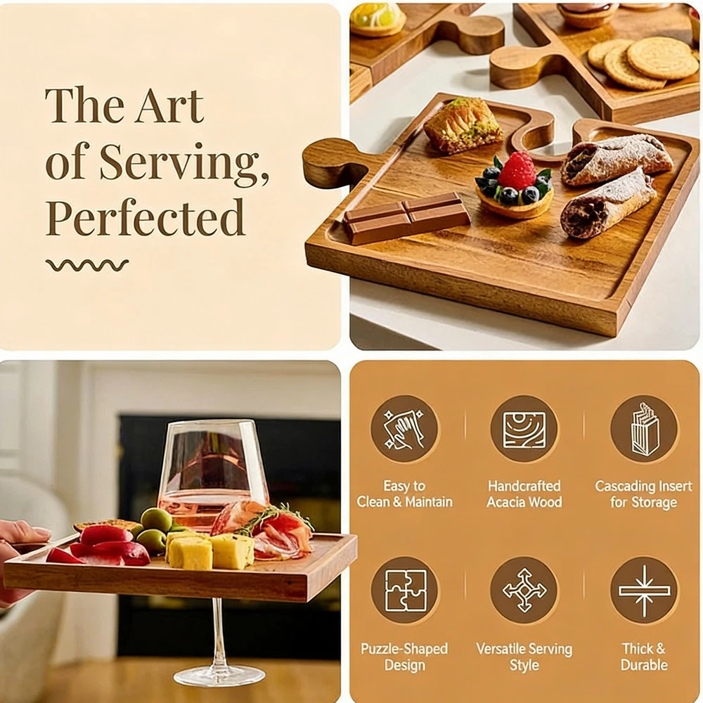 Charcuterie Serving Board Wooden Wipe-Clean Tray Charcuterie Cutting Bullet Points: Interlocking Puzzle Edges: This serving tray incorporates a space-saving design with interlocking puzzle edges, enabling flexible single or assembly use that improves convenience and organization in kitchens or entertaining settings without occupying excessive room Water-Rinse Friendly: The charcuterie boards set features a long-lasting wood finish that resists wear while maintaining its elegant appearance, providing extended use for serving cheese, fruits, or snacks at gatherings with minimal effort in care and maintenance Event-Ready Functionality: Greatly suited for multi-occasion use, this cheese board simplifies appetizer presentation while serving as a fundamental entertaining solution, effortlessly converting into a charcuterie board ready to improve festive meals, casual snacks, or special occasions with ease and sophistication Food-Safe Construction: This board for charcuterie features solid natural wood with a dependable build, providing food-safe construction and showcasing stunning wood grain to improve the aesthetic appeal during festive meals or casual snacks Delight Food Lovers: The charcuterie serving board improves gatherings by providing a practical yet elegant stage for presenting gourmet selections, delighting food lovers and making it a housewarming favorite that uplifts your hosting experience during special occasions or casual get-togethers The charcuterie cheese serving board is crafted from dependable wooden material, designed to improve your kitchen presentation while providing practical functionality for everyday use or special occasions. This versatile food holder serves as an elegant tray for arranging cheese, cold cuts, bread, fruits, and nuts, making it suitable for family gatherings, holiday parties, picnics, or wine tasting events. Its wipe-clean exterior provides effortless maintenance after use, preserving its natural beauty for long-lasting enjoyment. Greatly suited for housewarming presents, this wooden serving board adds a touch of sophistication to any setting while keeping your culinary creations organized and visually appealing. Whether hosting a casual get-together or an elegant event, this charcuterie cheese serving board seamlessly combines utility with timeless charm, improving every dining experience. Specification Specifications: Five-piece set (4 puzzle cutting boards + storage box) Material: wood Product size: Single board size: about 29x23x1.2cm/11.42x9.06x0.47 inches Four board sizes: about 46x46x1.2cm/18.11x18.11x0.47 inches Frame size: about 25.5x7x17.5cm/10.04x2.76x6.89 inches Net weight: about 1.8KG, gross weight: about 2.3KG List 1 set * charcuterie boards set (4 puzzle cutting boards + storage box) Note: 1. Due to lighting effects and display angles, there may be color differences in the product. 2. Due to manual measurement, there may be errors in product size, please understand. 1.You can make a Credit payment via Paypal.Paypal will let you use MasterCard,Visa to pay. 2.Payment should be completed within 5 days after auction closed, or unpaid dispute will be filed for an closing auction.An unpaid case will be filled after 4 days. ● We strive for 100% customer satisfaction ! ● Positive Feedback is very important to us. ● We hope that you contact us immediately BEFORE you give us neutral or negative feedback, so that we can satisfactorily address your concerns. ● We promise to offer the lowest price and high quality produce. Dear buyers : ● Welcome to my store ! ● Your satisfaction is our top goal,we appreciate your patronizing. ● If you have any questions, please contact us before leave negative or neutral feedback, we will try our best to solve the issue to your satisfaction, thanks ! ● If you are satisfied with our service, please rate the details of the transaction (Detailed Seller Ratings) on eBay. ● Please always talk to us via ebay Message. ● We appreciate your business and look forward to growing our e-Bay sales with satisfied customers.