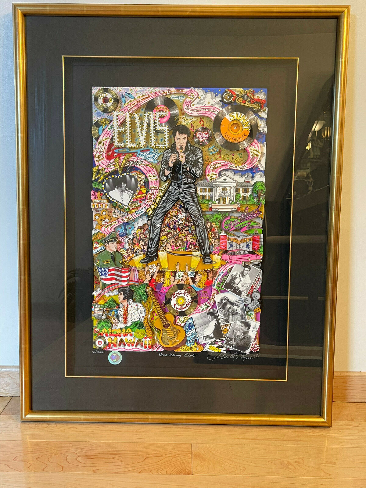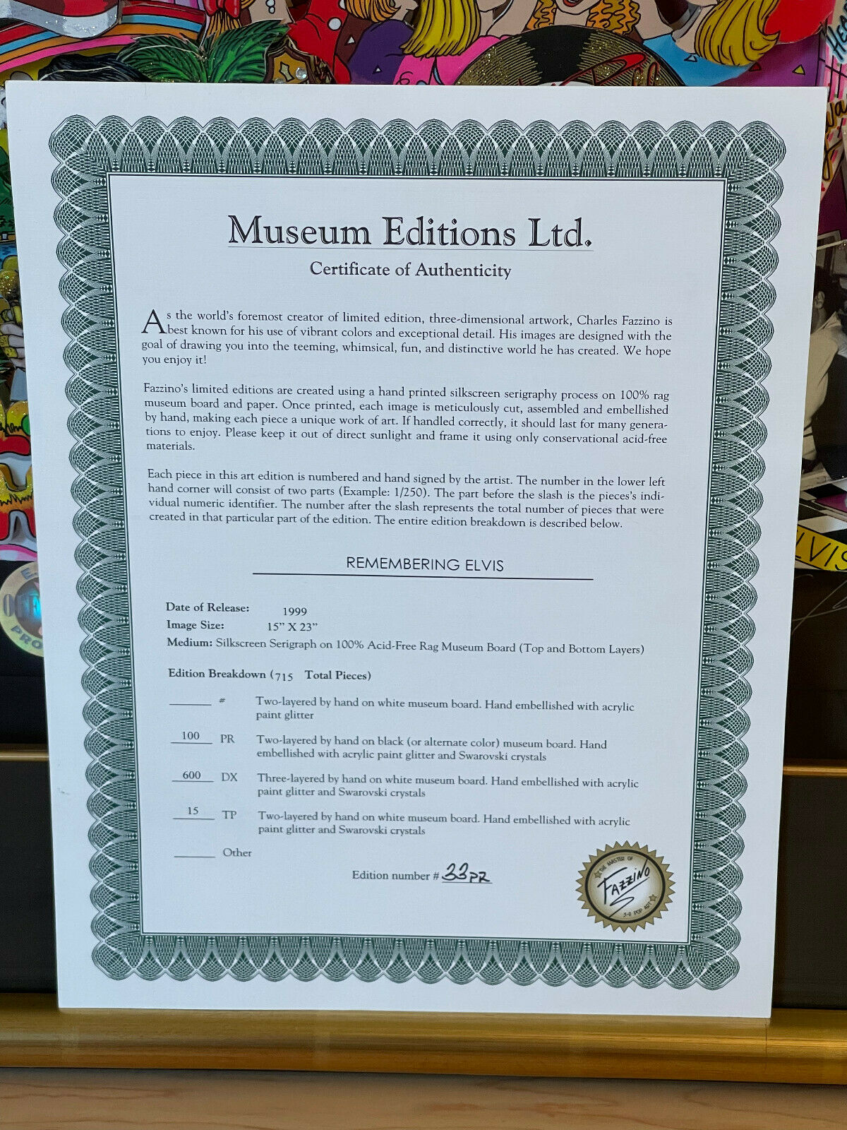 Remembering Elvis Premier Edition Number 33 of 100. Image Size 15X23, Framed 27X36. Tjis is a beautiful Authentic peice from Pop Artist Charles Fazzino. Signed bottom left hand corner. Beautifully Framed in Black and Rich Gold. This is a must for all Elvis Lovers