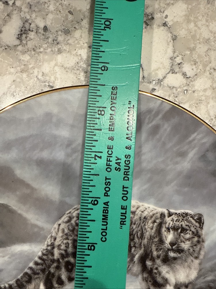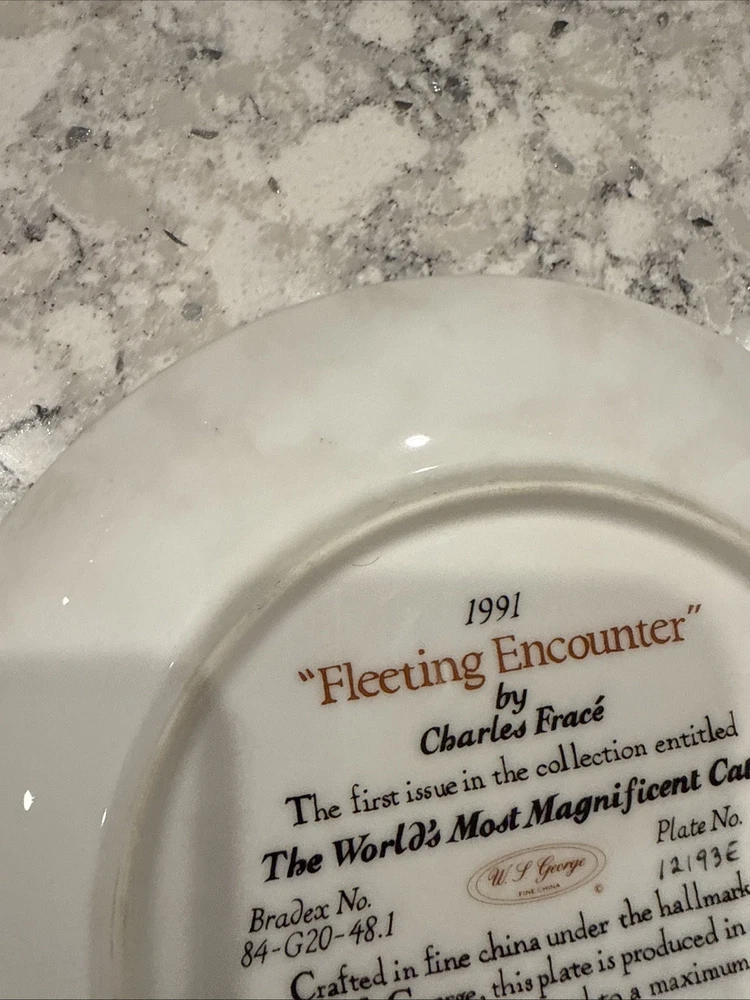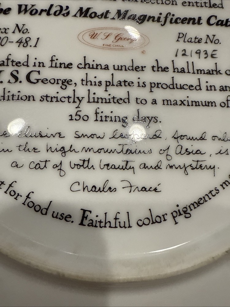 The Charles Frace Collector Plate depicts a snow leopard in a unique and decorative style. This limited edition plate, numbered 16047D and signed by the artist, features a round shape with a diameter of 9 inches. Made of porcelain, the plate belongs to the Bradford Exchange franchise and was produced in the United States during the late 20th century. The art pottery piece showcases an animal print pattern and is a perfect addition to any collector's display, particularly for those interested in wild animals and American culture. There are a few age spots on the back. See photos for details.