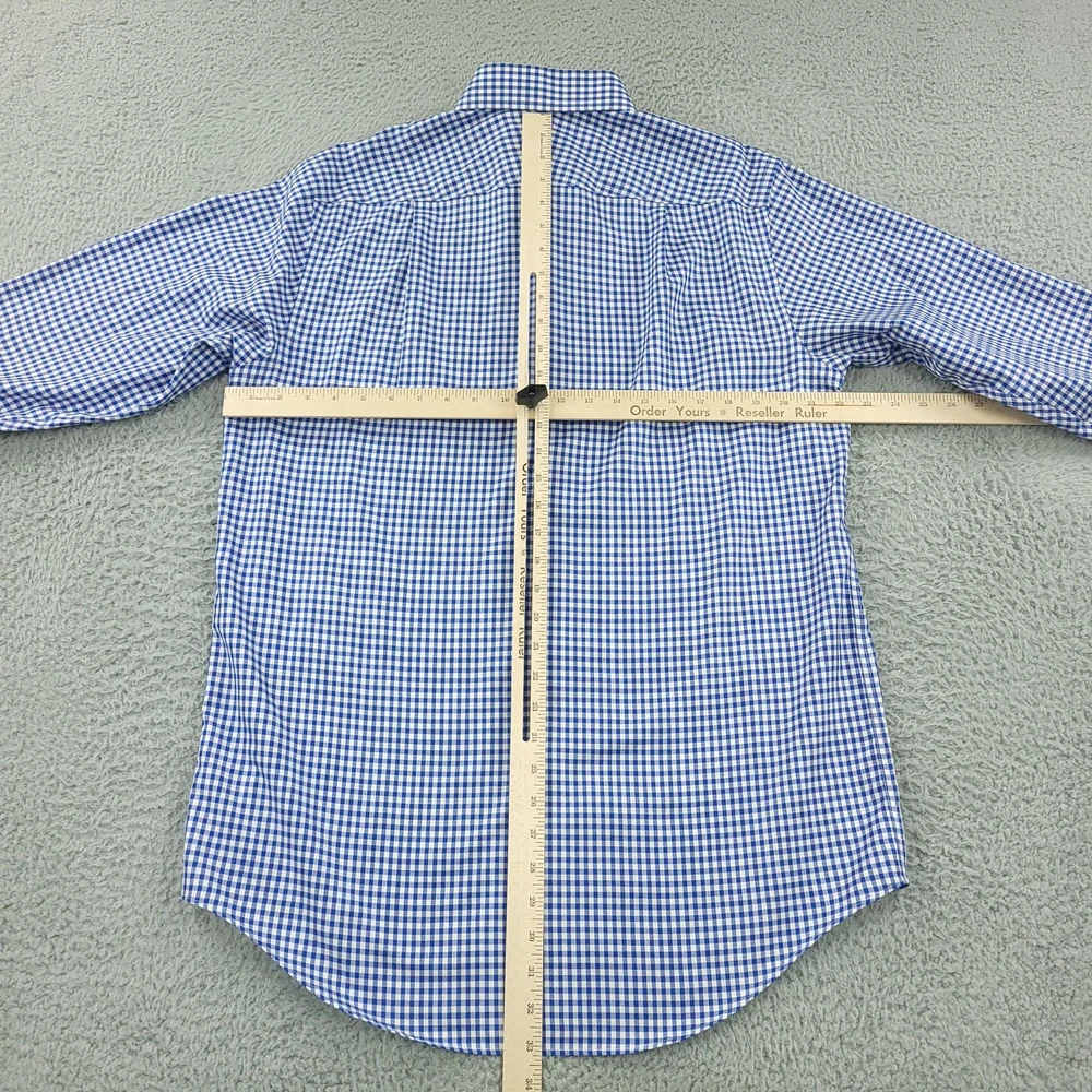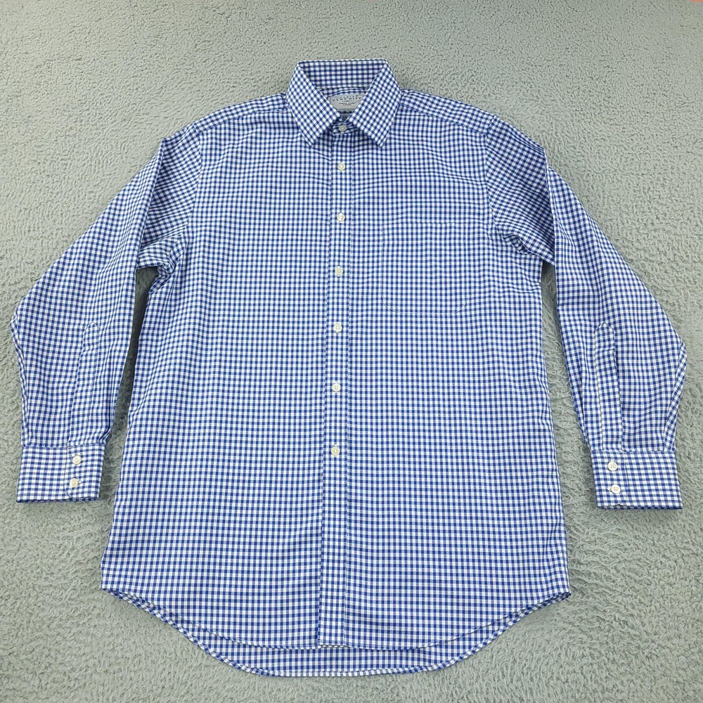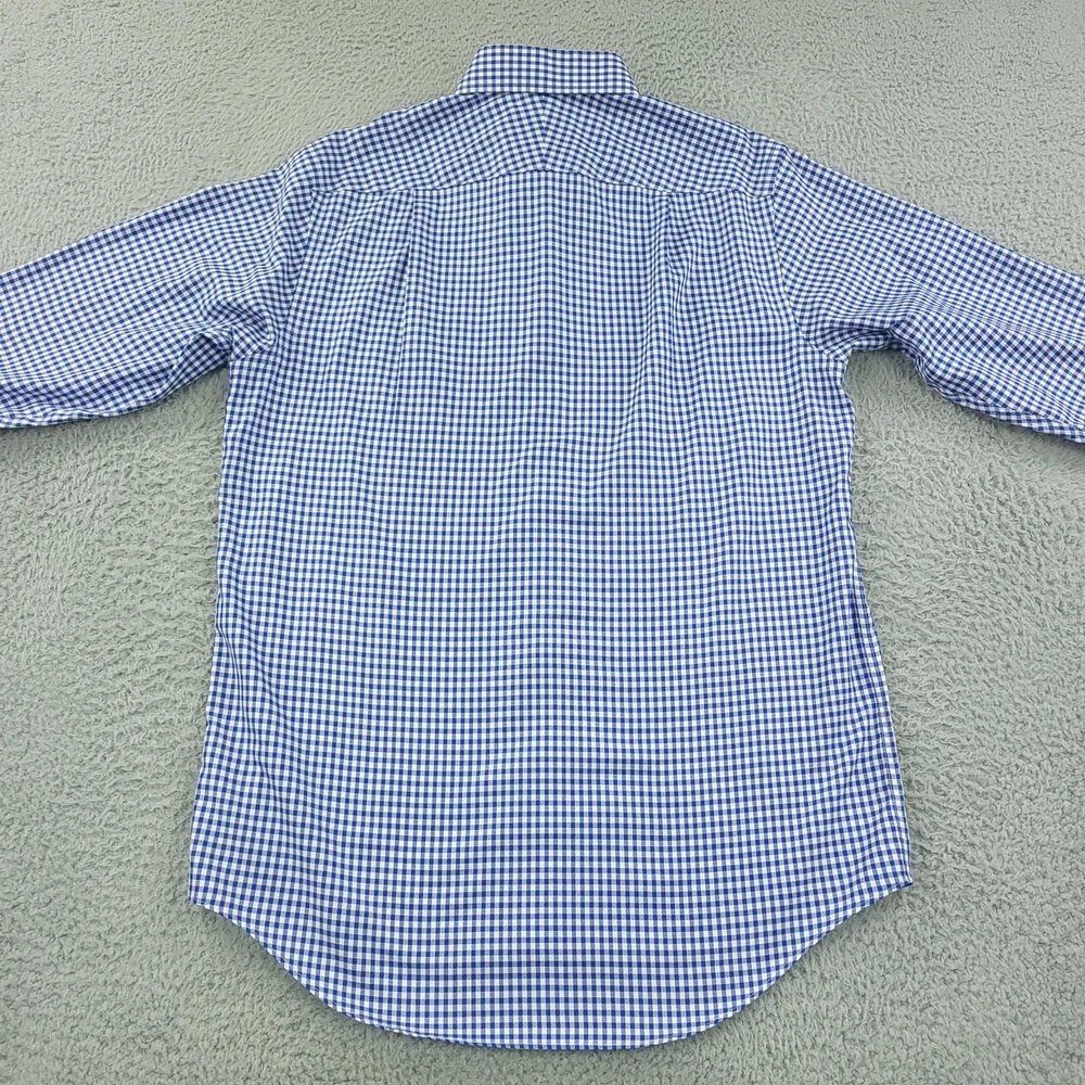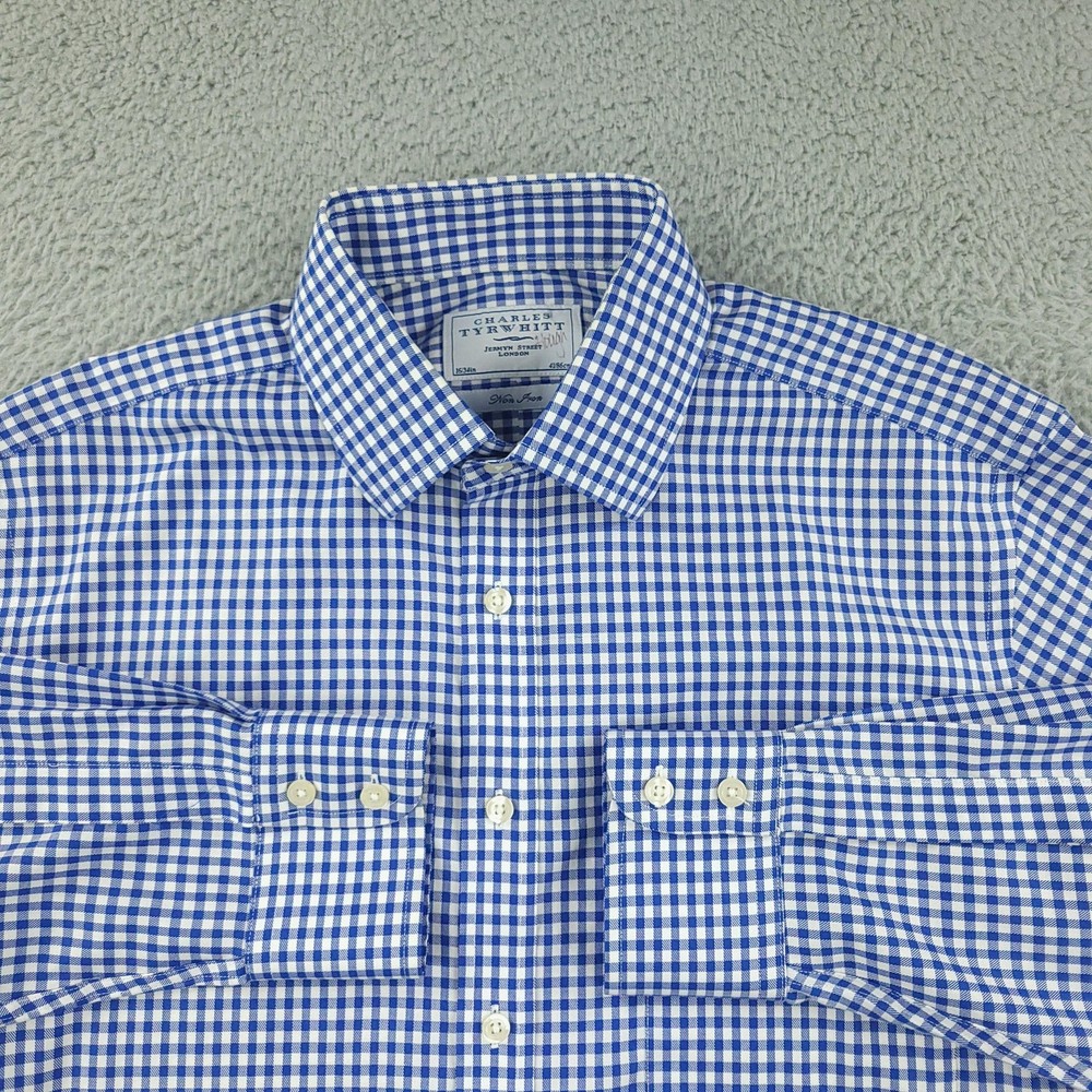 Charles Tyrwhitt Dress Shirt Mens 16 Blue Gingham Non Iron Cotton Brand: Charles Tyrwhitt Jermyn Street London. Style: Mens long-sleeve dress shirt with blue and white gingham check pattern. Size 16 Material: 100% cotton Details: Spread collar, full button front with white buttons, single left chest pocket, barrel cuffs with two-button adjustment and sleeve placket buttons, back yoke with side pleats, and curved shirttail hem. Special note: Handwriting present on the inner neck label as shown in photos. Measurements are included in the photos, compare measurements with your item to ensure proper fit. Items are added daily click here to Visit My Store Combined shipping for US customers is 1.99 for each additional item Items are cleaned per eBay standards & policies