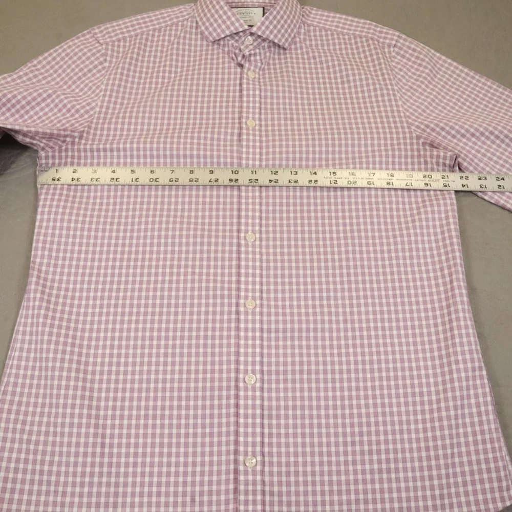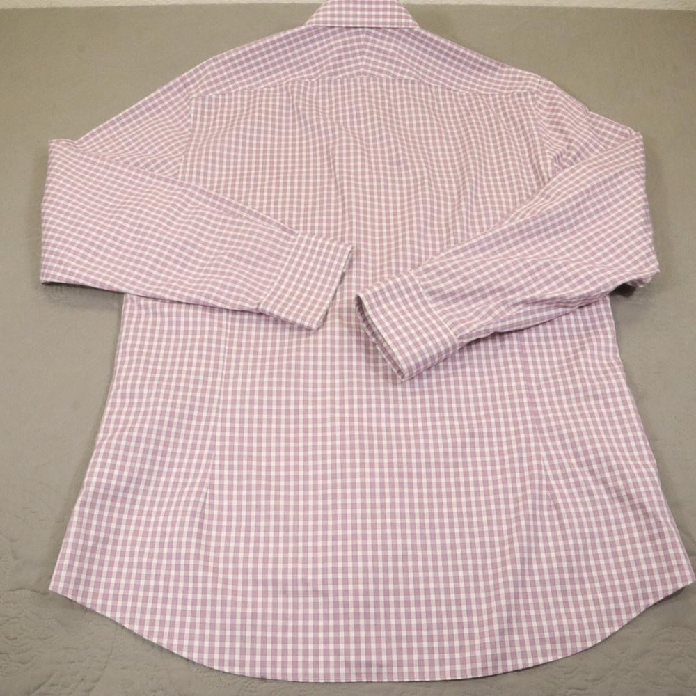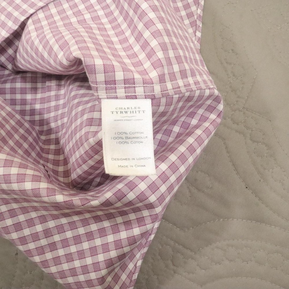 Brand: Charles Tyrwhitt Style: Mens long sleeve extra slim fit dress shirt with spread collar, button front, barrel cuffs, and curved shirttail hem. Color/Pattern: Purple and white gingham check pattern with white buttons for a sharp, modern dress look. Material: 100% cotton non-iron fabric; designed in London and made in China. Tag size: 16.5 neck, 34/35 sleeve (Extra Slim Fit, Non-Iron).