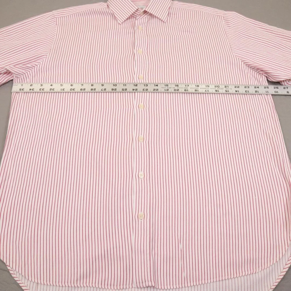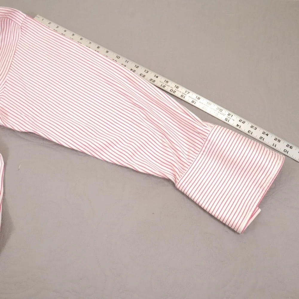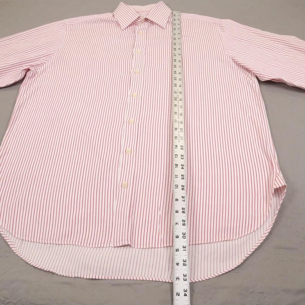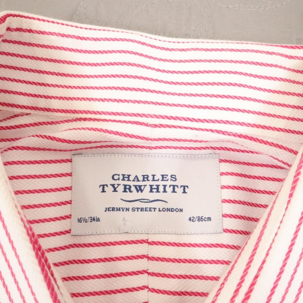 Brand: Charles Tyrwhitt. Style: Mens classic fit long sleeve striped dress shirt. Color: White with pink vertical stripe pattern. Size on tag: Mens 16.5 34in (16½/34, 42/86 cm). Material: 100% cotton twill.