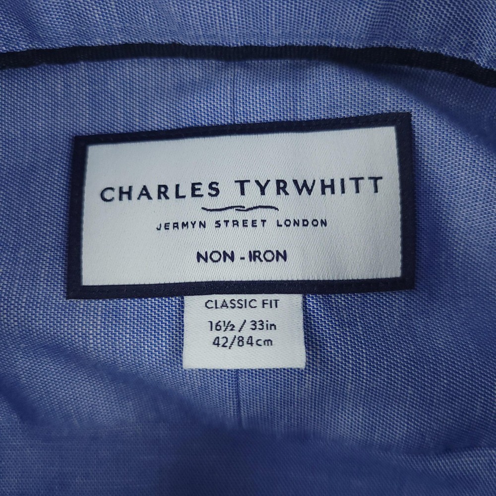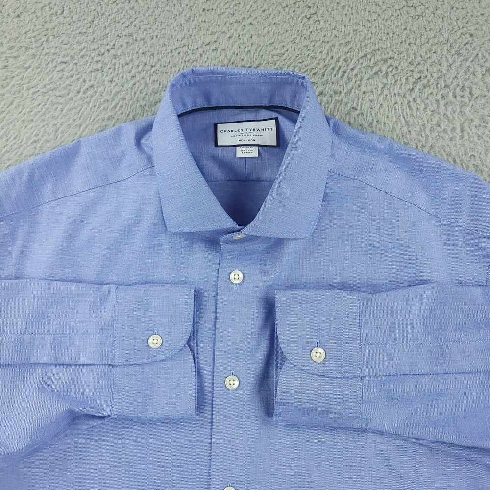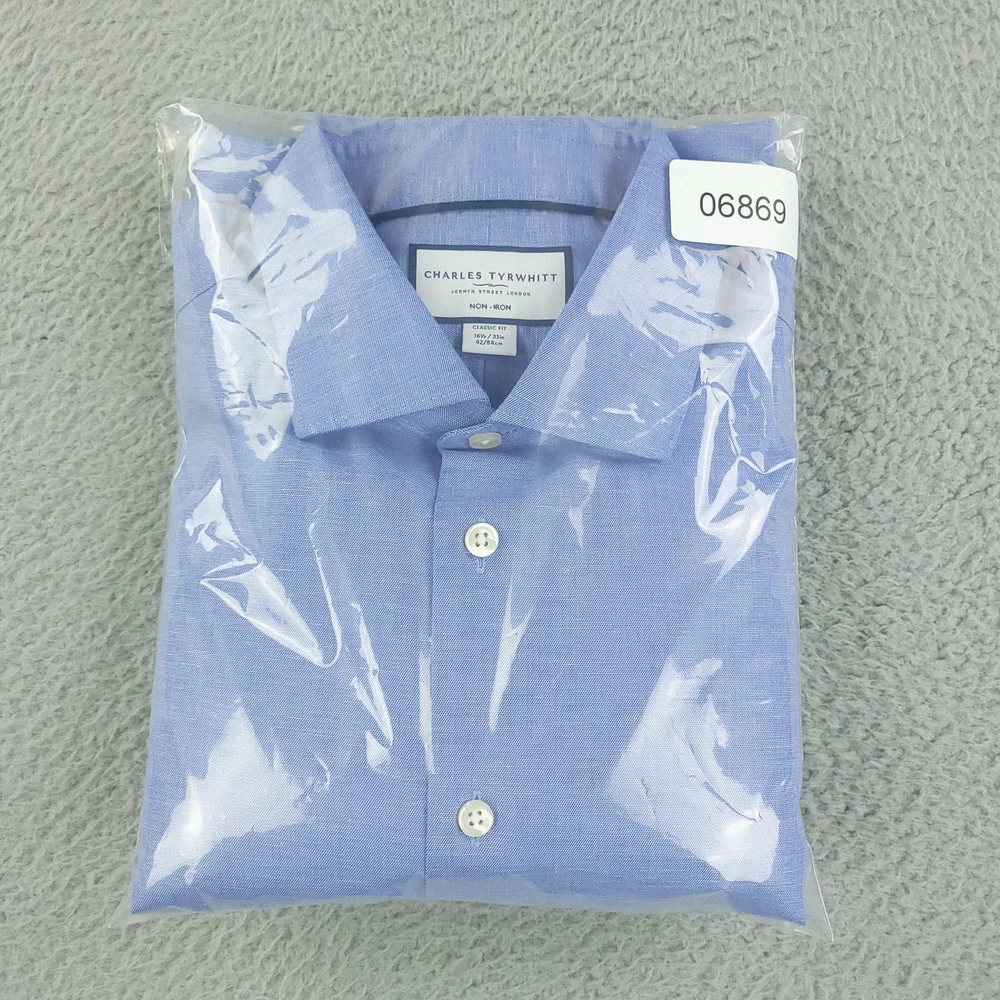 Brand: Charles Tyrwhitt Item: Mens long sleeve button-front dress shirt. Color: Light blue. Fit: Classic Fit with spread collar and single-button barrel cuffs. Fabric content (per tag): 89% cotton, 11% linen. Features: Non-iron fabric, collared neckline, button front closure, curved hem. Size on tag: 16½ in neck / 33 in sleeve (42/84 cm). Designed in London; made in China. Washed and dried with Fragrance Free Detergent & Dryer Sheets. Measurements are included in the photos, compare measurements with your item to ensure proper fit. (Measurements are done with the item lying flat). I ship next business day and all items include tracking. Items are added daily to my store Visit My Store Buy More & Save! Combined shipping for US customers - $1.99 for each additional item (Add items to shopping cart and discounts will automatically calculate during checkout)