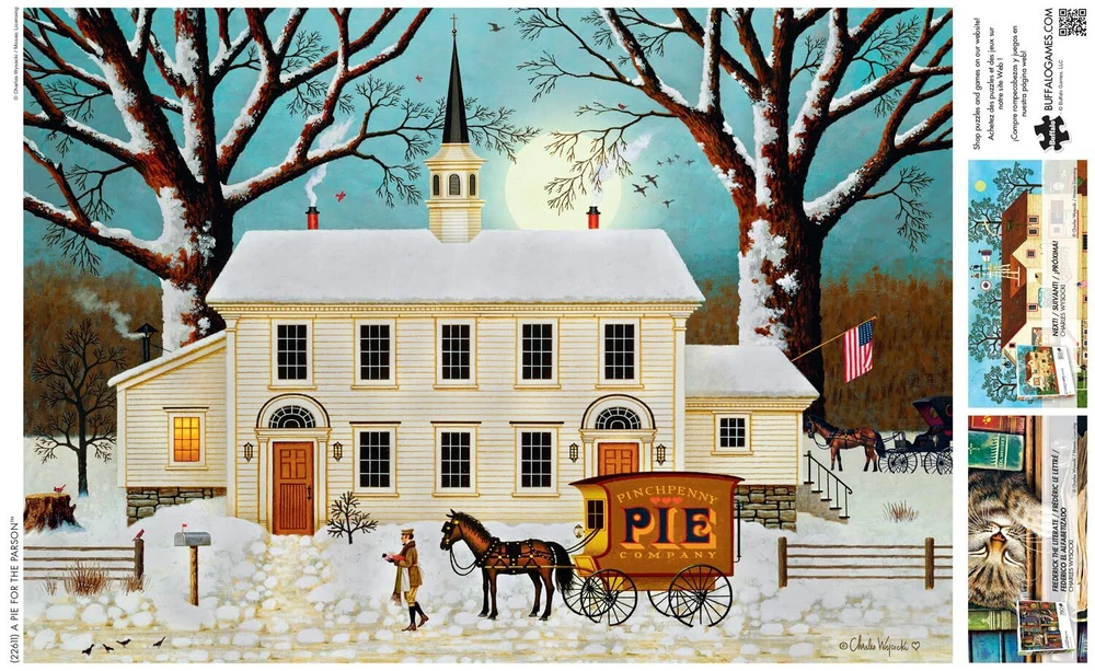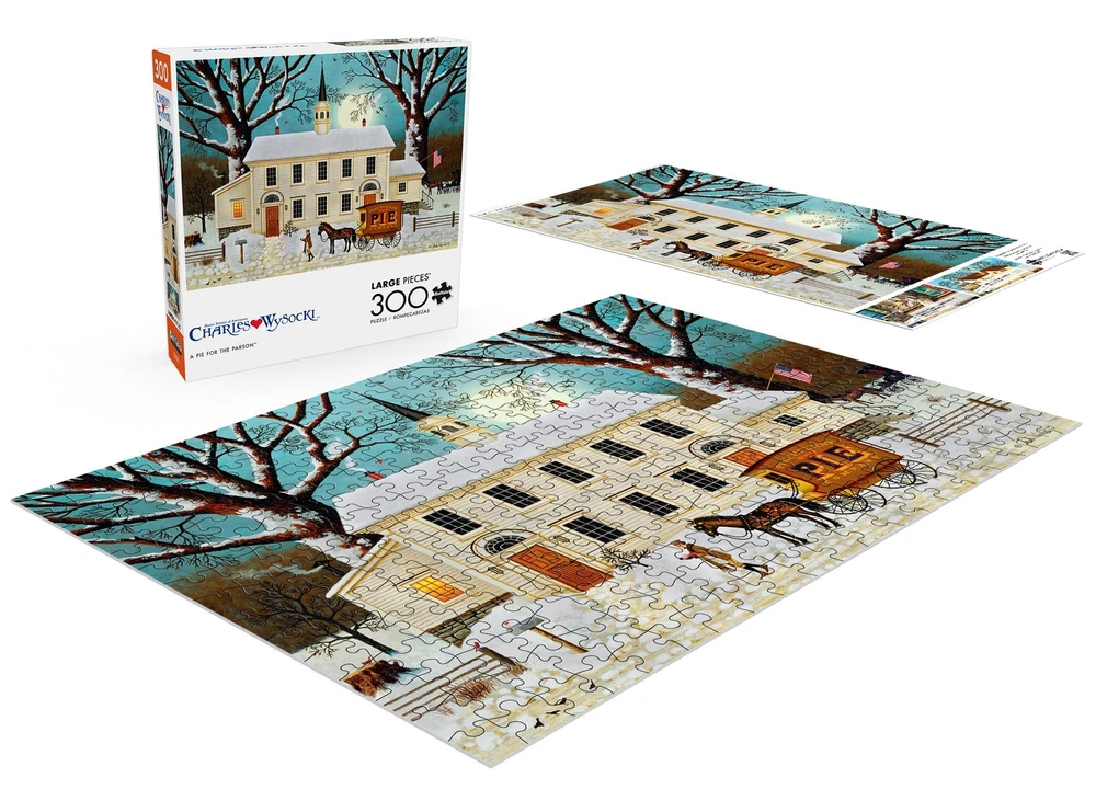This 300-piece jigsaw puzzle titled A Pie for the Parson” is based on the artwork of Charles Wysocki. Immerse yourself in the serenity of a white chapel nestled amidst a snowy landscape, complete with a horse-drawn carriage filled with delicious pies waiting to be enjoyed. For more than 40 years Charles Wysocki enjoyed his love affair with life and Americana, and through his imaginative and colorful artwork, touched the hearts of millions worldwide. "Chuck" felt a special kinship with puzzlers who share in the creative process by building his paintings one piece at a time. The pieces of this puzzle are 67% larger than traditional puzzle pieces, which makes them easier to see and hold for a pleasant puzzle experience. Every Buffalo Games jigsaw puzzle is manufactured from recycled puzzle board. A precision cutting technique guarantees that every piece will fit soundly with the company's signature Perfect Snap™. A bonus puzzle poster is also included so that you have a handy reference of what the completed puzzle should look like while you put yours together. 300 PIECE JIGSAW PUZZLE – This 300-piece jigsaw puzzle is the perfect level of challenge. Measuring 7.94in. x 7.94in., this puzzle is a great single evening activity for the entire family, friend group or yourself. For adults ages 14 and up. HIGHEST QUALITY MATERIALS – The puzzle pieces are thick and sturdy, and the back sides are a white matte finish. APEX PUZZLE IMAGERY - Relax and enjoy the puzzling process while “traveling” to some of the most beautiful, bucket-list places, Or join in the fun with our portfolio of licensees, or finish in style with world renown artists. FULL COLOR BONUS POSTER - Every Buffalo Games puzzle includes a full color poster to reference while assembling your puzzle. Or, for a real challenge, try to solve without the poster in hand! PERFECT GIFT - Puzzles are not only great gifts for any and all occasions including birthdays, holidays, housewarming parties or even just a fun night in with friends.