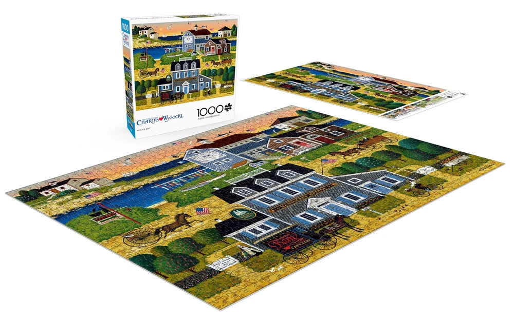 This 1000-piece jigsaw puzzle titled “Witch’s Bay” is based on the artwork of Charles Wysocki. The detailed coastal landscape in this scene boasts a grand "Nantucket Breeze" house, acting as a focal point amidst quaint homes, and rustic carriages traveling along the roads. In the distance, sailboats drift lazily in the bay, while seagulls soar in the golden sky. For more than 40 years Charles Wysocki enjoyed his love affair with life and Americana, and through his imaginative and colorful artwork, touched the hearts of millions worldwide. "Chuck" felt a special kinship with puzzlers who share in the creative process by building his paintings piece at a time. Every jigsaw puzzle is manufactured from recycled puzzle board. A precision cutting technique guarantees that every piece will fit soundly with the company's signature Perfect Snap™. A bonus puzzle poster is also included so that you have a handy reference of what the completed puzzle should look like while you put yours together. 1000 PIECE JIGSAW PUZZLE – This 1000-piece jigsaw puzzle is the perfect level of challenge. Measuring 7.94in. x 7.94in., this puzzle is a great single evening activity for the entire family, friend group or yourself. For adults ages 14 and up. HIGHEST QUALITY MATERIALS – The puzzle pieces are thick and sturdy. Our puzzles are cut with premium dies for laser precision. APEX PUZZLE IMAGERY - Relax and enjoy the puzzling process while “traveling” to some of the most beautiful, bucket-list places, Or join in the fun with our portfolio of licensees, or finish in style with world renown artists. FULL COLOR BONUS POSTER - Every puzzle includes a full color poster to reference while assembling your puzzle. Or, for a real challenge, try to solve without the poster in hand! PERFECT GIFT - Puzzles are not only great gifts for any and all occasions including birthdays, holidays, housewarming parties or even just a fun night in with friends.