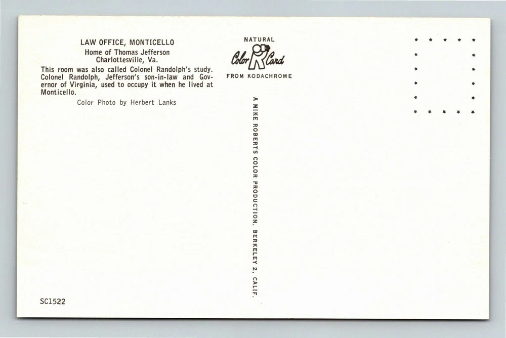 Charlottesville VA-Virginia Law Office Monticello Jefferson Vintage Postcard