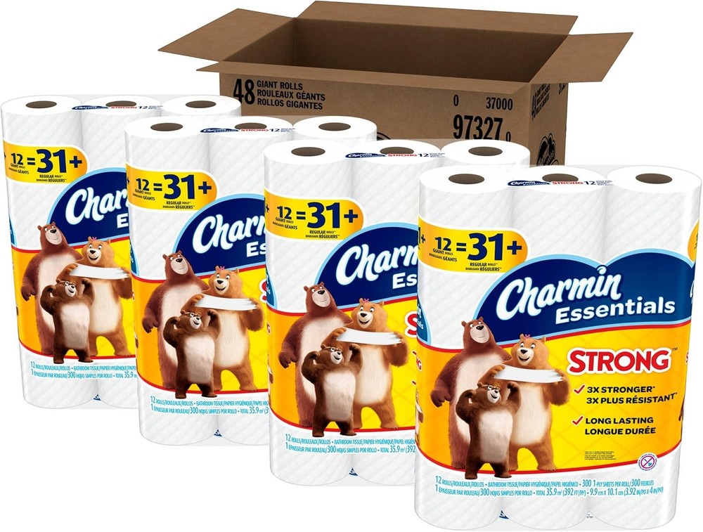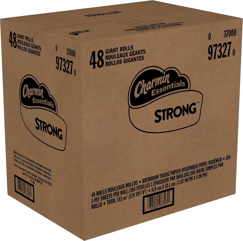 The item was shipped through US Stock, so it arrived faster than expected All items are brand new and unopened, 100% authentic, 24 hours message reply Charmin Essentials Strong Toilet Paper, 1-Ply, Giant Rolls, 48 Count Brand :Charmin Special Feature: Clog Free, Septic Safe Unit Count: 14400 Count Material :Paper Sheet Count: 14400 Ply Rating :1-Ply Recommended Uses For Product :Bath Material Feature: Septic safe Color :Original Version Item Form: paper About this item ack contains 48 Giant Rolls (300 sheets per roll) of Charmin Essentials Strong bulk toilet paper Charmin's strongest 1 ply toilet paper Clog safe and septic safe; Roto Rooter approved 3X stronger when wet vs. the leading bargain brand 1 case contains 48 Giant Rolls for your bulk toilet paper buy