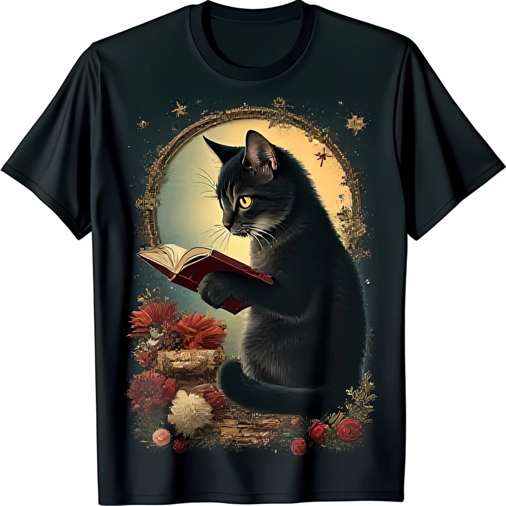 Charming Black T-Shirt with Black Cat & Yellow Eyes Reading a Book in Floral