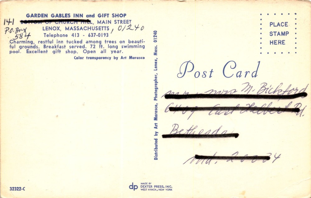 MAKE AN OFFER. THE MORE YOU BUY THE BETTER DEAL I WILL ACCEPT The postcard advertises the Garden Gables Inn and Gift Shop located in Lenox, Massachusetts. The inn is described as charming and restful, nestled among trees on beautiful grounds. It offers breakfast service and features a 72-foot long swimming pool. The inn also has an excellent gift shop and is open all year round.