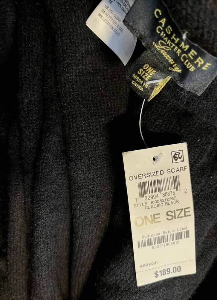 Item Length: 74 in Features: Multifunctional gtin13: 732994888752 Brand: Charter Club Department: Women Type: Shawl/Wrap Handmade: No Country/Region of Manufacture: Unknown Accents: Cashmere Style: Pashmina Garment Care: Dry Clean Only Vintage: No Material: Cashmere UPC: 732994888752 Item Width: 36 in Color: Black Season: Fall, Spring, Summer, Winter Personalize: No Theme: Designer Fabric Type: Knit Pattern: Solid Character: Cashmere
