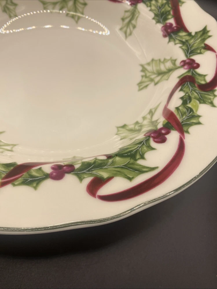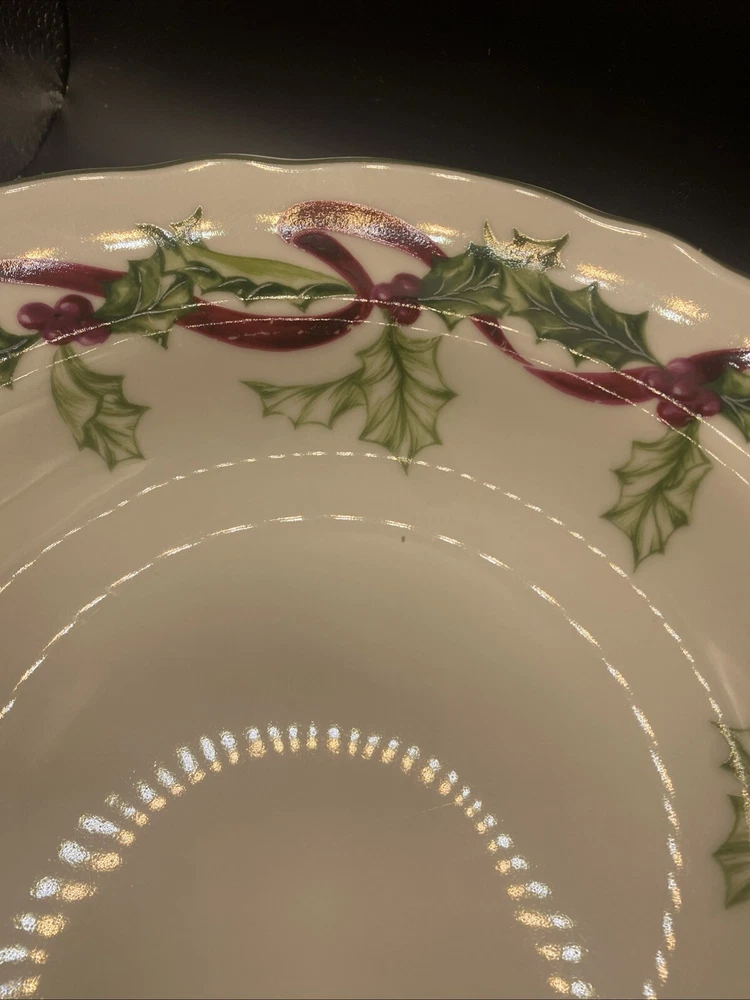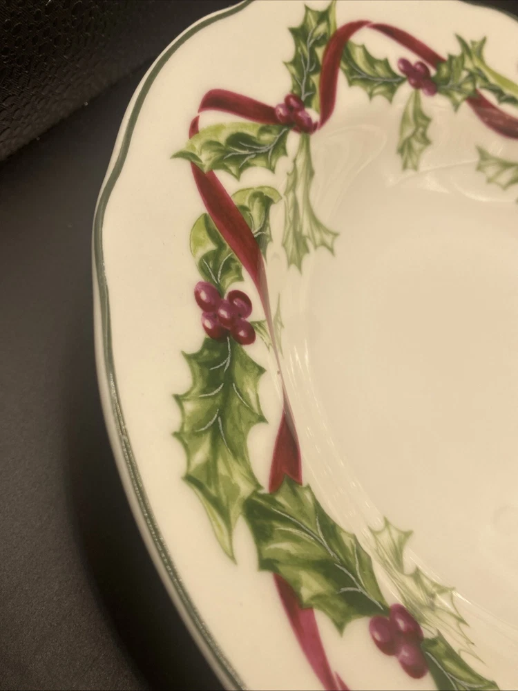 Add a touch of elegance to your holiday table with this Charter Club China Winter Garland rimmed pasta bowl. The intricate Holly and Ribbon pattern is a classic design that will complement any Christmas theme. Made in Indonesia, this bowl is perfect for serving soup or pasta and is a great addition to your dining collection. Crafted from high-quality china, this bowl is a vintage piece from the 1990s and features a Tiffany-style theme. The art pottery production style and technique make it a unique and beautiful piece. This set includes one pasta bowl and is a part of the Winter Garland product line.