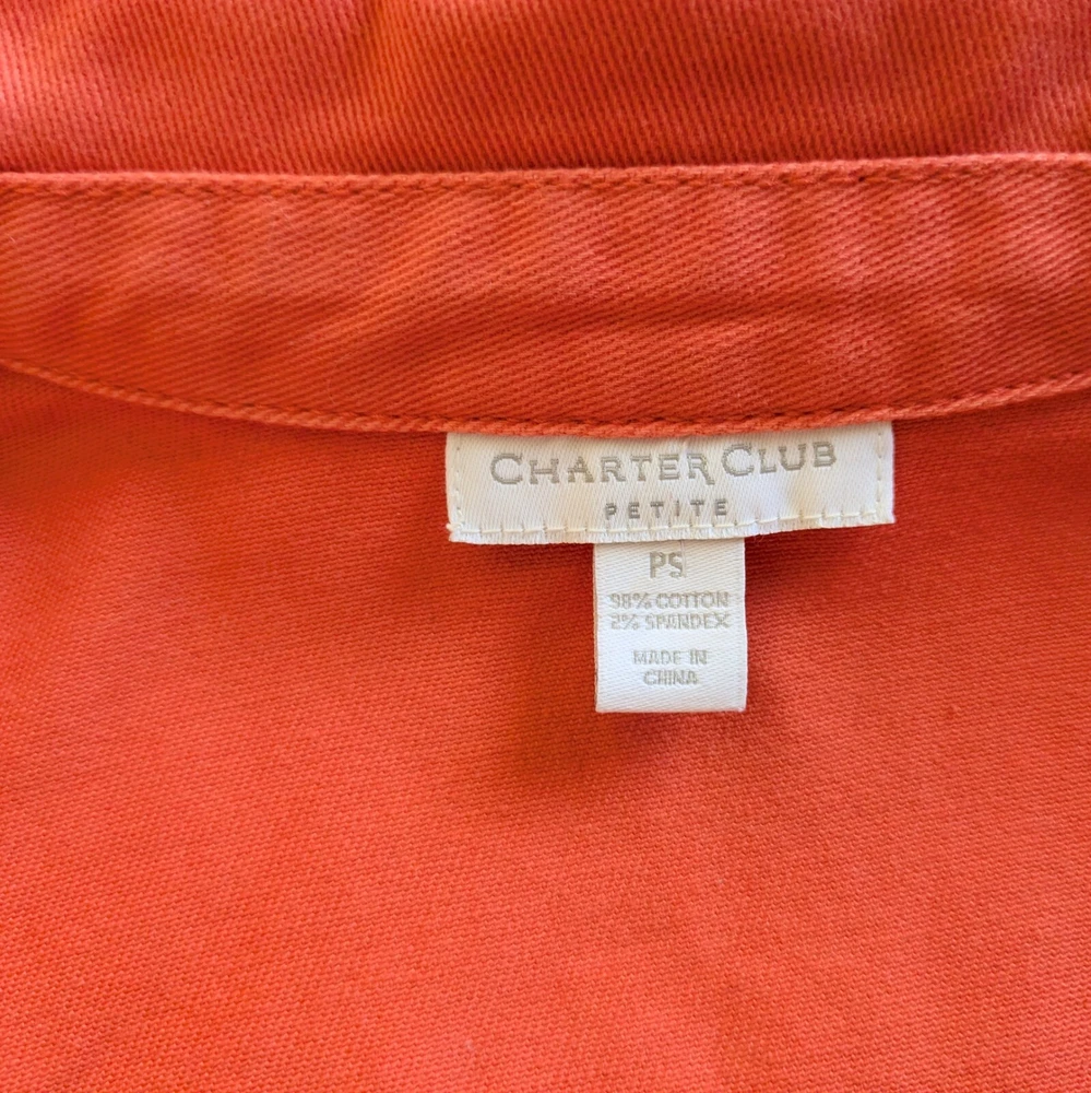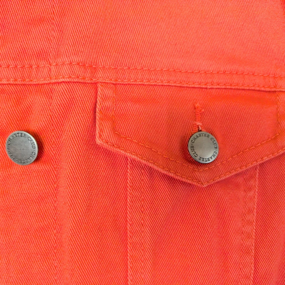 Charter Club Denim Jacket Orange/Coral Size Petite Small Classic Casual Excellent condition. No flaws 90's style classic denim jacket with grommet buttons Great for casual wear or to elevate any outfit to classic styling Beautiful orange/peach color. Measurements: 18 inches across chest 22 inches from should to hem