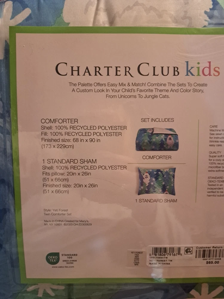 This Charter Club Kids 2 Piece Twin Snow Man Themed Comforter Set features a winter theme with a multicolor design. The set includes a comforter and pillow sham, both made of polyester fill material. It is designed for children and has a contemporary style, perfect for adding a holiday touch to a bedroom.