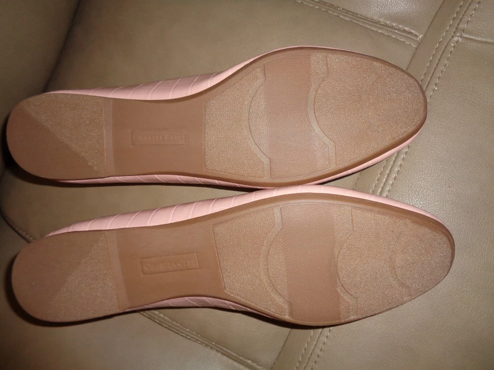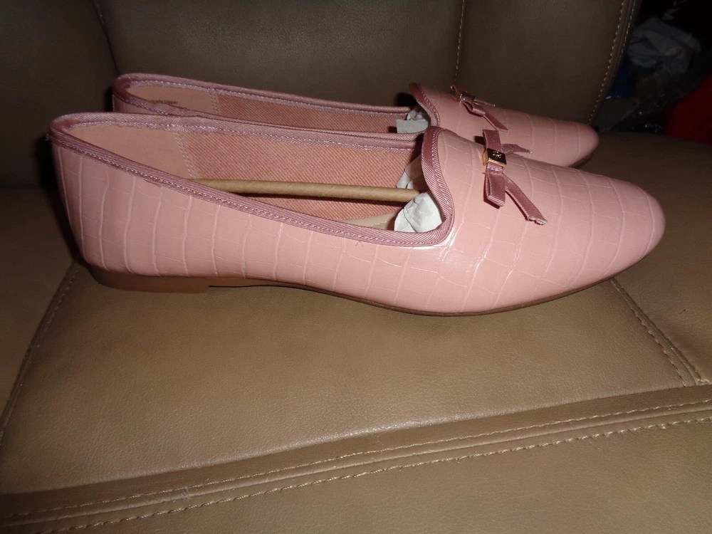 Charter Club Kimii Blush Pink Croc Embossed flats are women's shoes in size 11 medium. They are designed for various occasions like travel, party, casual wear, work, or business. The flats feature a cushioned insole and are made of faux leather with a fabric lining. The outsole material is synthetic, giving the shoes a stylish yet comfortable appeal. Retail $59.50 Any questions? Please ask.
