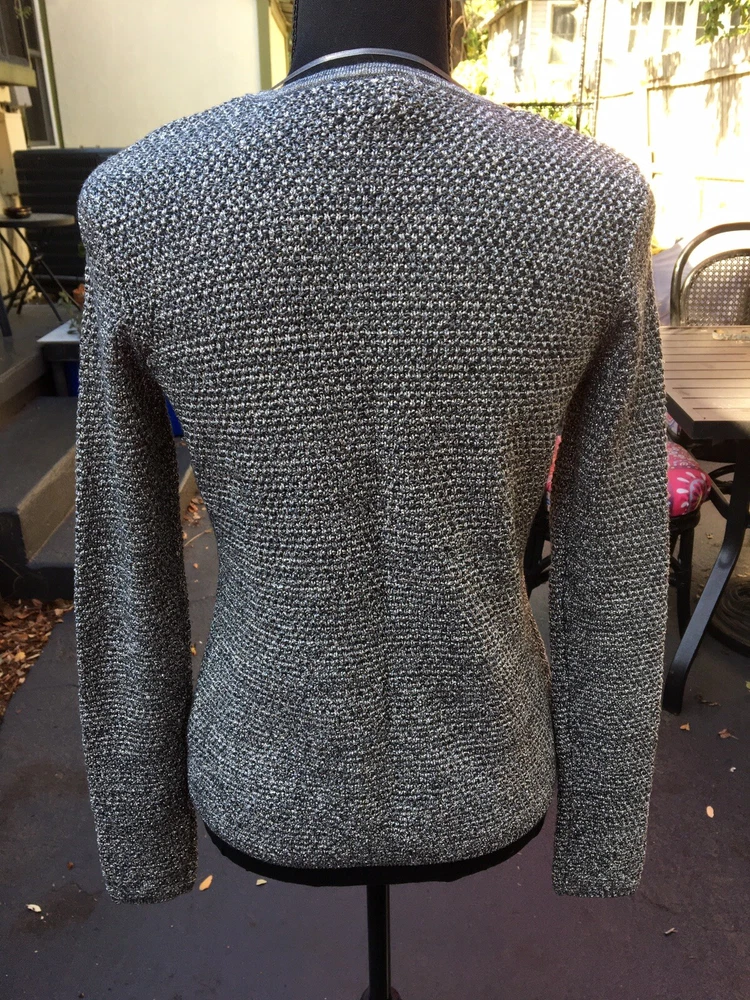 This Charter Club sweater is a stunning addition to any wardrobe, with its metallic silver and gray cotton fabric knit in a solid pattern. The long-sleeve cardigan has a round neckline and hook and eye closure accents. It's perfect for formal occasions, weddings, or cocktail parties, and the reflective material makes it a great choice for all seasons. The sweater fits regularly and is available in size P/P for petites. The brand is well-known for its quality and style, and this sweater is no exception. 51% cotton, 32% polyester and 11% metallic. 34” chest, 31” waist, 22” from shoulder to hem and 24.5” sleeves. Hook and eye closure.