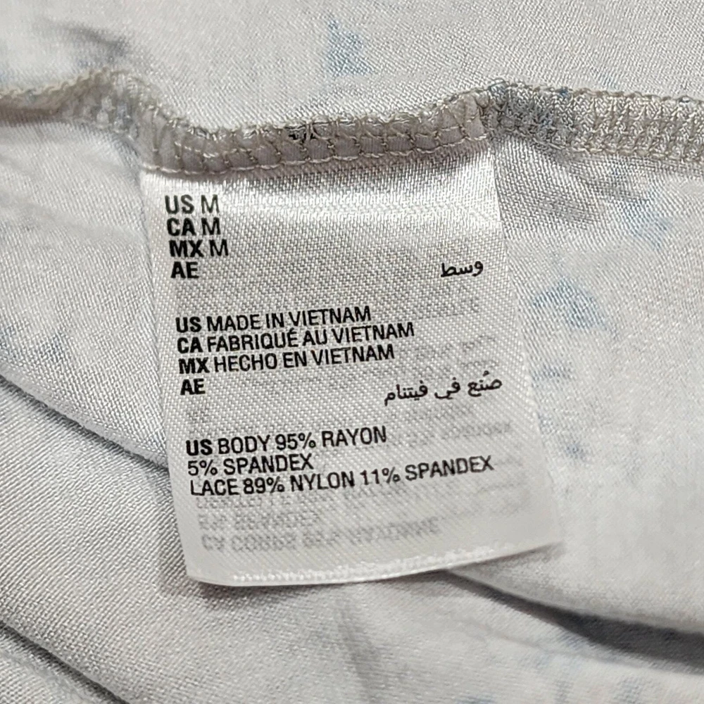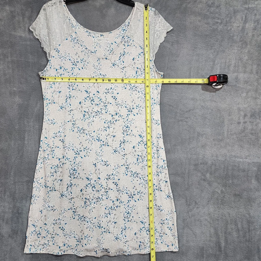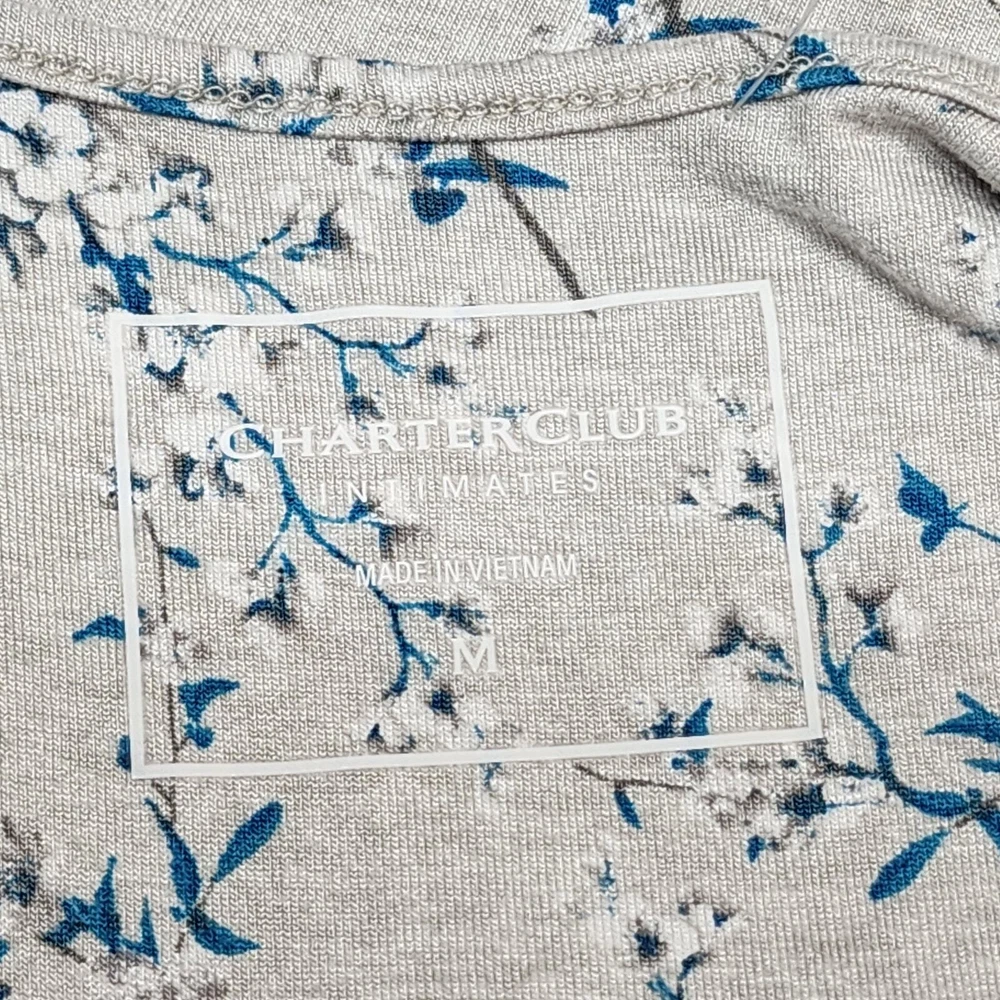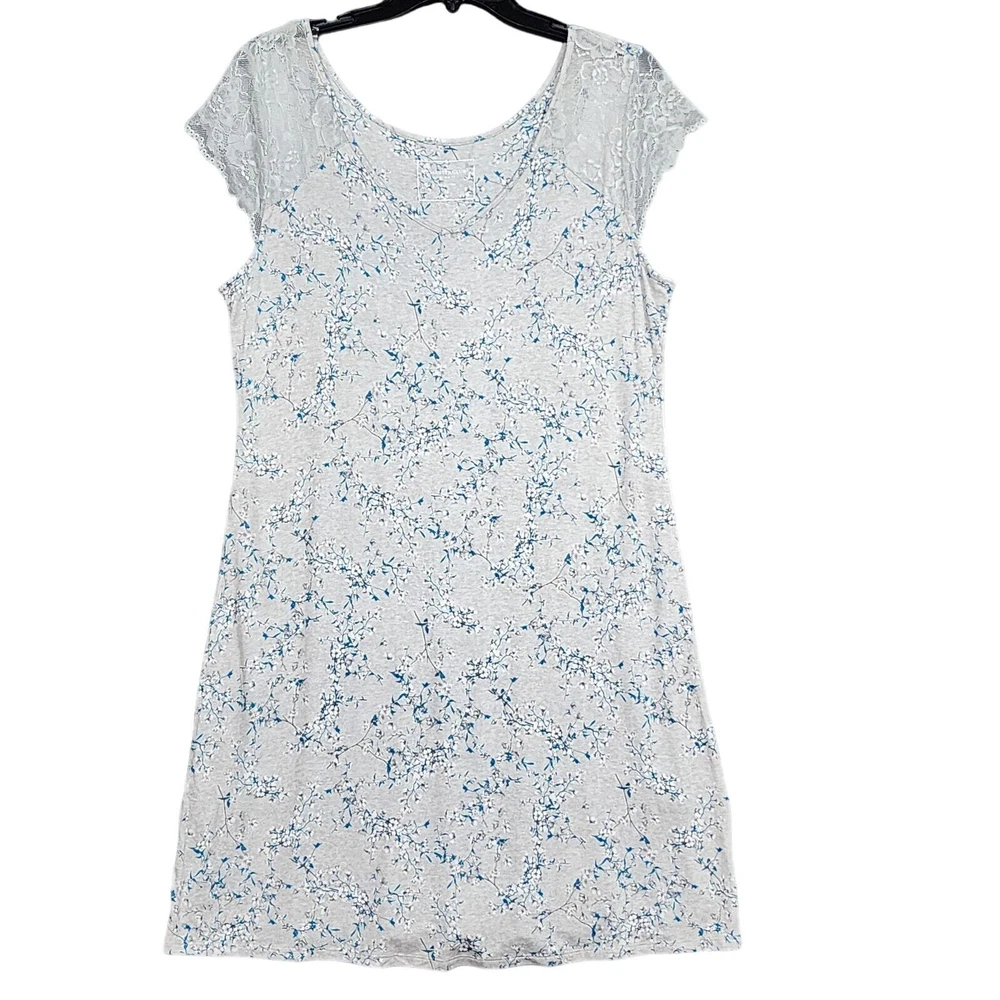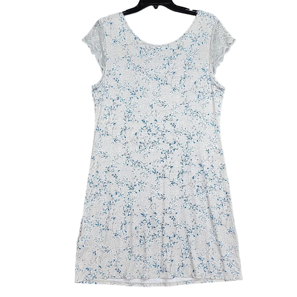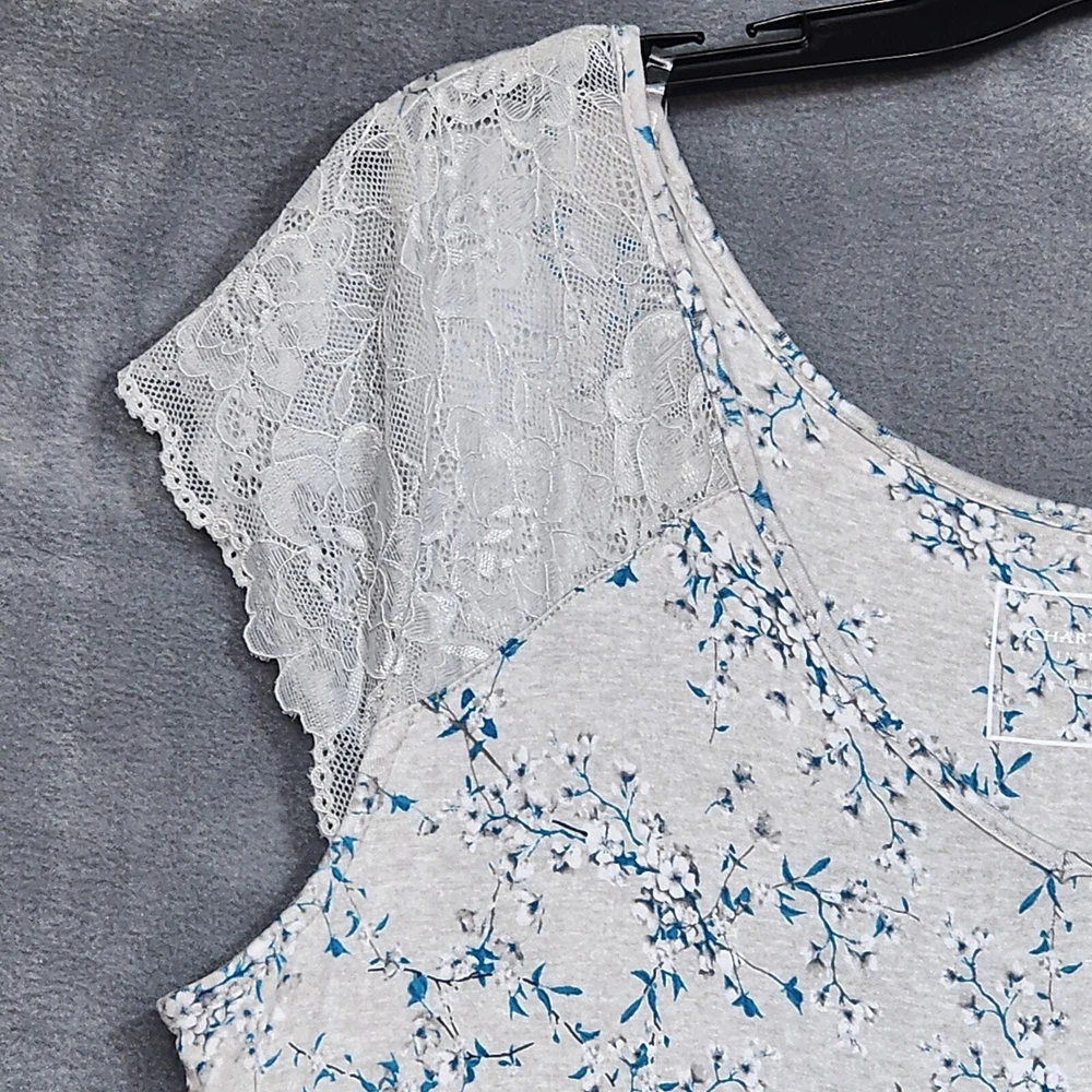 Charter Club Nightgown Lace Trim Floral Gray Print Pajamas Medium Soft, light weight Rayon spandex blend fabric Short Lacy sleeves Hits about knee length, depending on your height New with no tags. Inv# 08-107