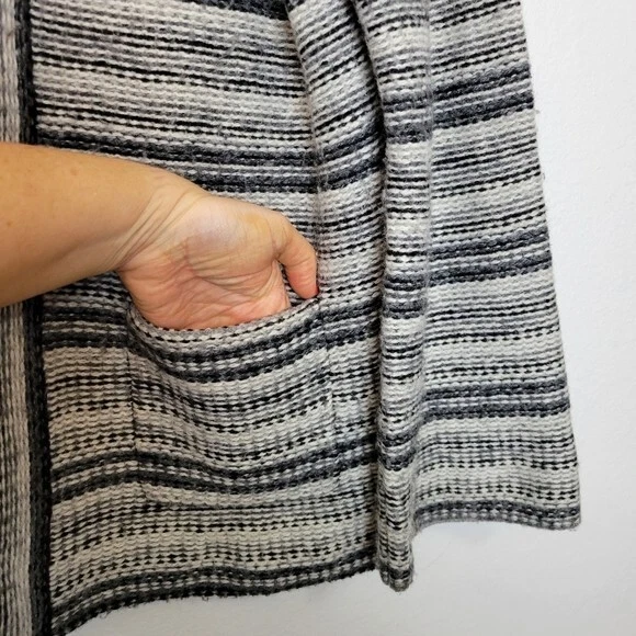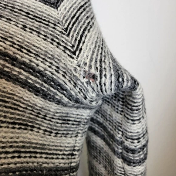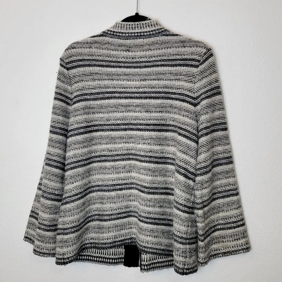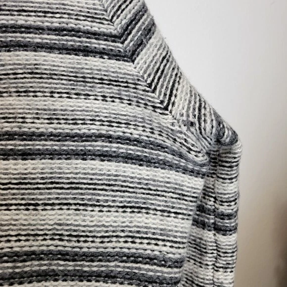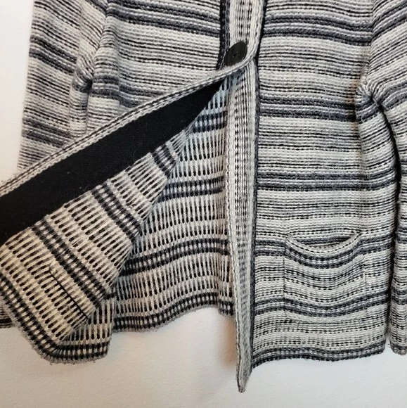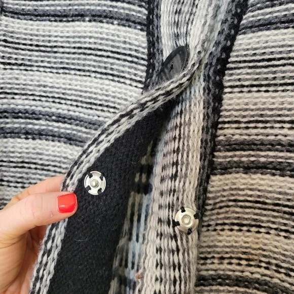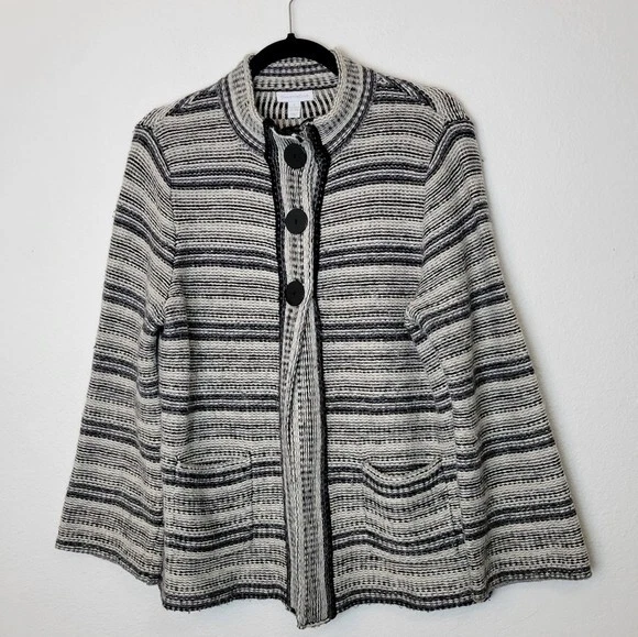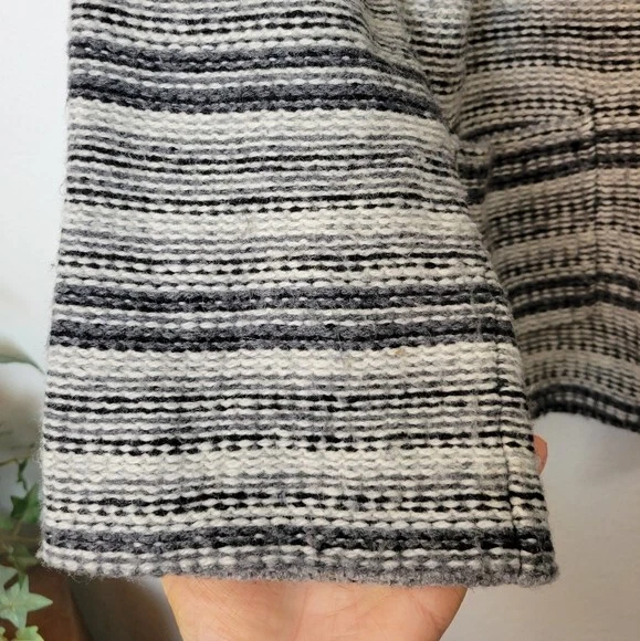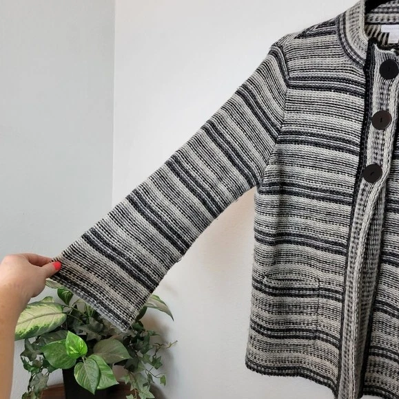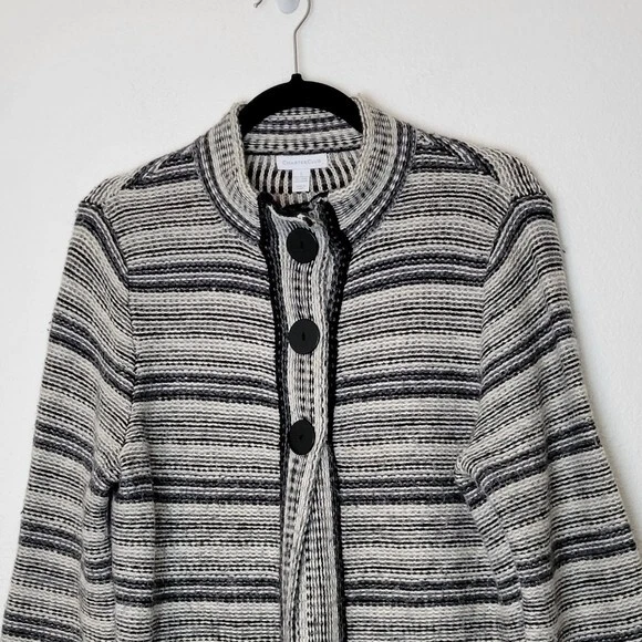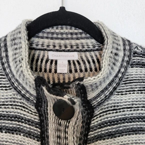 Charter Club Size L Black And White Striped Wool Blend Cardigan Sweater Pockets. Ships With USPS Mail -Warm and cozy striped cardigan sweater in a wool blend by Charter Club -Size Large -3 snap button closure -2 front pockets -50% acrylic 25% wool 25% nylon, soft midweight fabrication -Measurements are approximately 21 in armpit to armpit and 27 in long -Sweater has some minor fuzzies due to the fabric, small hole at the back of the right armpit but shouldn't be noticeable when worn, great pre-owned condition! ------------------------------------ Thanks for looking…have a GREAT DAY! @mandajane223