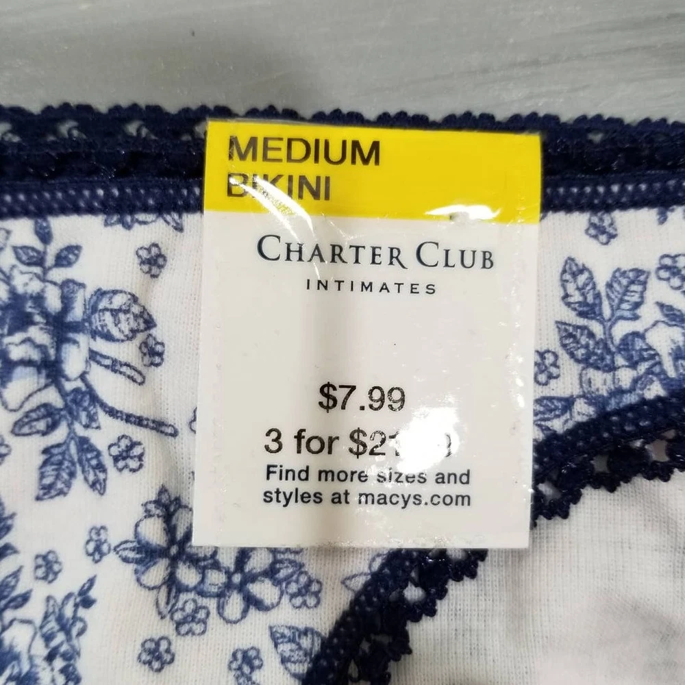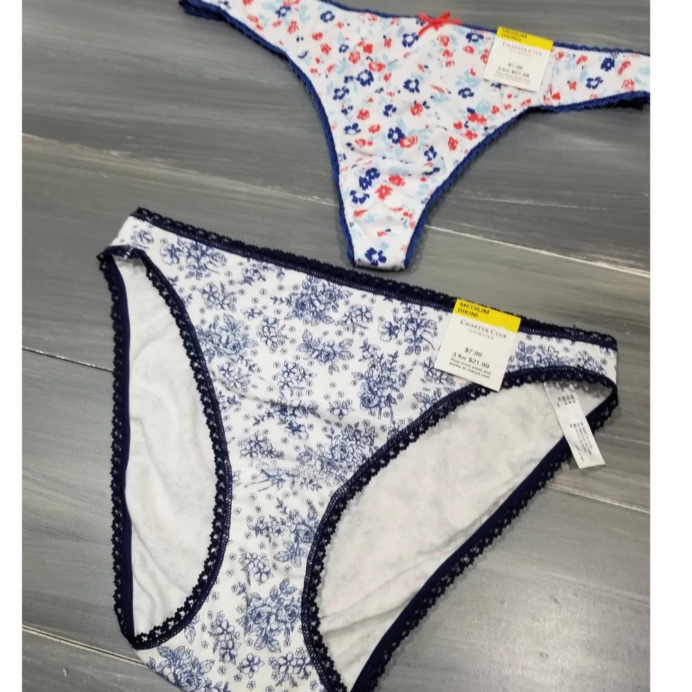 Charter Club 1 Thong, 1 Bikini, Size Medium Bikini 100% Cotton, Color: Angel White Thong 100% Cotton, Color: Blooming Flora New with tags. Paper hang tag may be torn or have tape or stickers attached/detached Inv: G208