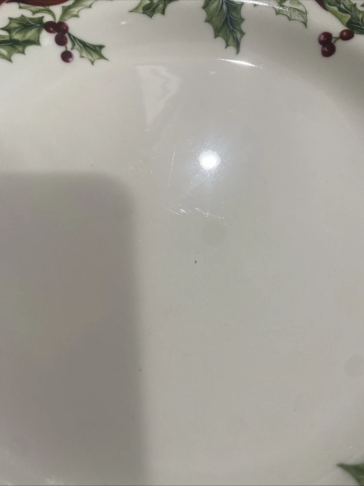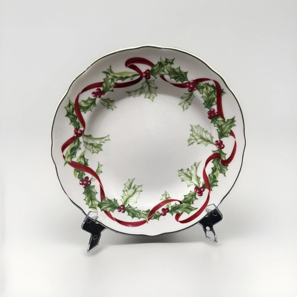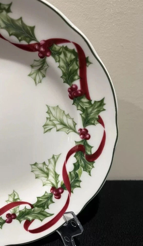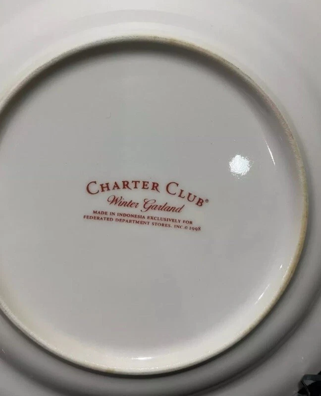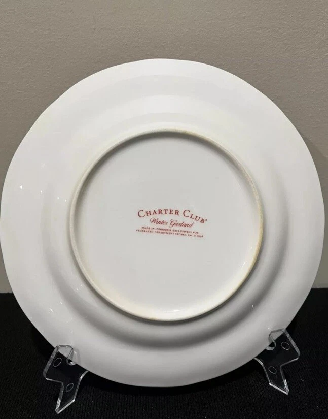 Add a touch of winter elegance to your dinner table with this beautiful Charter Club Winter Garden dinner plate. The plate features a Holly ribbon and berries design, perfect for a festive winter occasion. Made of high-quality ceramic material, this round plate has a glossy finish and is decorated with berries pattern. This original and vintage plate from 1998 is an art pottery production technique, with a printed backstamp. It is a contemporary style, decorative plate that is perfect for Christmas. The plate is from Indonesia and is a part of the Winter Garden product line. This plate is sure to impress your guests and make your dinner table look stunning.