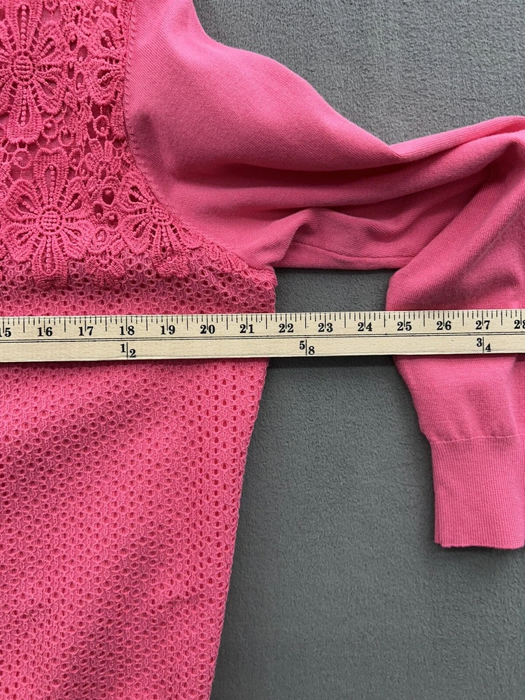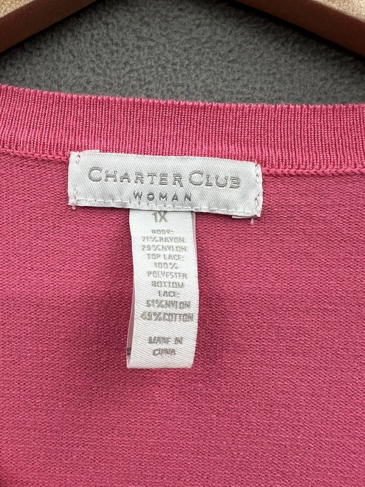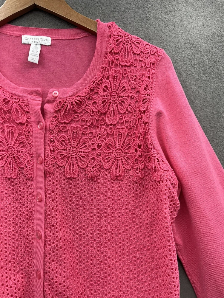 Elevate your wardrobe with this beautiful Charter Club cardigan in a lovely shade of pink. The sweater features a delicate floral lace overlay on a tight-knit design, giving it a sophisticated yet feminine look. With long sleeves and a round neckline, it is perfect for any occasion, be it casual or business. Crafted from a blend of polyester and rayon, this sweater is machine washable and easy to care for. The stretchy fabric ensures a comfortable and regular fit for plus-size women. Ideal for winter, fall, and spring, this sweater is a must-have for any fashion-forward woman.